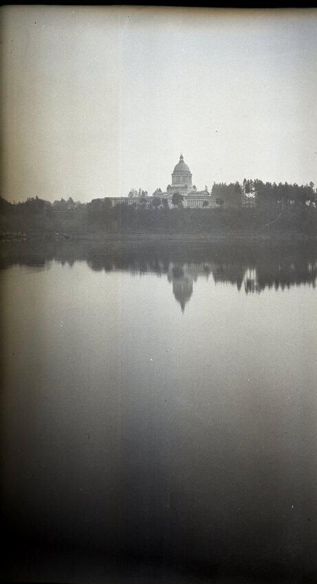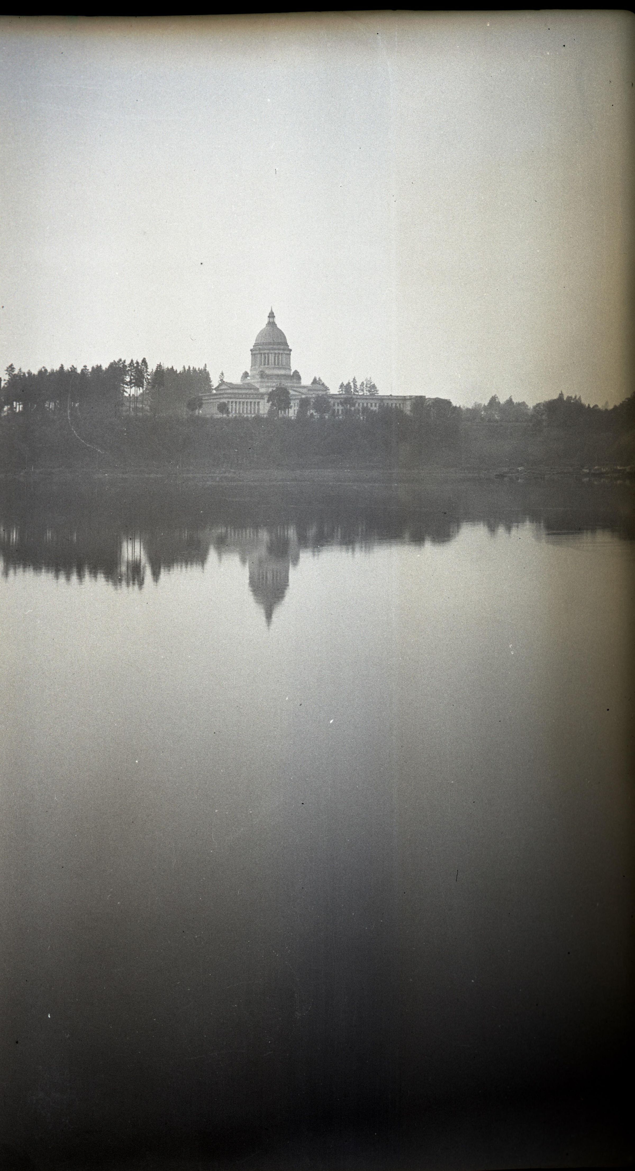 Black and white negtive of the Capitol group. In the foreground is the water of the Des Chutes River. In the background is the Legislative Building, some of the other state buildings, and trees. The trees and Capitol dome are reflected in the water. There is a white border on all sides, and in the bottom border is "Olympia #745 1936".