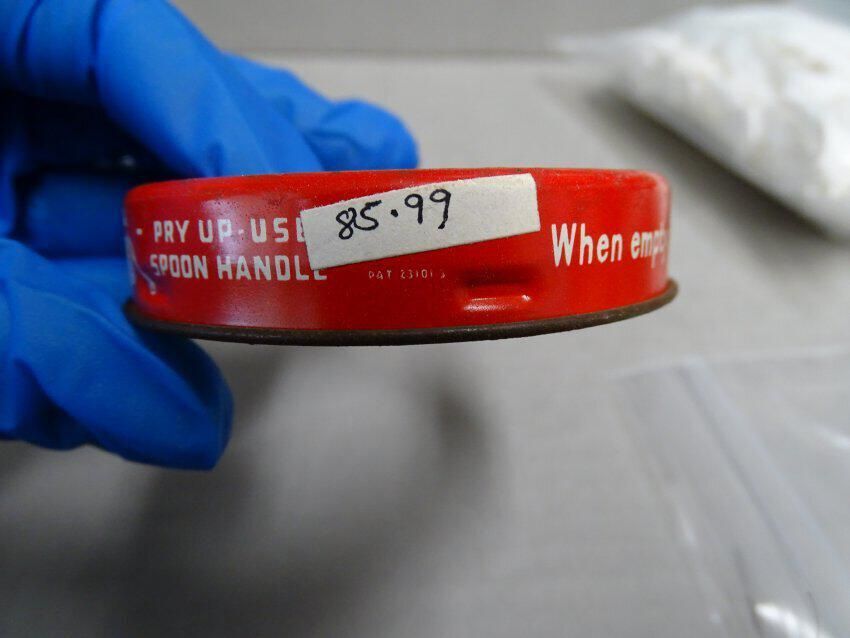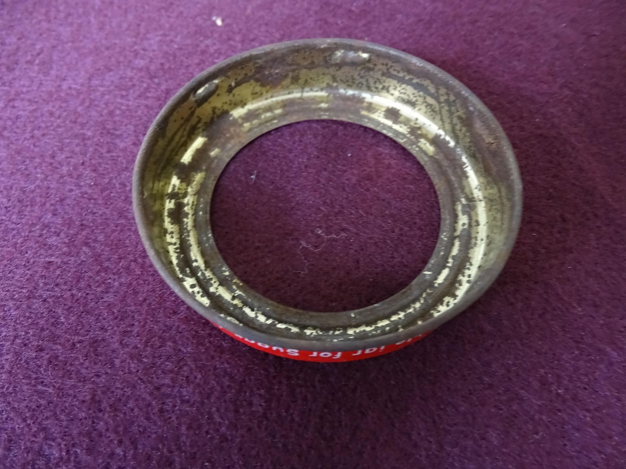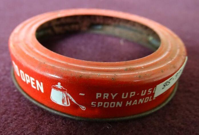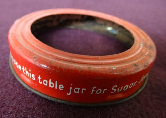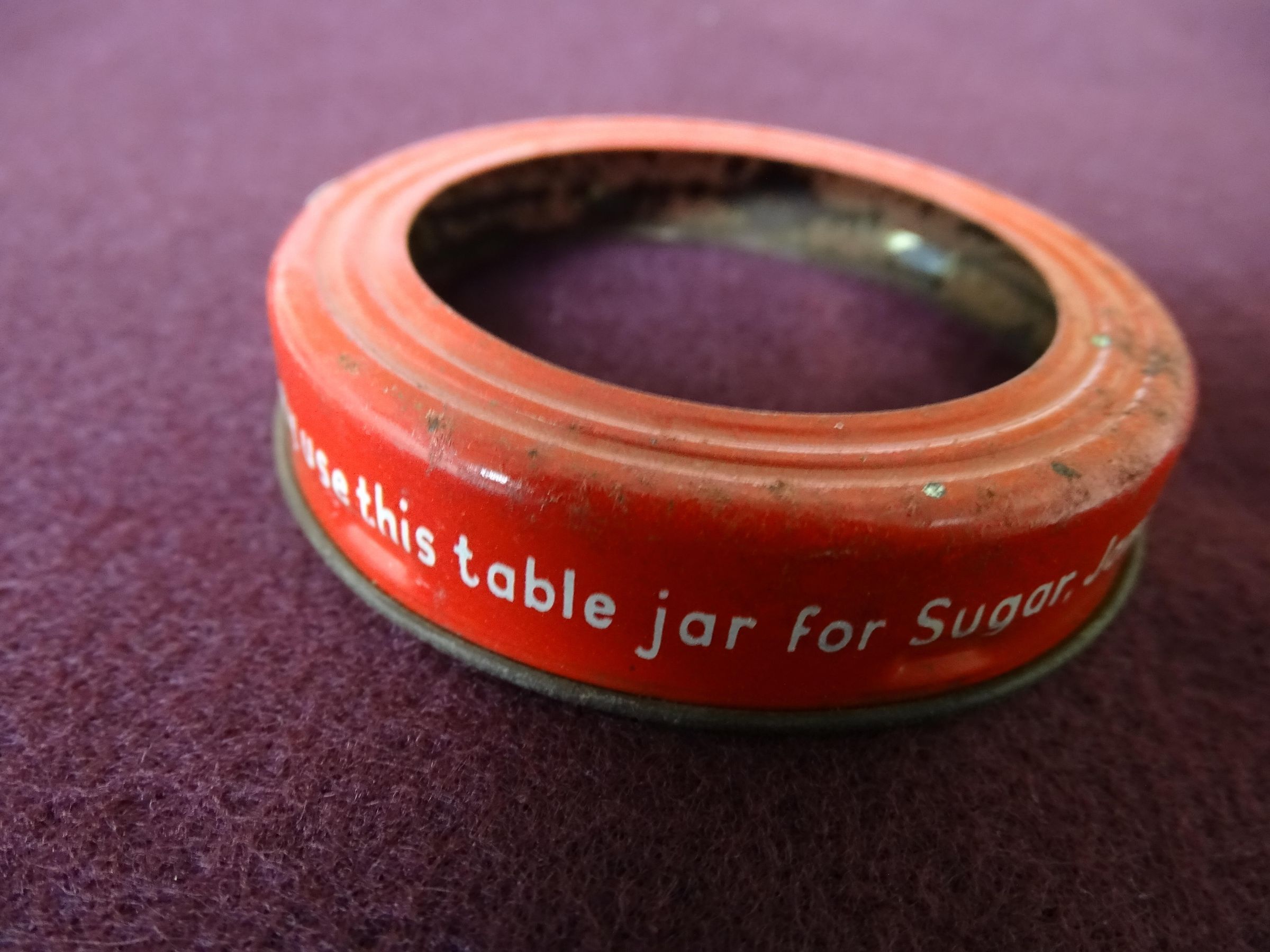 Gold-colored metal band painted red on the outside. White letters are printed on the red paint that say "To Open pry up using spoon handle. when empty use this table jar for Sugar, Jams, Jellies, Honey, Pickles" The band is intended to hold a metal lid onto a jar. The band does not have screw threads, but does have indentations for securing it to the jar.Lexicon