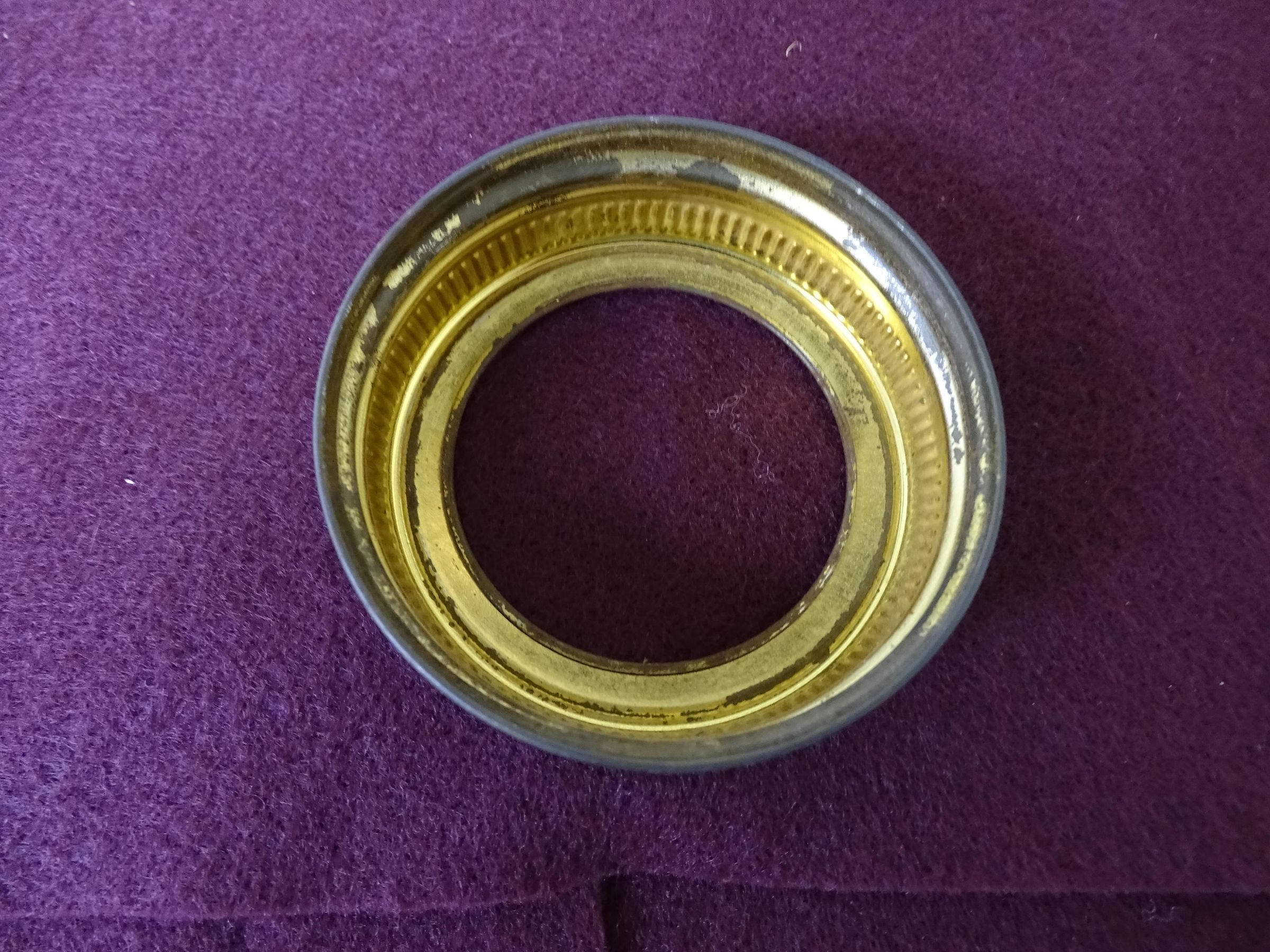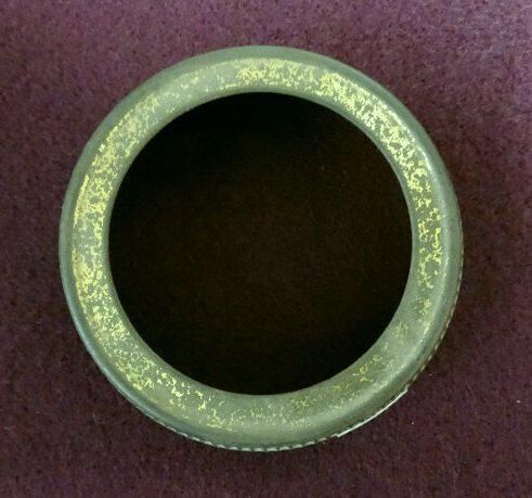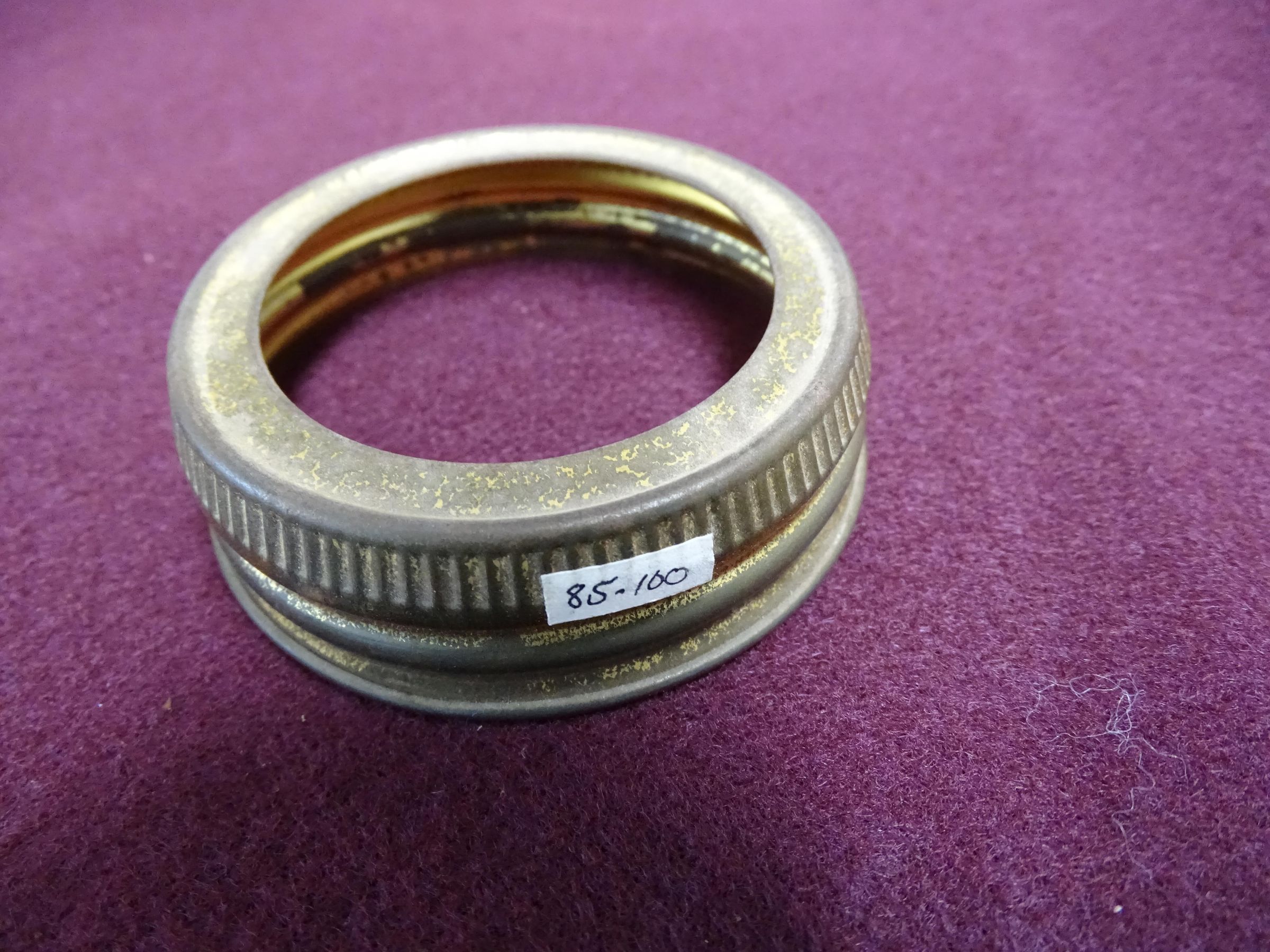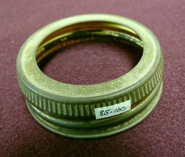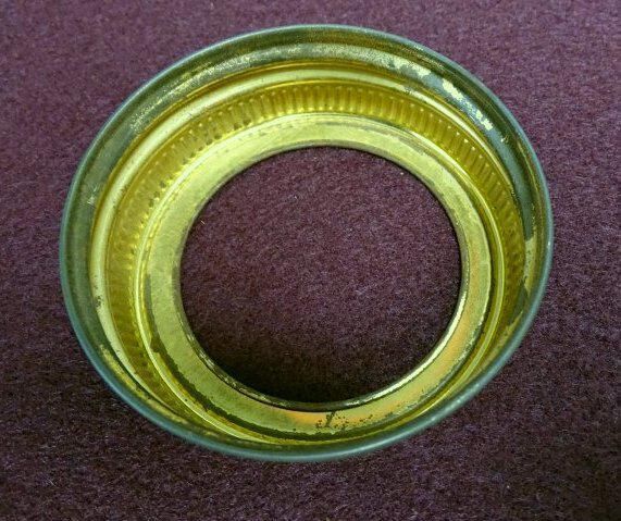 Gold-colored metal band with screw threads to secure a metal lid on a canning jar that has threads. This band is intended to be placed on the jar immediately after the jar is filled and a metal cap is placed on it, and after the jar cools and the lid "pops" the band is removed. The band is possibly brass or an alloy.Lexicon