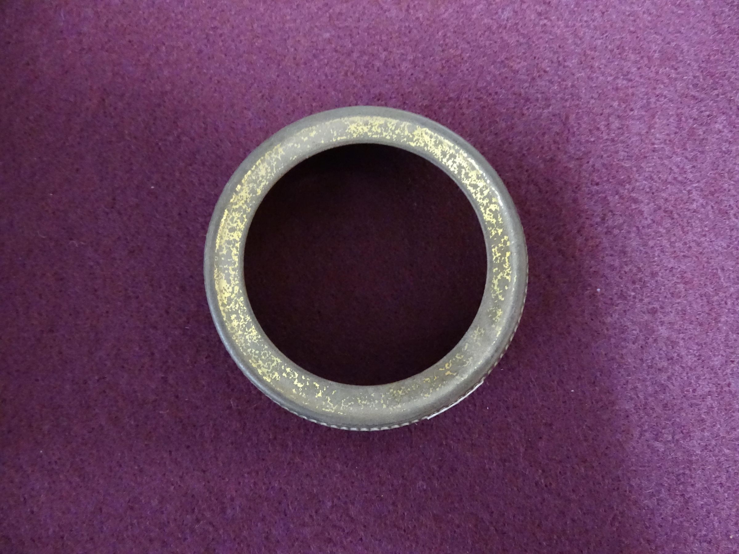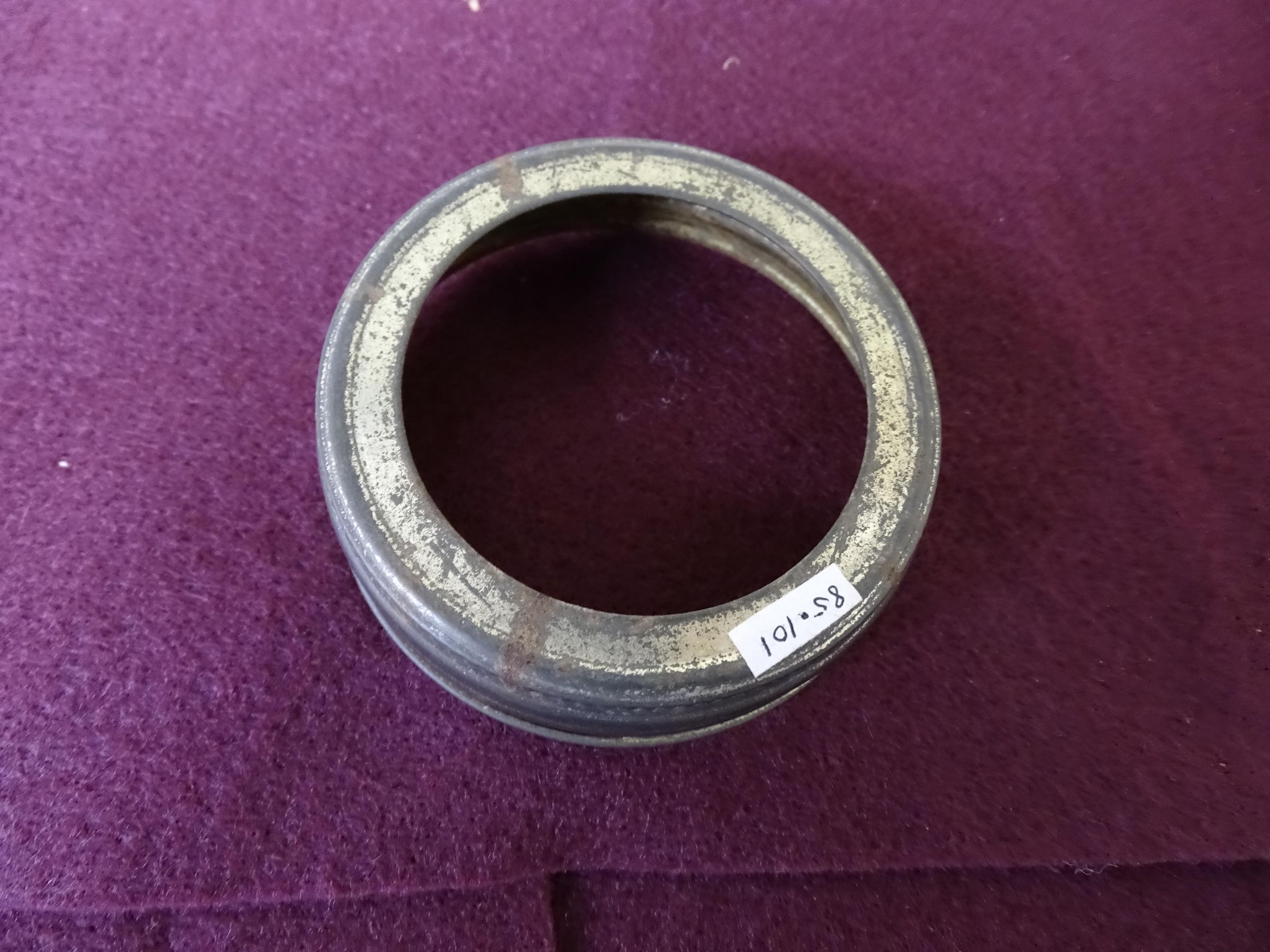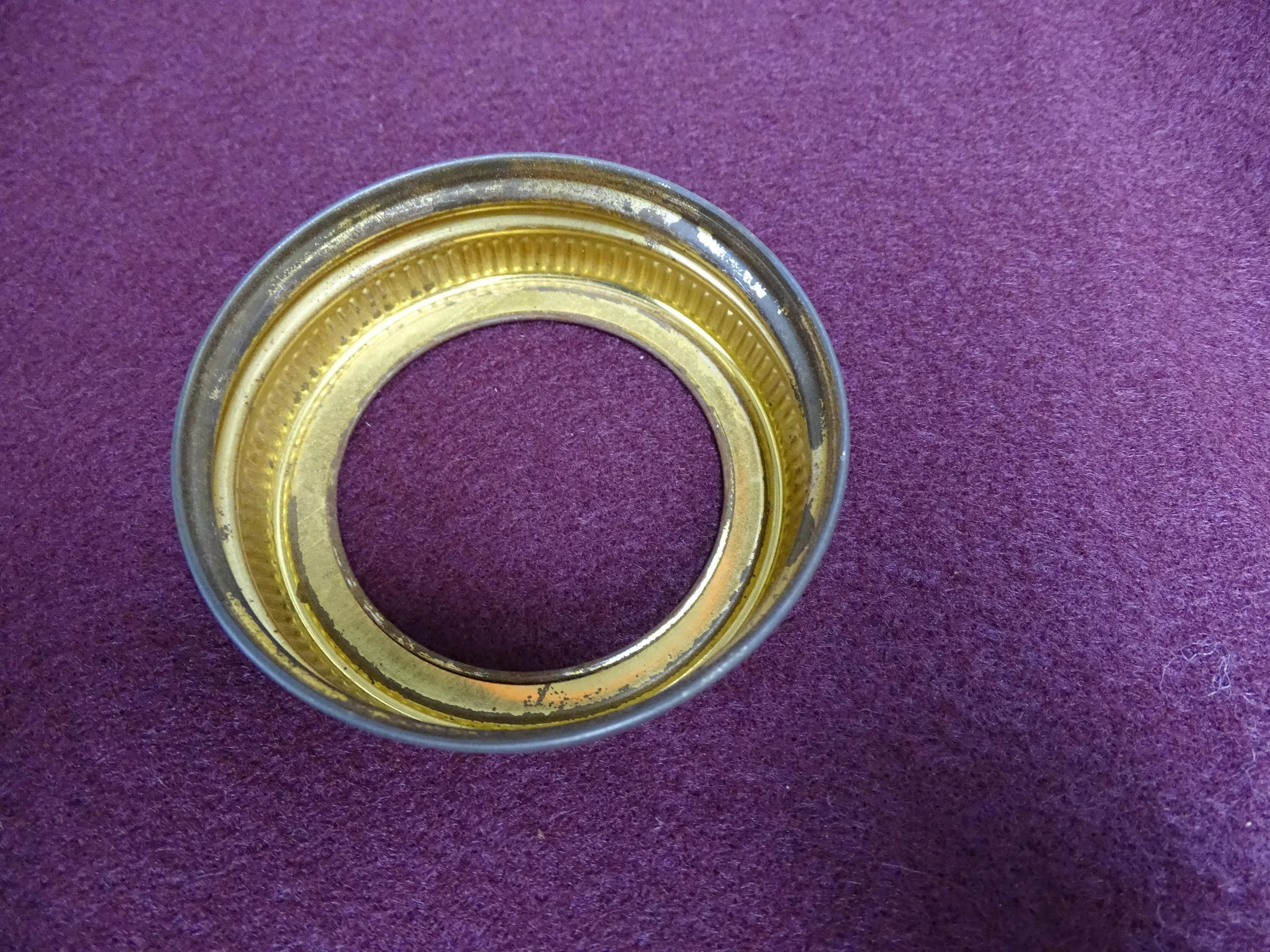 Gold-colored metal band with screw threads to secure a metal lid on a canning jar that has threads. This band is intended to be placed on the jar immediately after the jar is filled and a metal cap is placed on it, and after the jar cools and the lid "pops" the band is removed. The band is possibly brass or an alloy.Lexicon
