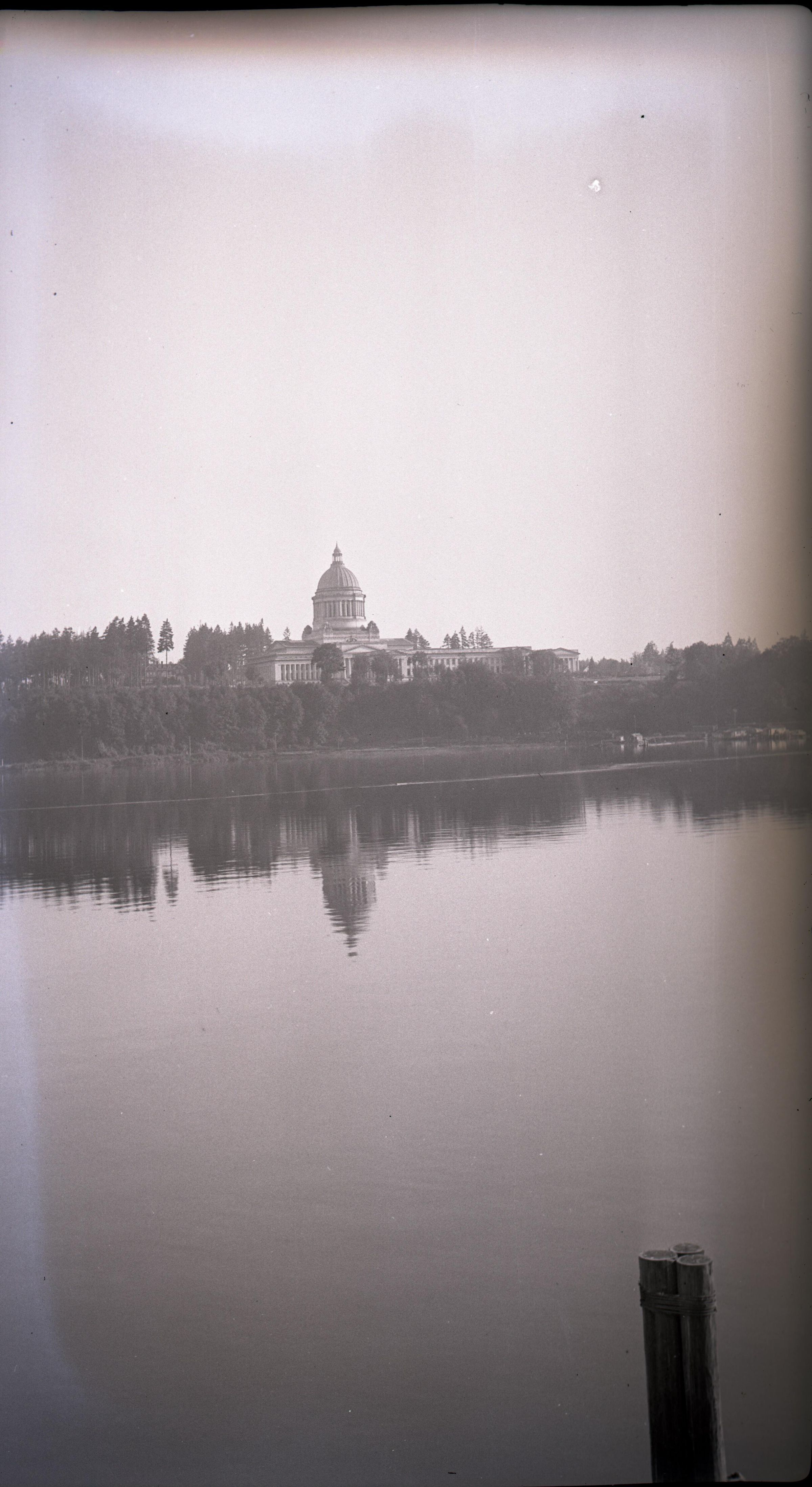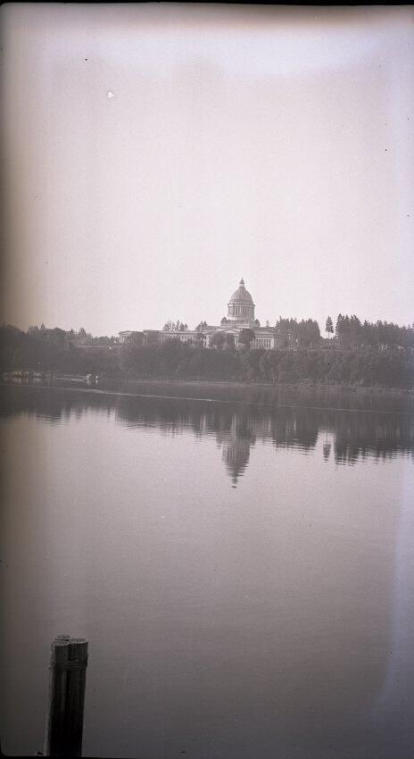 Black and white negative of the Capitol group. In the foreground is the water of the Des Chutes River with a piling in the lower left corner. In the background is the Legislative Building, some of the other state buildings, and trees. The trees and Capitol dome are reflected in the water. There is a white border on all sides, and in the bottom border is "Olympia #746 1936".
