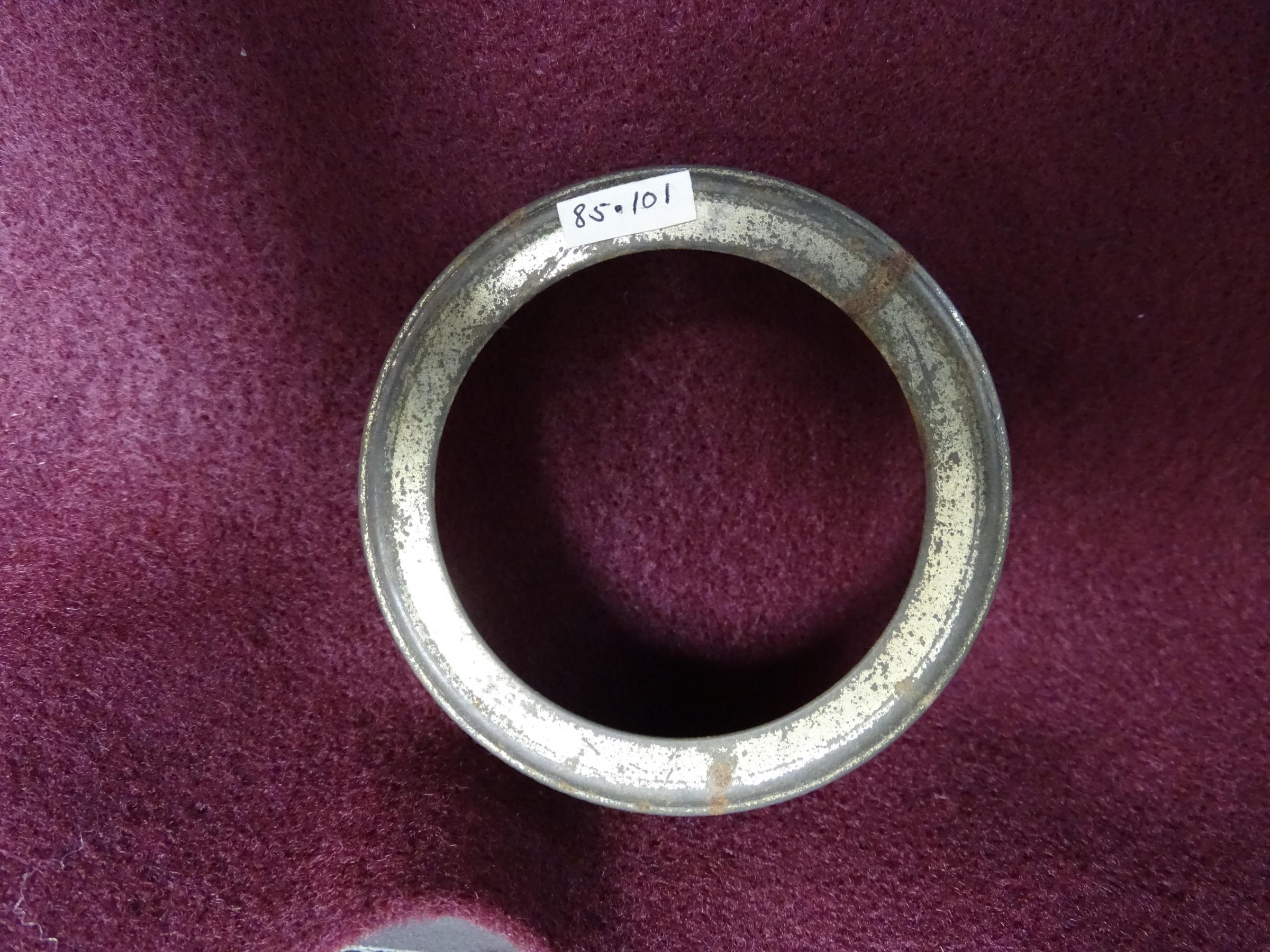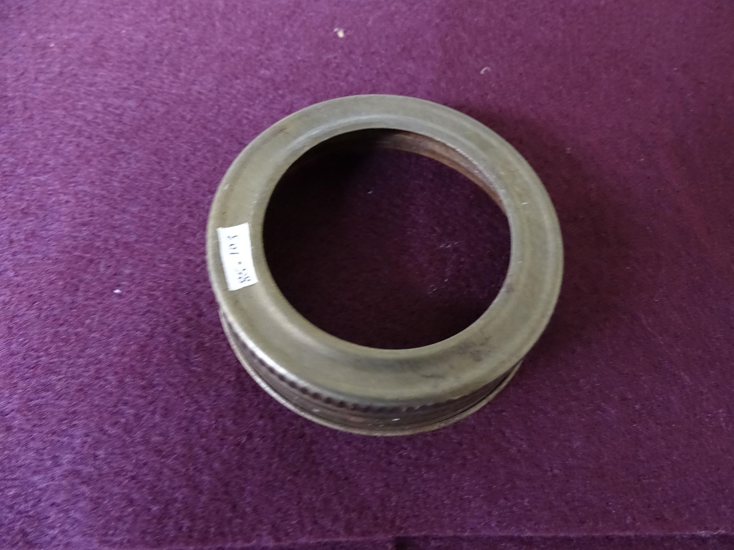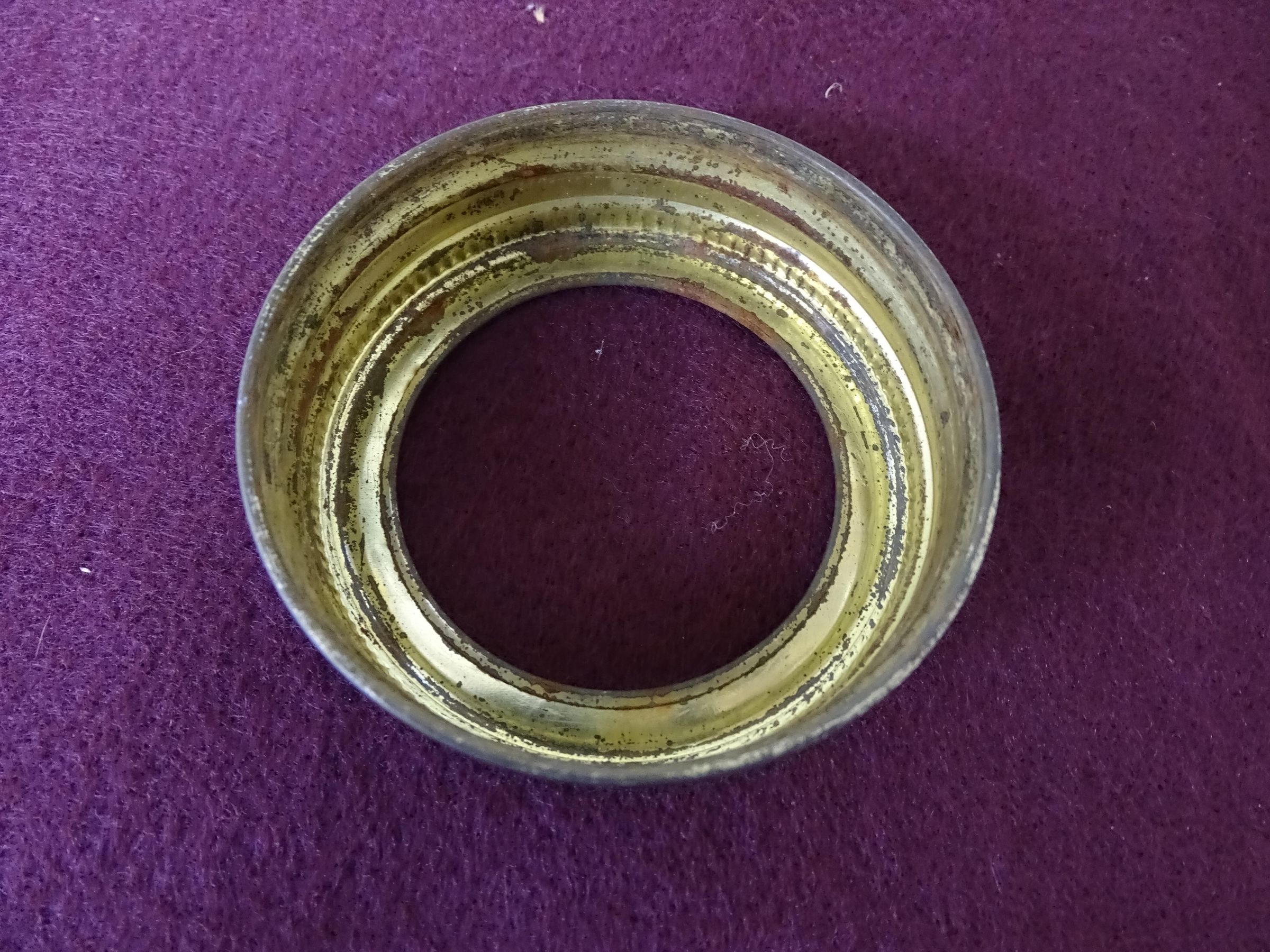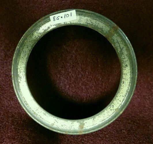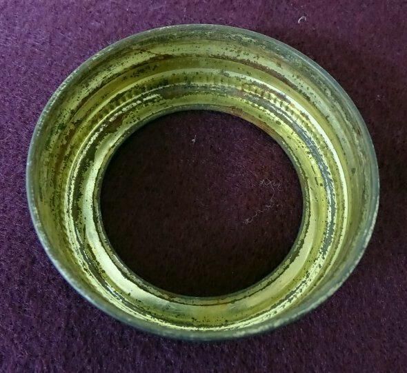 Gold-colored metal band with screw threads to secure a metal lid on a canning jar that has threads. The band is intended to be placed on the jar immediately after the jar is filled and a metal cap is placed on it, and after the jar cools and the lid "pops" the band is removed. The band is possibly brass or an alloy.Lexicon