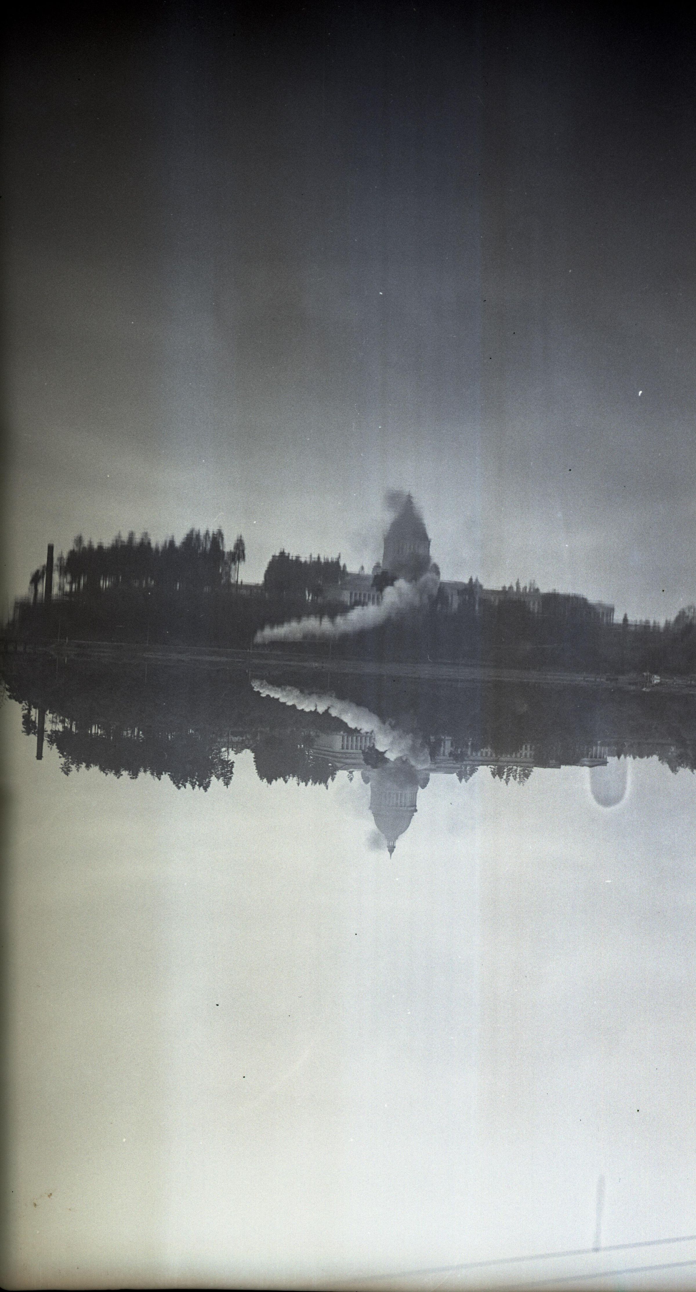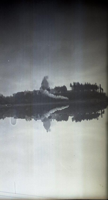 Black and white negative of steam from a locomotive. In the foreground is the water of Budd Inlet. In the background are trees on the western shore and steam from a locomotive (that cannot be seen). The trees and steam are reflected in the water. There is a white border on all sides, and in the bottom border is "Olympia #747 1936".