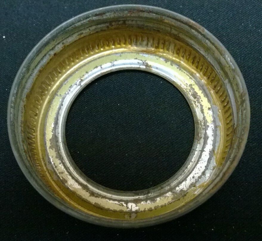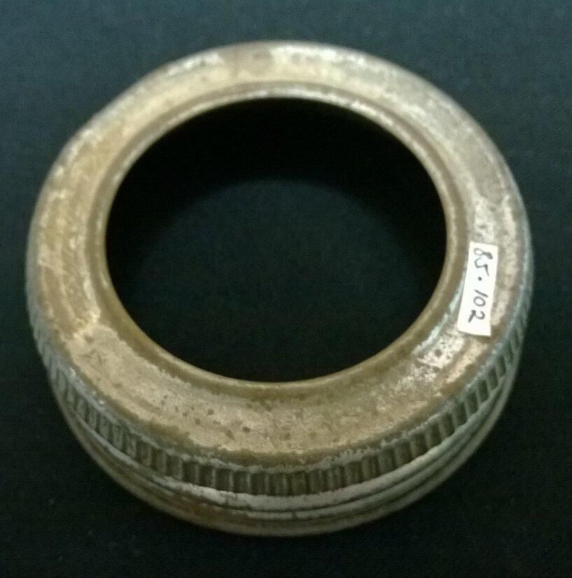 Yellowish-colored metal band with screw threads to secure a metal lid on a canning jar that has threads. The band is intended to be placed on the jar immediately after the jar is filled and a metal cap is placed on it, and after the jar cools and the lid "pops" the band is removed. The band is possibly brass or an alloy.Lexicon