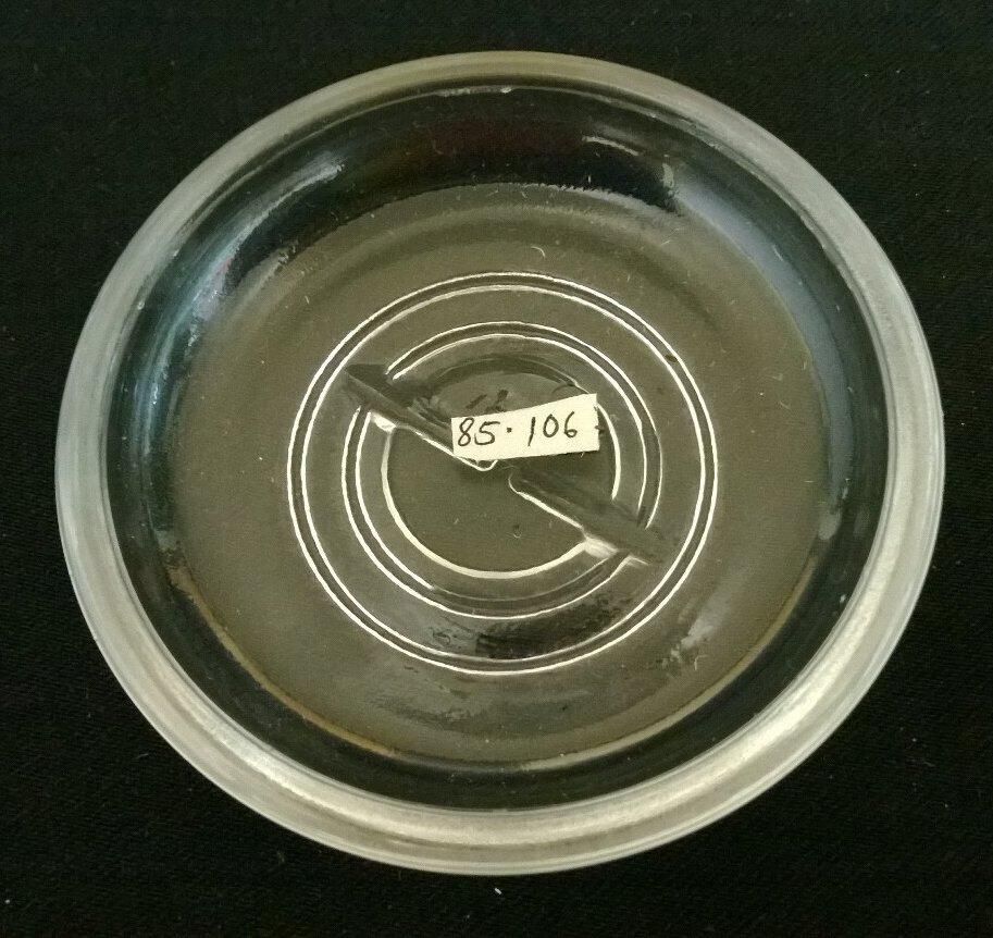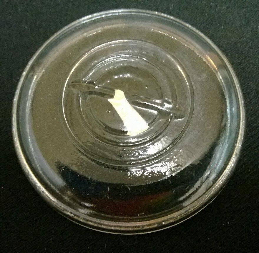 Clear glass lid for "lightning" or "toggle" type canning jar. The lid is designed to fit on a canning jar that does not have threads, but instead has a wire bail. The lid has a cover groove in the center of the top for securing the wire bail, which clamps the lid to the jar using a rubber seal between the lid and the jar.Made/Created