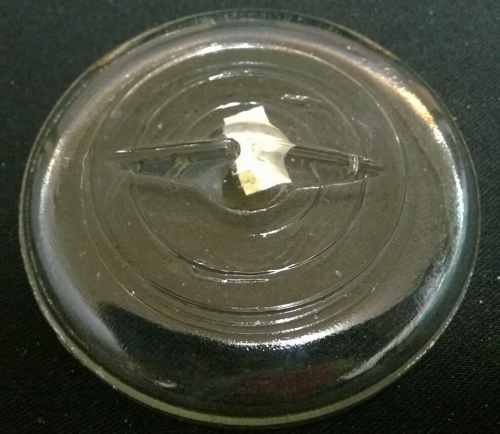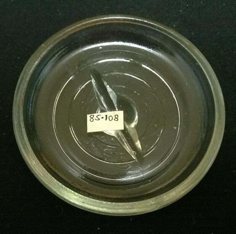 Glass lid for "lightning" or "toggle" type canning jar. The lid is designed to fit on a canning jar that does not have threads, but instead has a wire bail. The lid has a cover groove in the center of the top for securing the wire bail which clamps the lid to the jar using a rubber seal between the lid and the jar.Made/Created