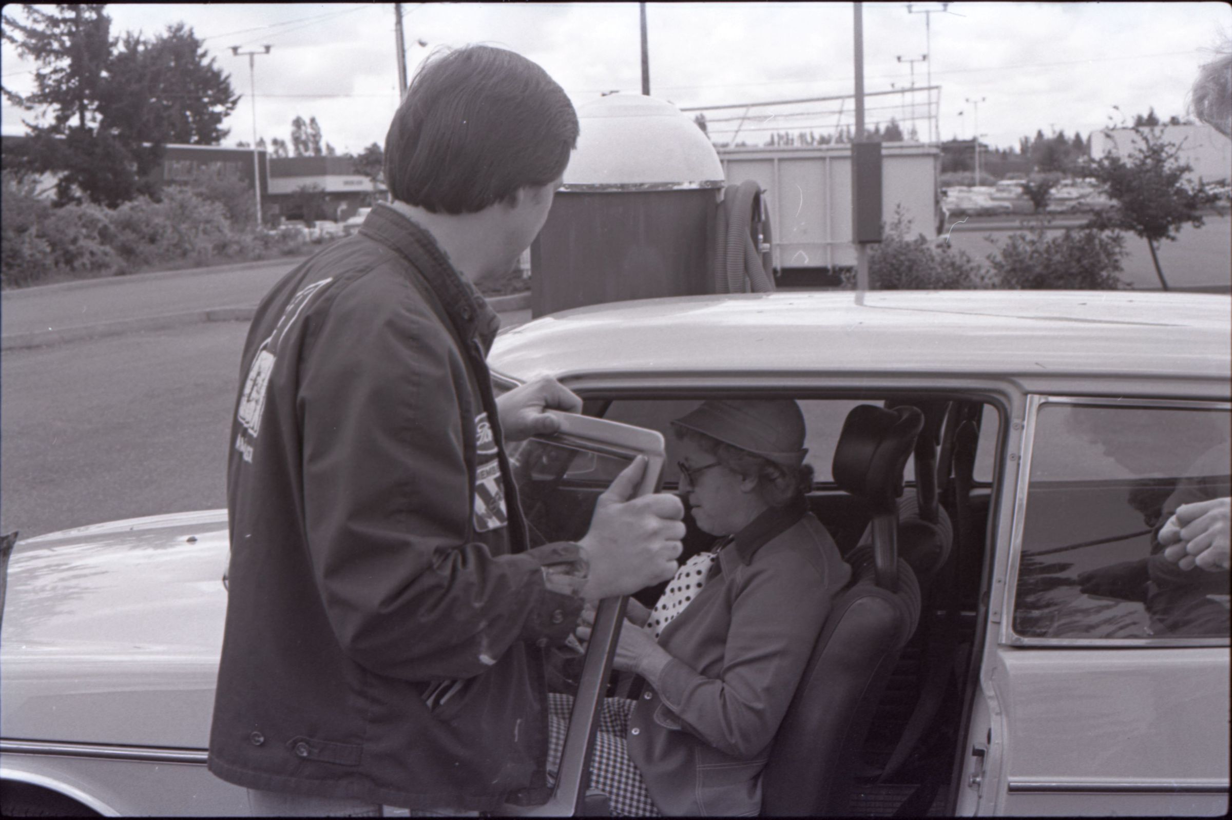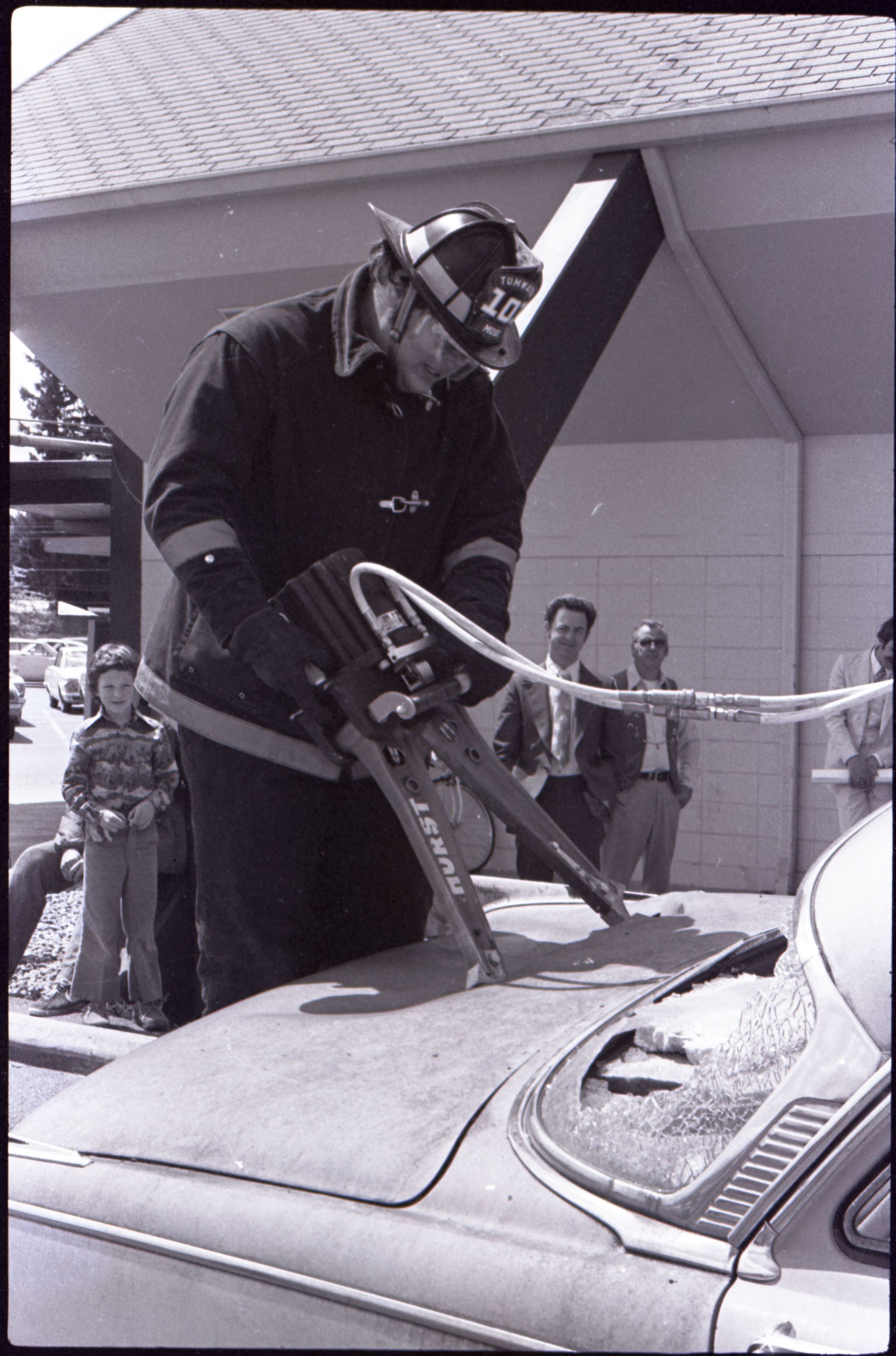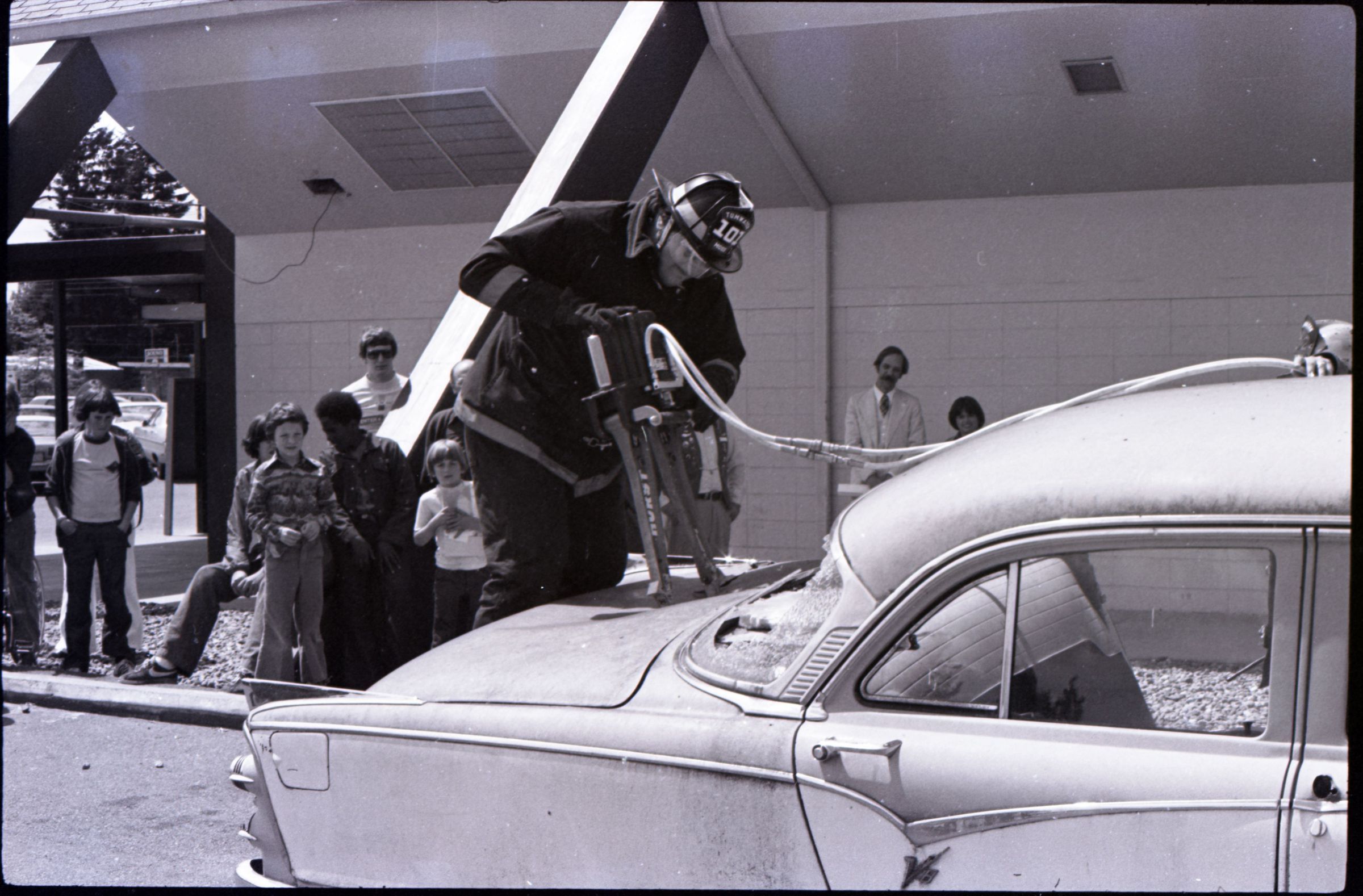 Unidentified People, 1977. These three black and white film negative strips were created for the Lacey Leader newspaper. These images show four young people posing together for photos, a piece of wall art, people cleaning a car, and a firefighter using the jaws of life on the trunk of a car.Made/Created