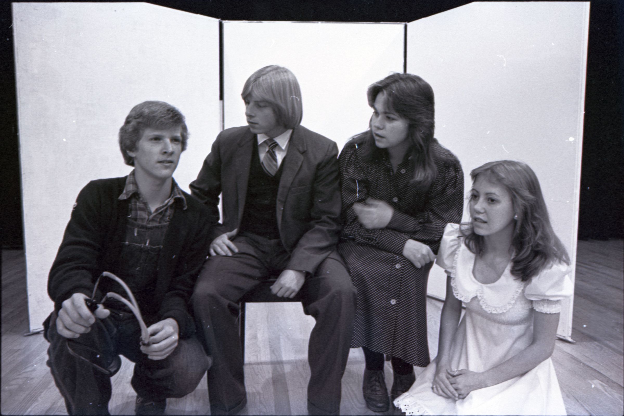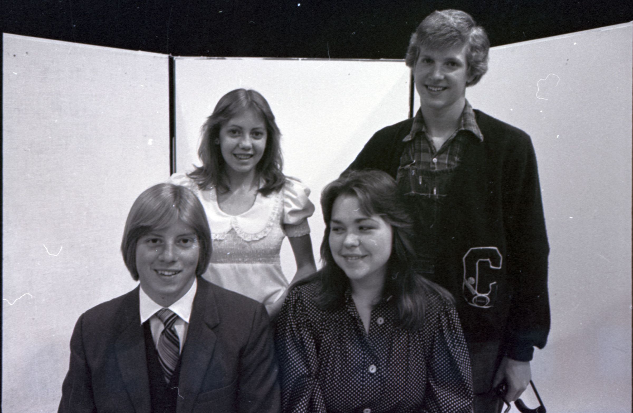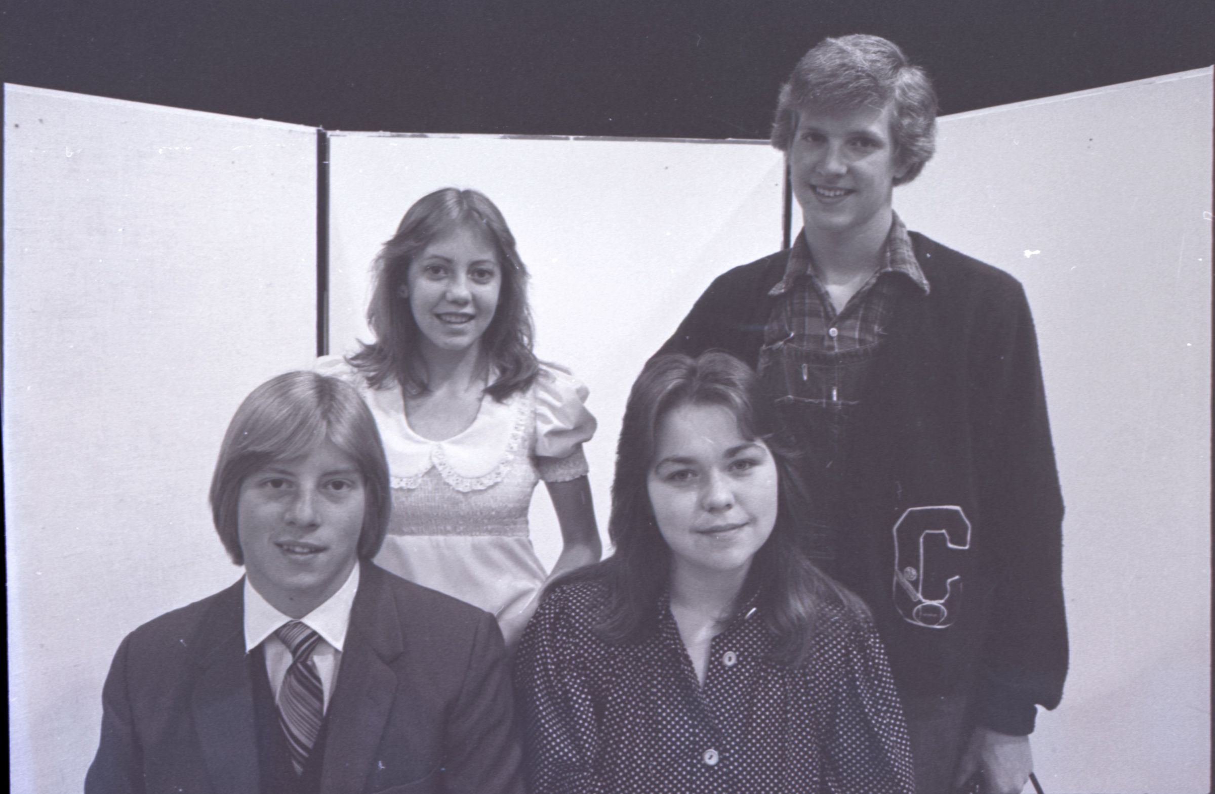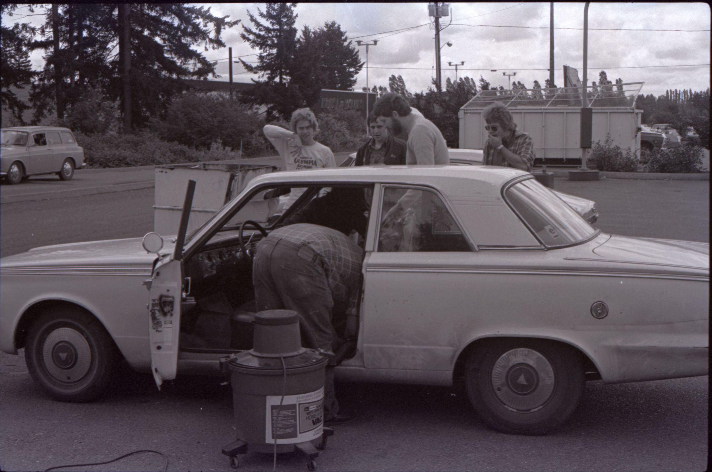 Unidentified People, 1977. These three black and white film negative strips were created for the Lacey Leader newspaper. These images show four young people posing together for photos, a piece of wall art, people cleaning a car, and a firefighter using the jaws of life on the trunk of a car.Made/Created