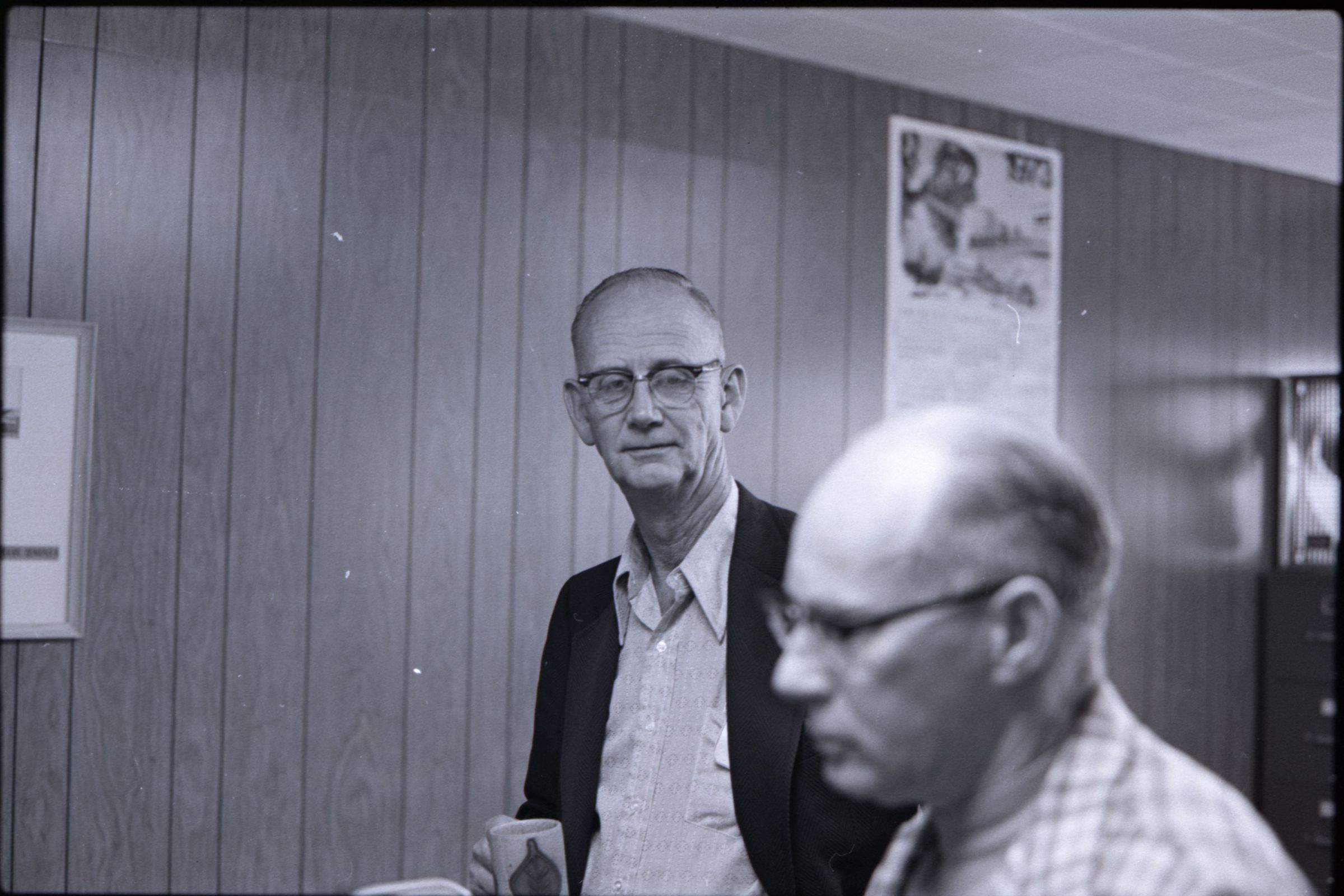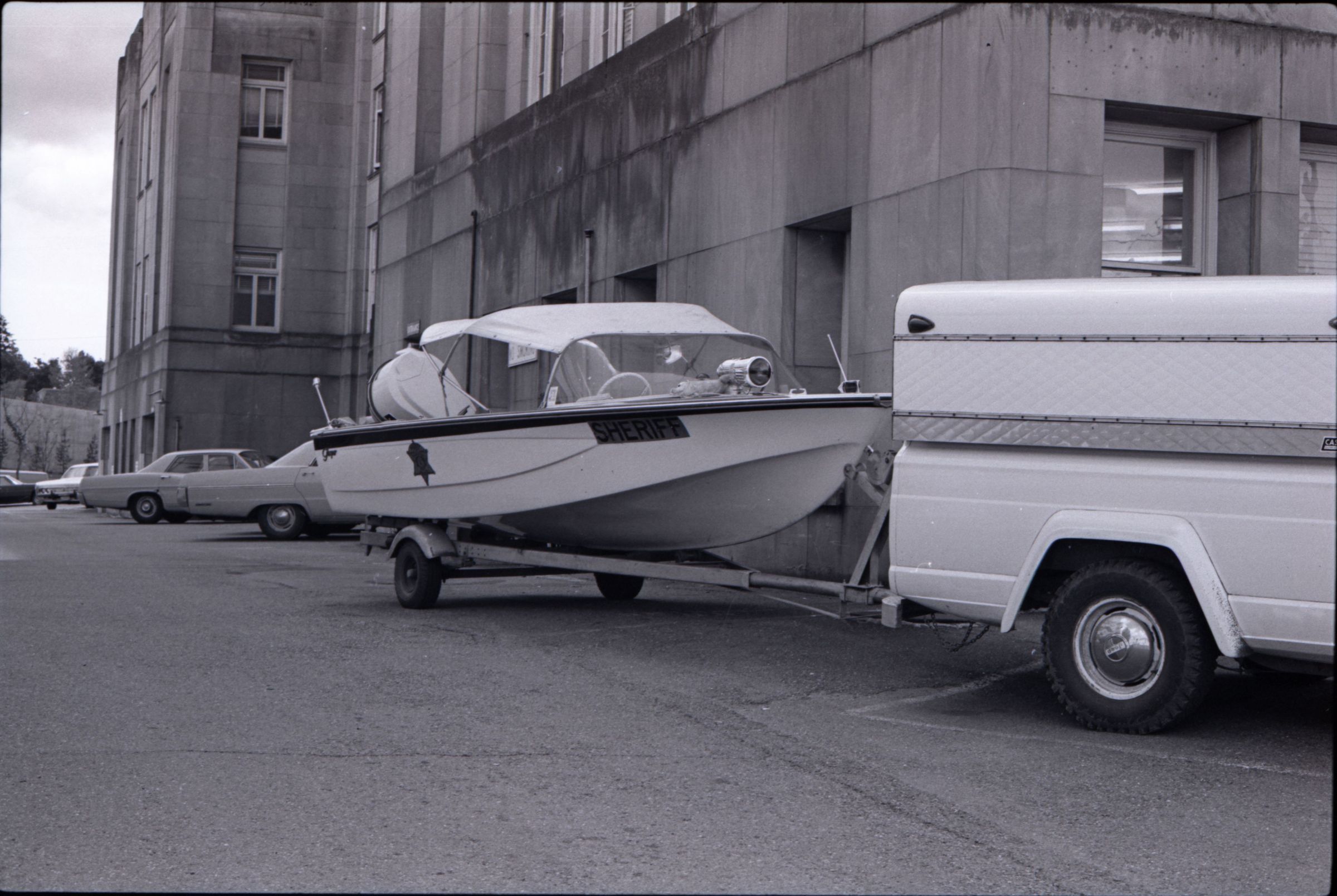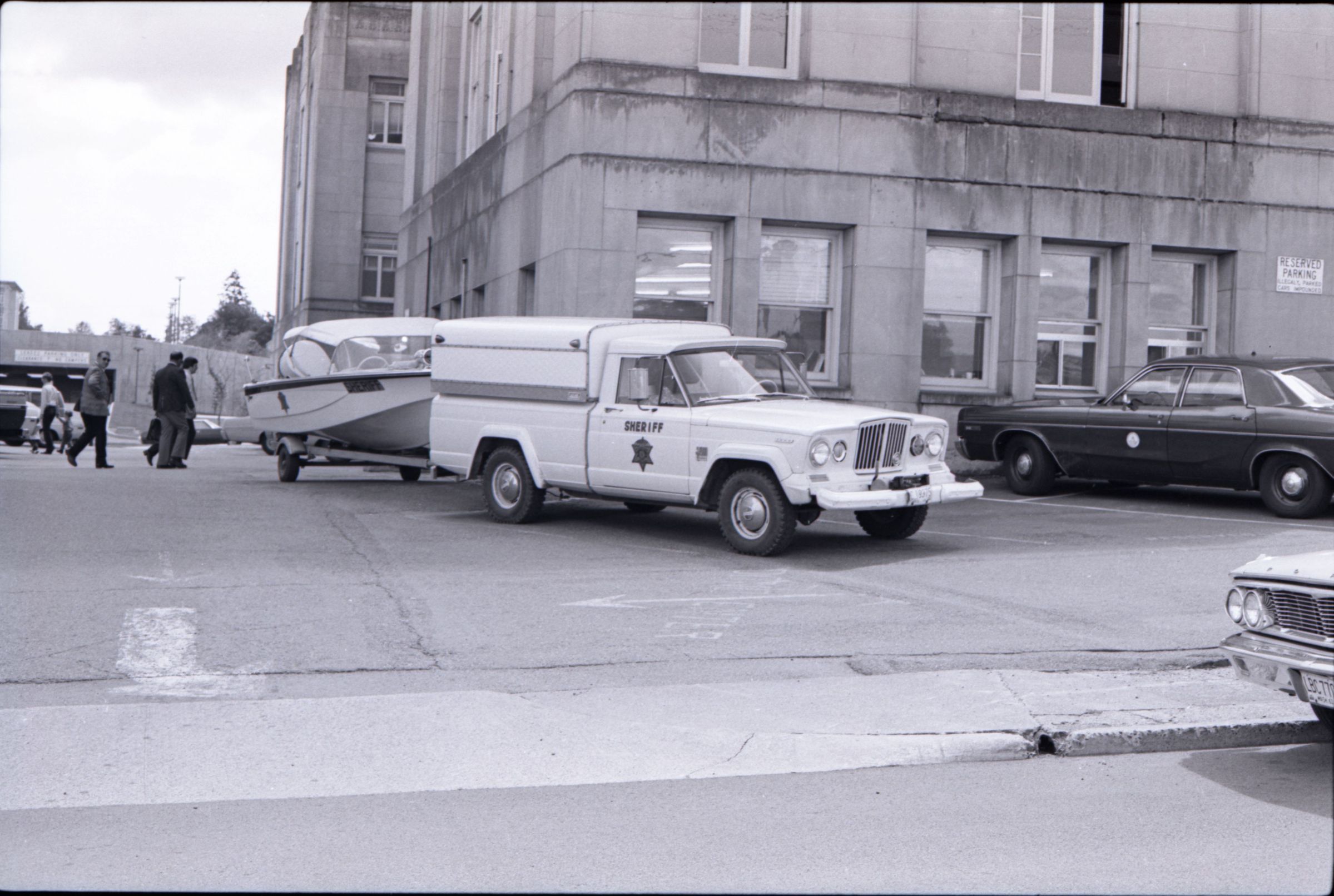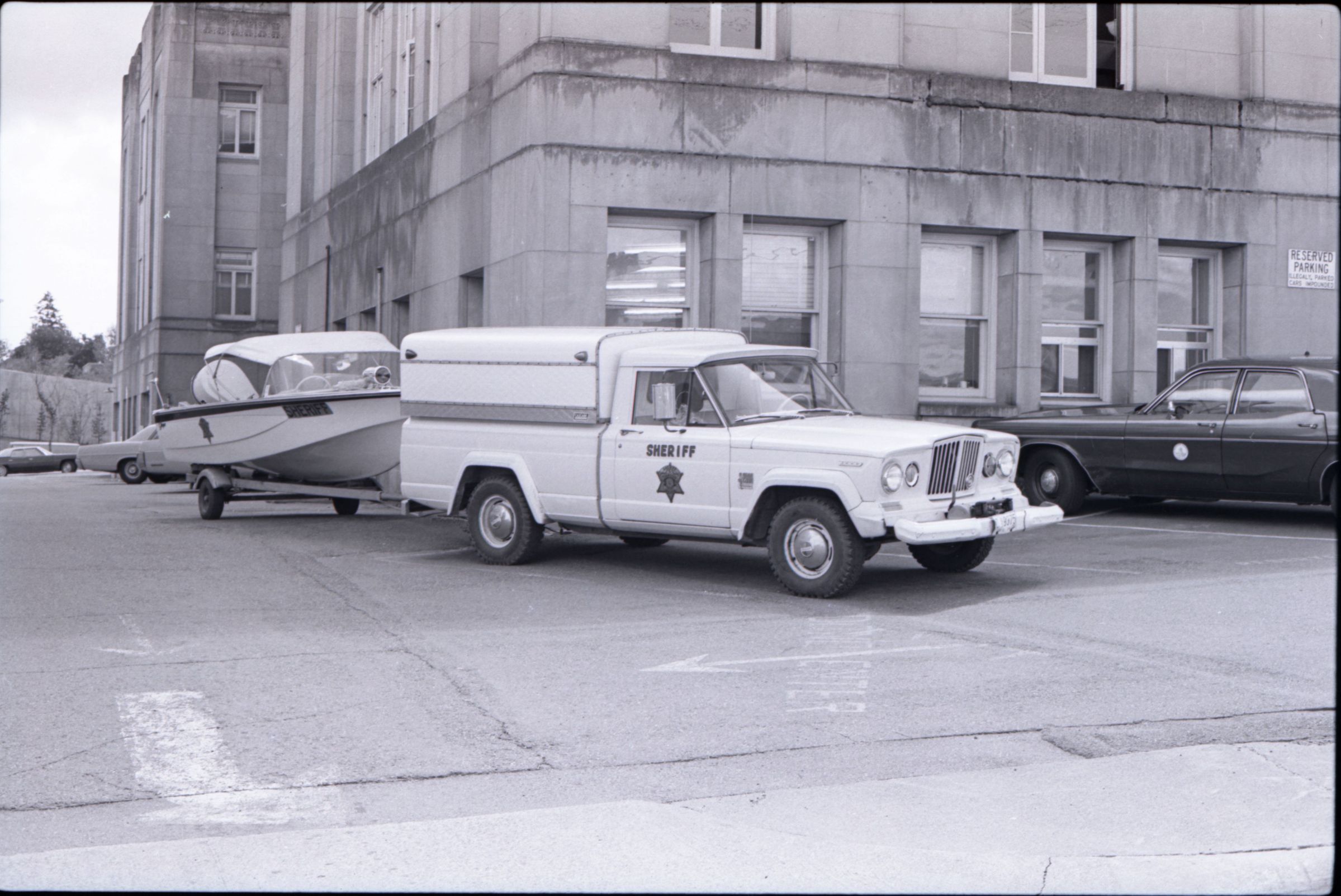 Thurston County Commissioners Yantis and Hedgepeth, 1973. These three black and white film negative strips were created for the Lacey Leader newspaper. These images show George F. Yantis, Jr. and Homer Hedgepeth in a meeting room, and a Thurston County Sheriff's pickup truck pulling a boat.Made/Created