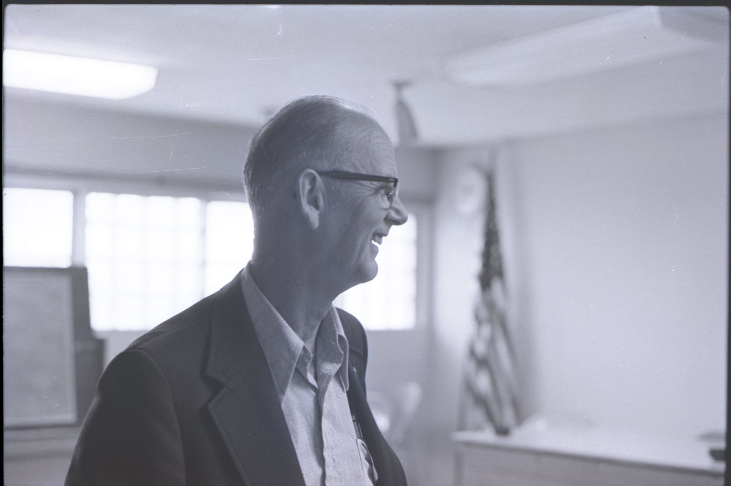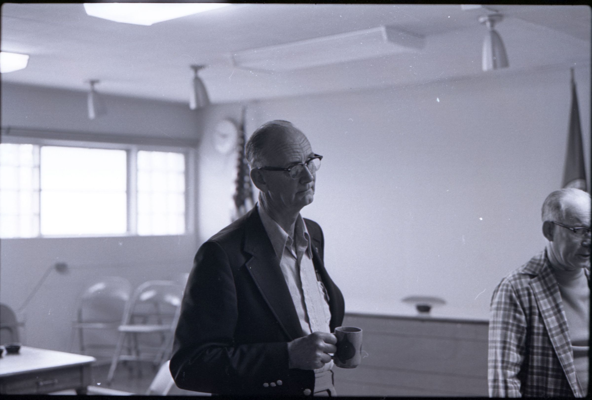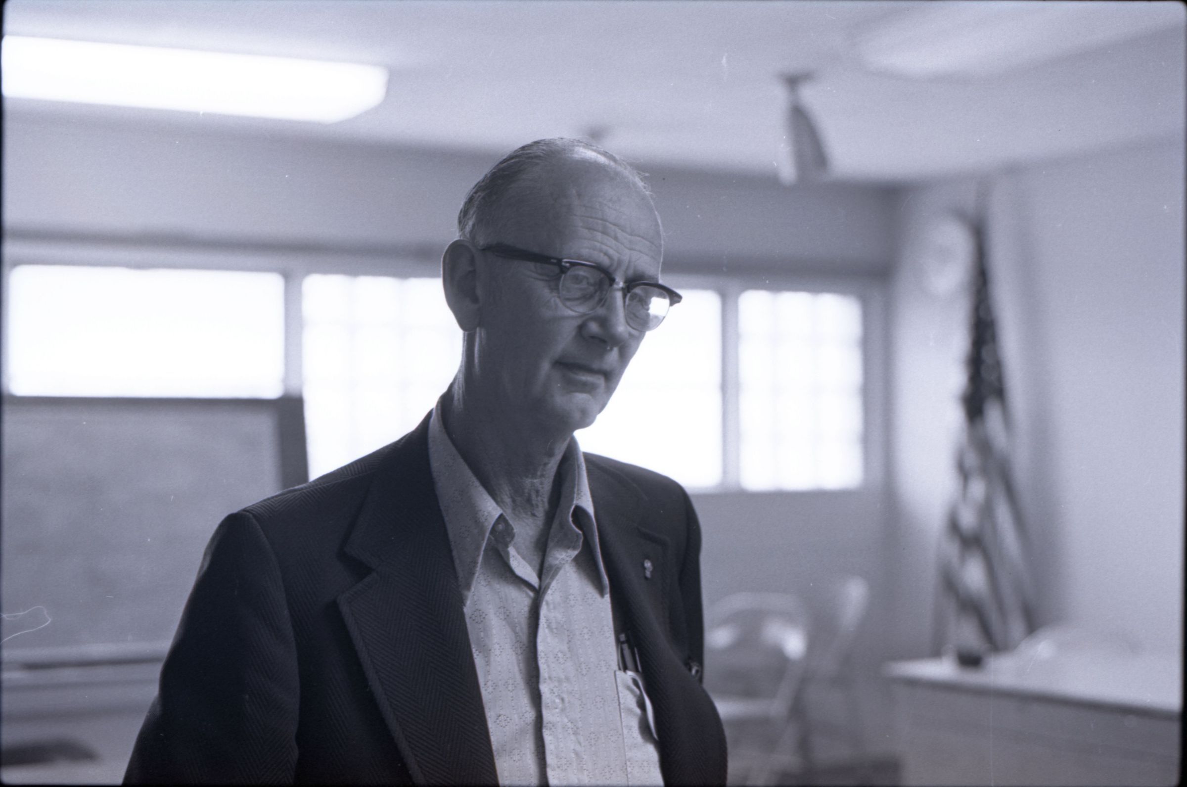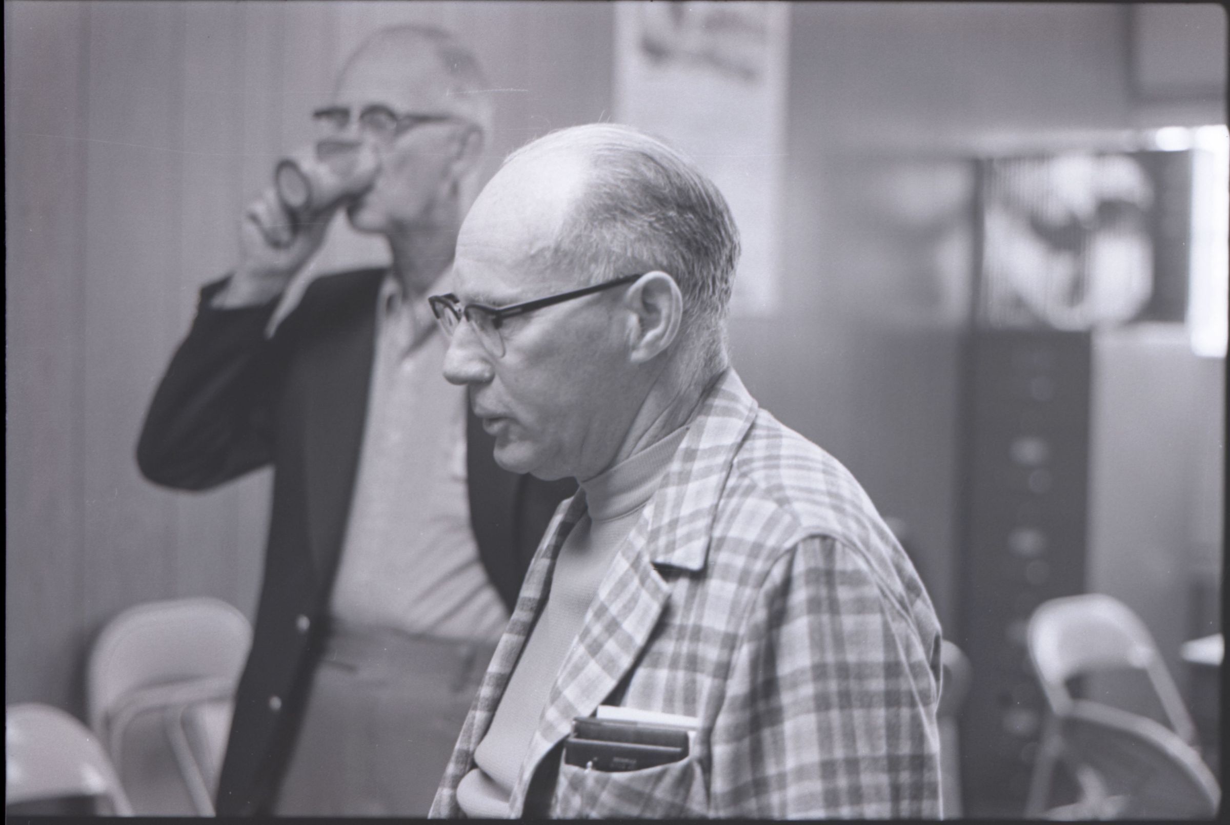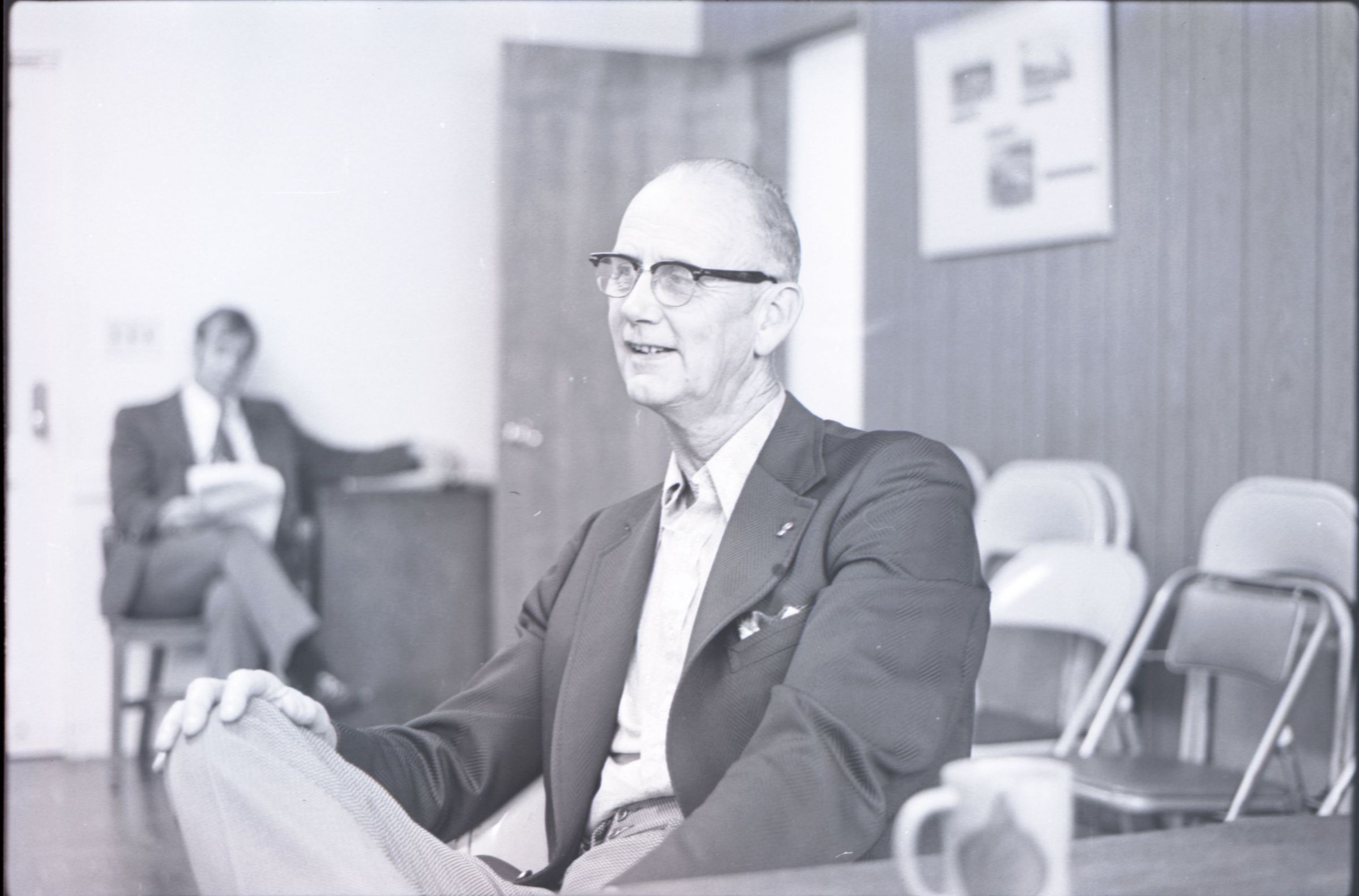 Thurston County Commissioners Yantis and Hedgepeth, 1973. These three black and white film negative strips were created for the Lacey Leader newspaper. These images show George F. Yantis, Jr. and Homer Hedgepeth in a meeting room, and a Thurston County Sheriff's pickup truck pulling a boat.Made/Created