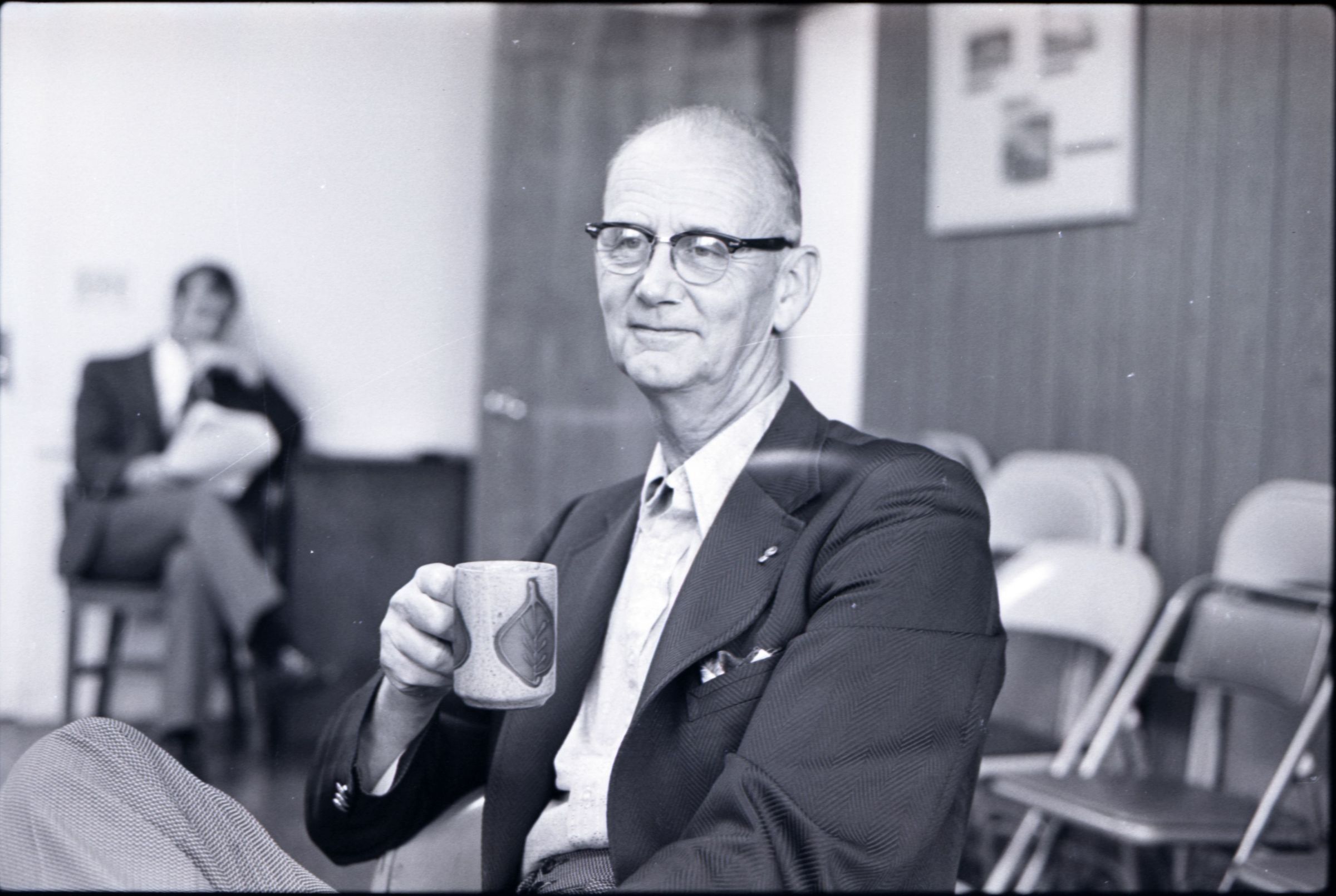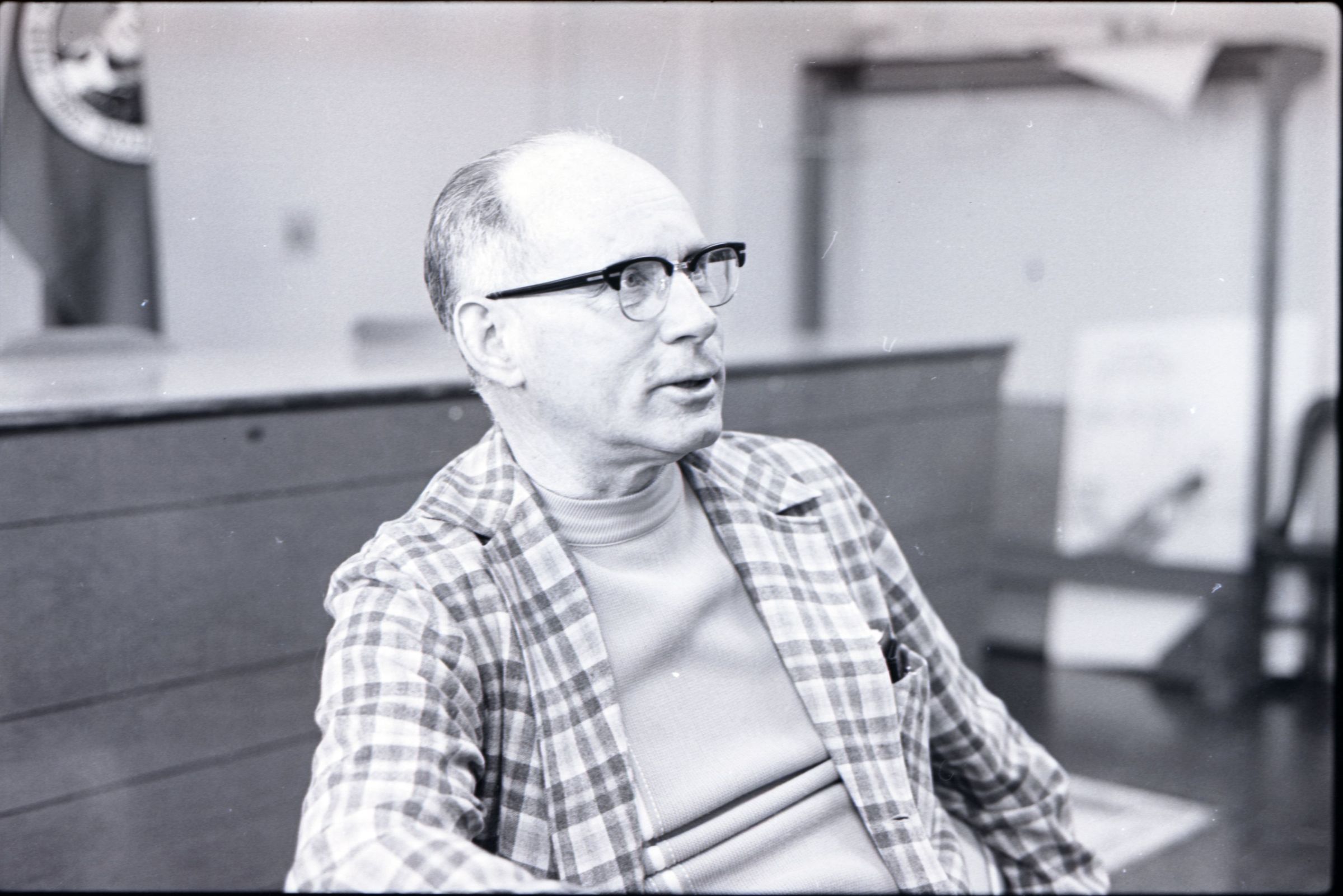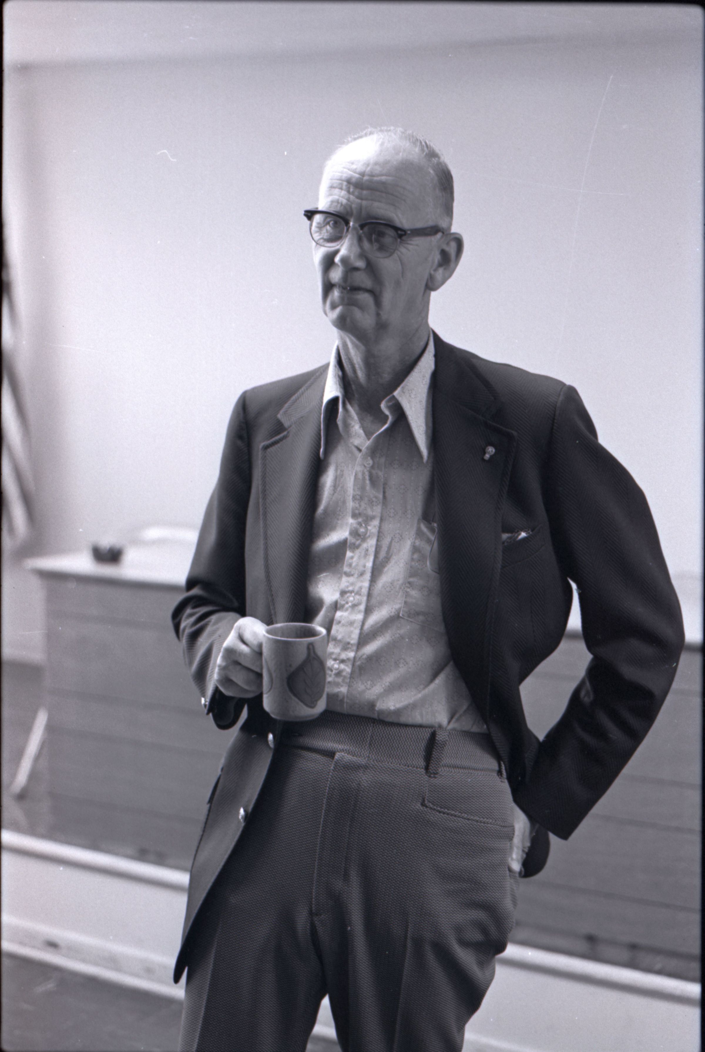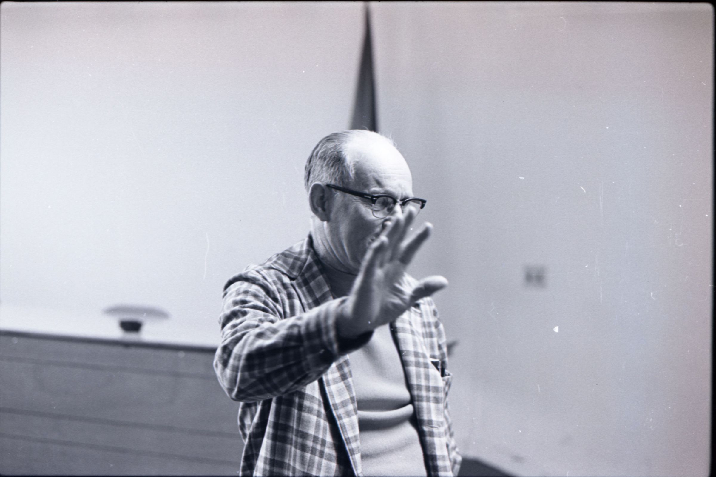 Thurston County Commissioners Yantis and Hedgepeth, 1973. These three black and white film negative strips were created for the Lacey Leader newspaper. These images show George F. Yantis, Jr. and Homer Hedgepeth in a meeting room, and a Thurston County Sheriff's pickup truck pulling a boat.Made/Created