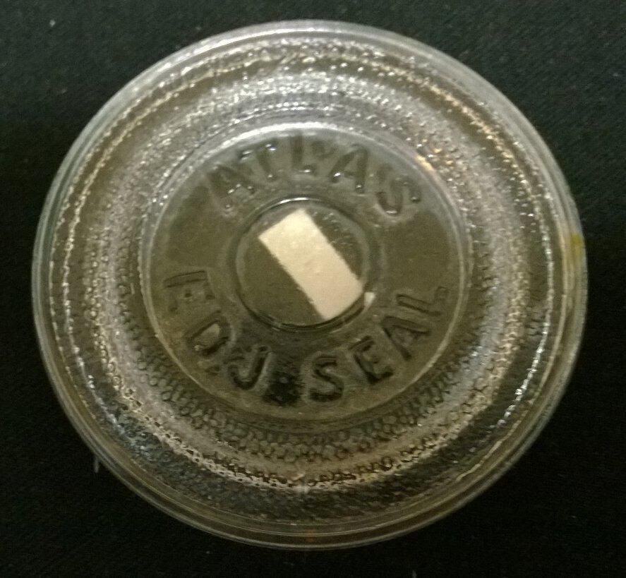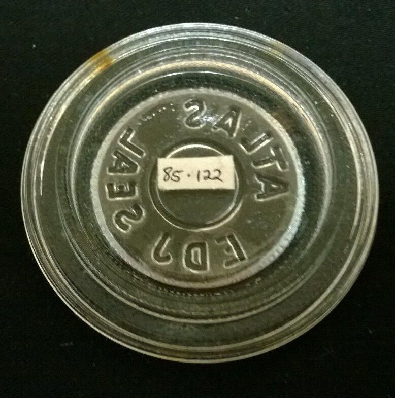 Clear glass "wax seal" lid for a canning jar. The lid fits on a jar with a groove for insertion of a waxed string. There is no closing groove on this lid. On top of the lid is embossed "Atlas" and "EDJ Seal".Made/Created