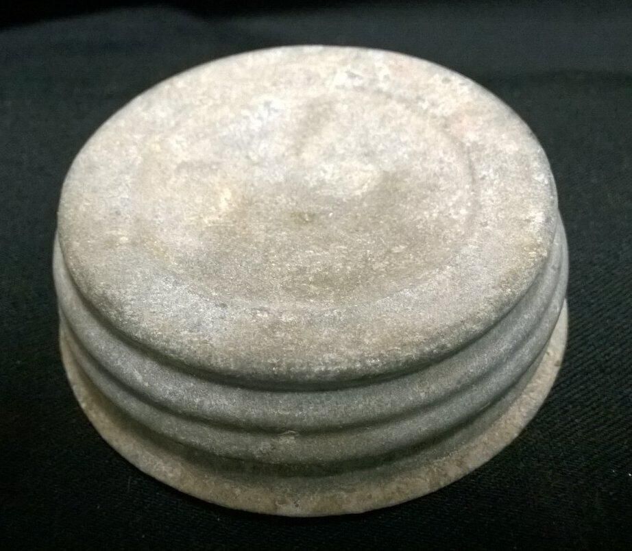 Zinc and glass lid for a canning jar. The gray lid has female threads to fit on the male threads of a mason jar. The top of the lid has a circle of 1.75". The inside of the lid has a white milk glass lining with the following embossed in capital letters: "genuine boyd cap for mason jars". A circle of 1.25" is embossed in the center of the liner. The outside of the lid has corrosion accretions and the inside is heavily corroded with accretions/powdery white spots. There is a red color at the sealing edge possibly from contact with a rubber gasket.Made/Created