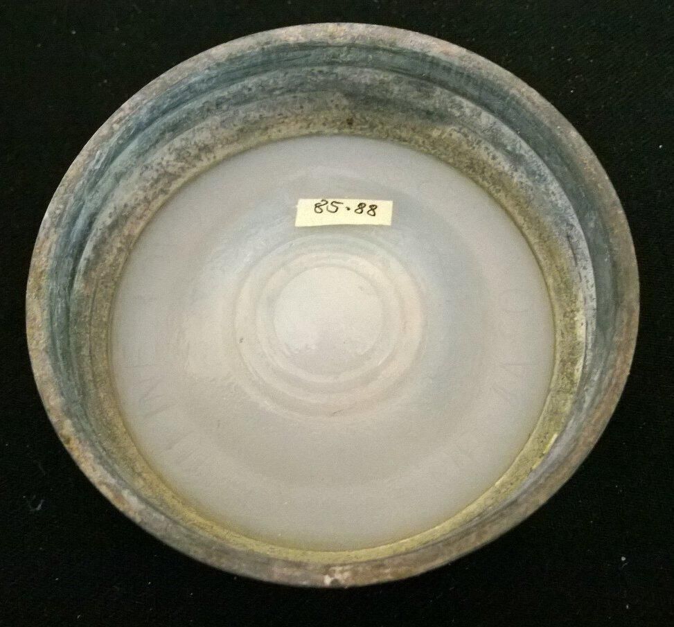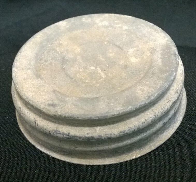 Zinc and glass lid for a canning jar. The gray lid has female threads to fit onto the male threads of a mason jar. The top of the lid has concentric circles of 1" and 1.75". The inside of the lid has a white milk glass lining with the following embossed in capital letters: "genuine Boyd cap for mason jars". Three concentric circles from .5" to 1.25" are embossed in the center of the liner. The outside of the lid has corrosion accretions and the inside is heavily corroded with accretions/powdery white spots.Made/Created