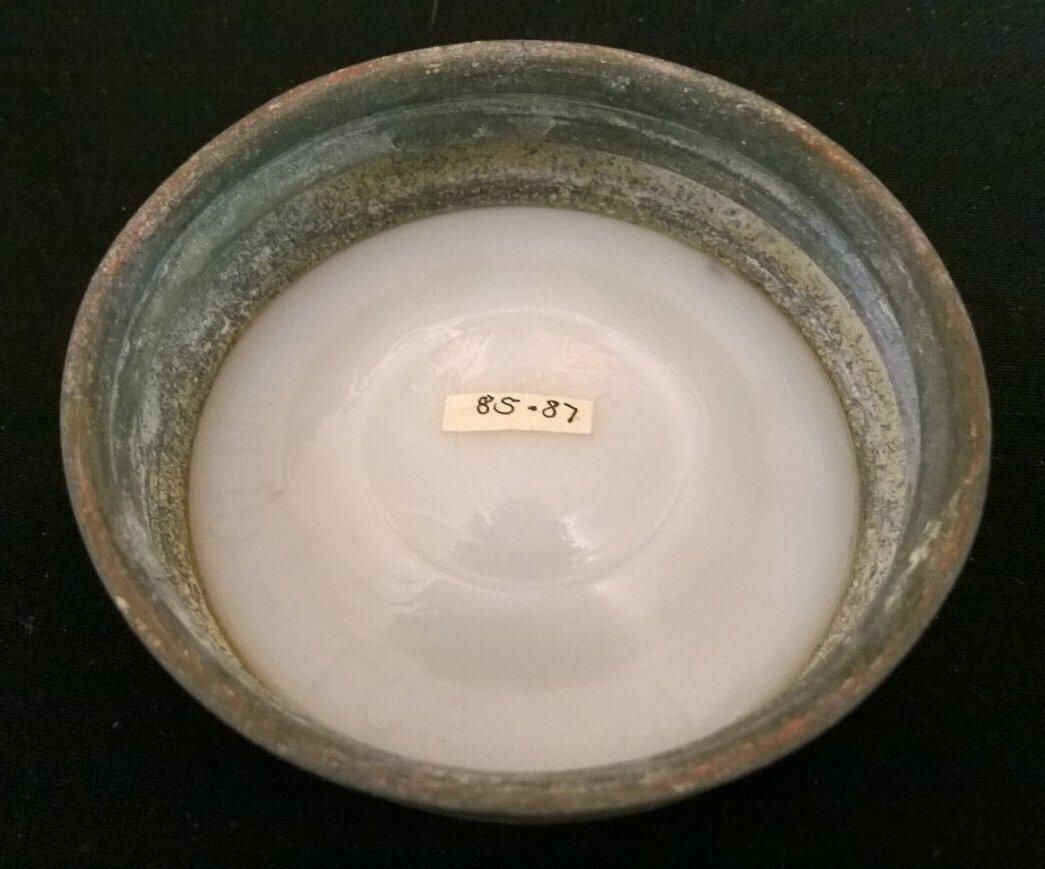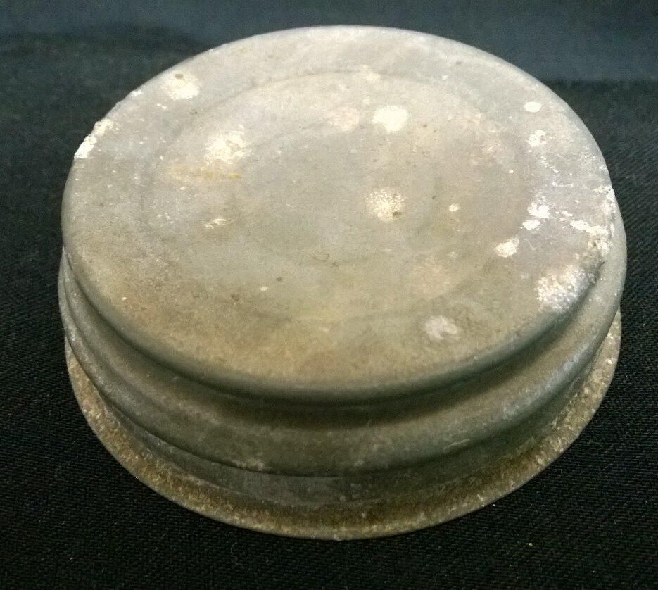 Zinc and glass lid for a canning jar. The gray lid has female threads to fit onto the male threads of a mason jar. The inside of the lid has a white milk glass lining with the following embossed in capital letters: "genuine Boyd cap for mason jars". A 1" circle is embossed in the center of the liner. Marks in the center of the lining look like tree branches. The outside of the lid has corrosion accretions and the inside is heavily corroded with accretions/powdery white spots.Made/Created
