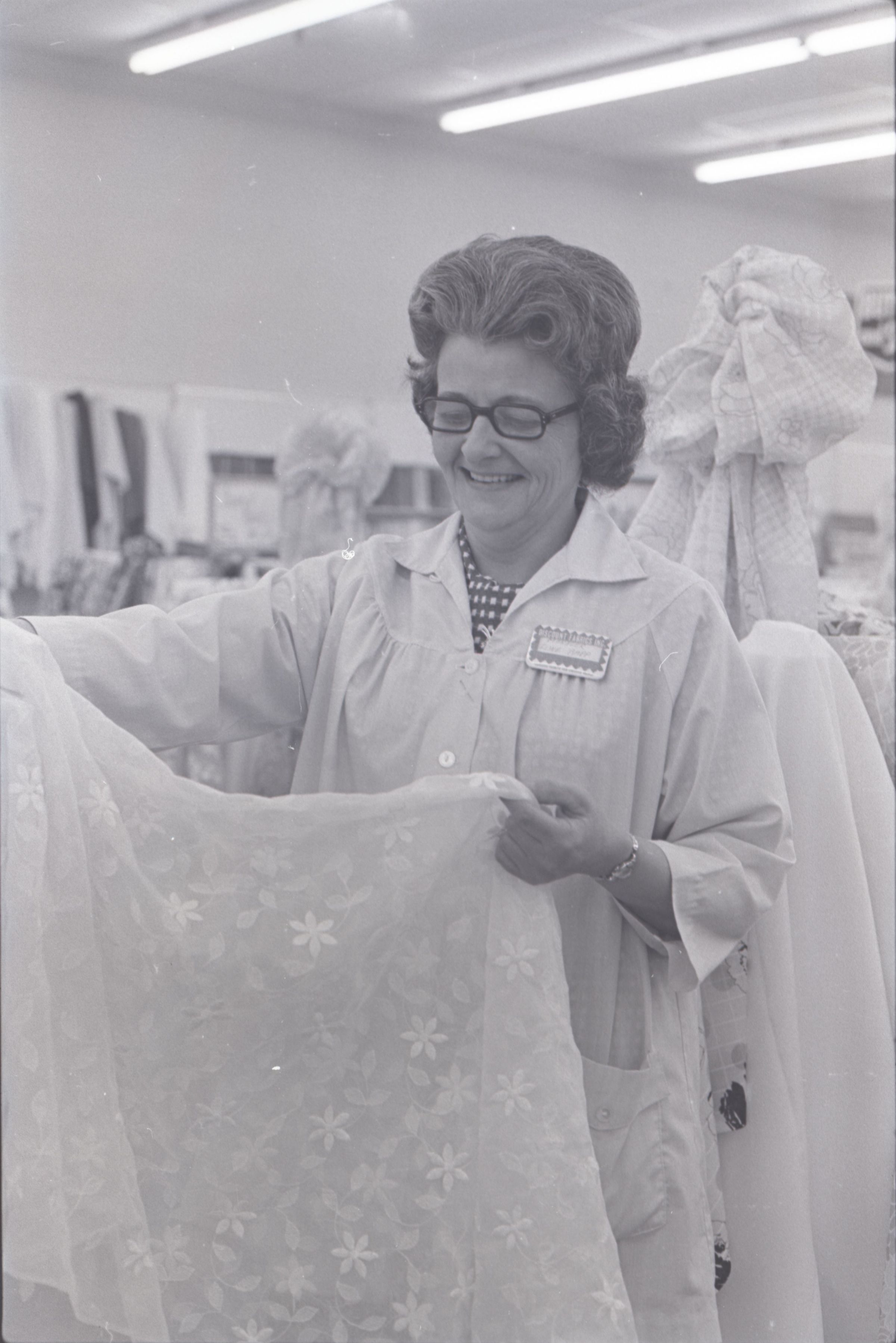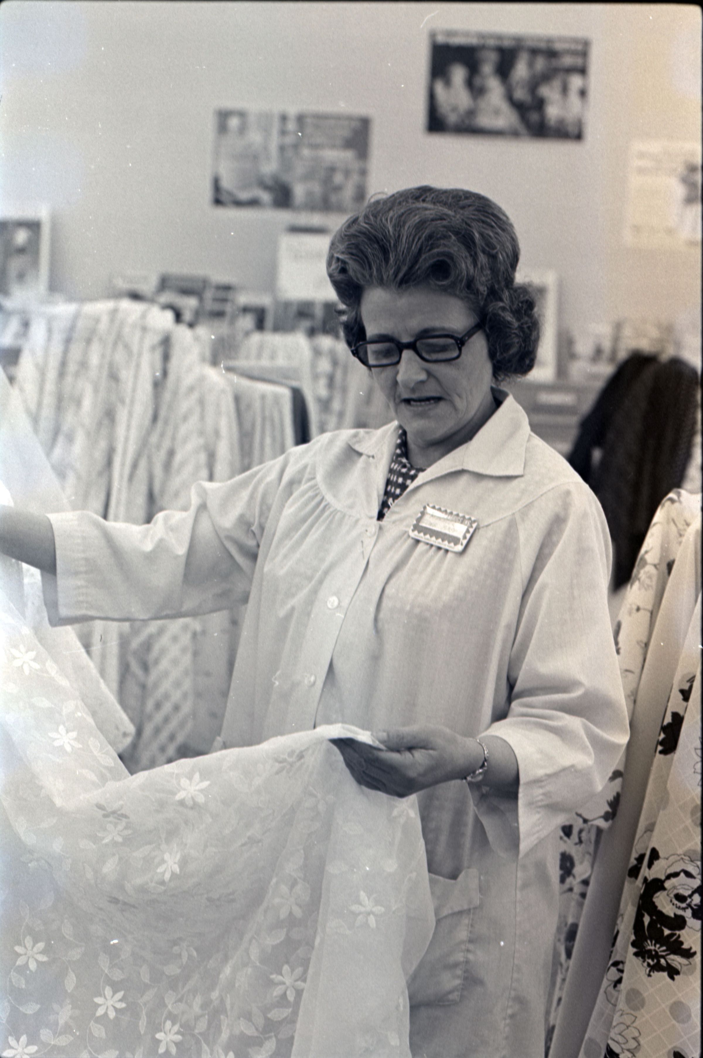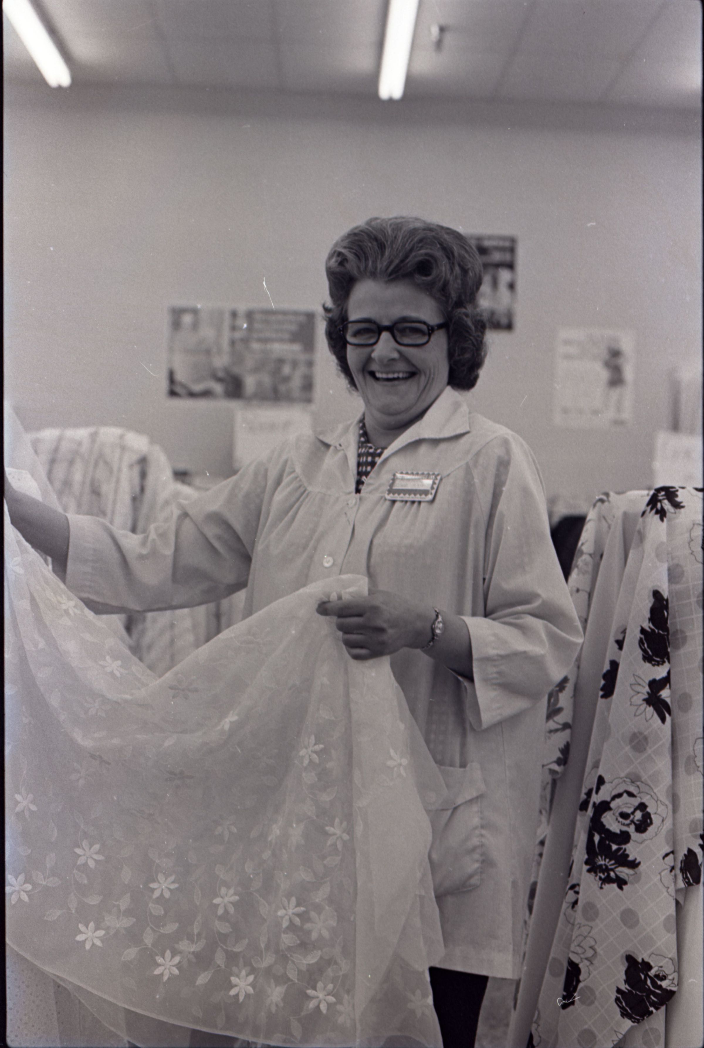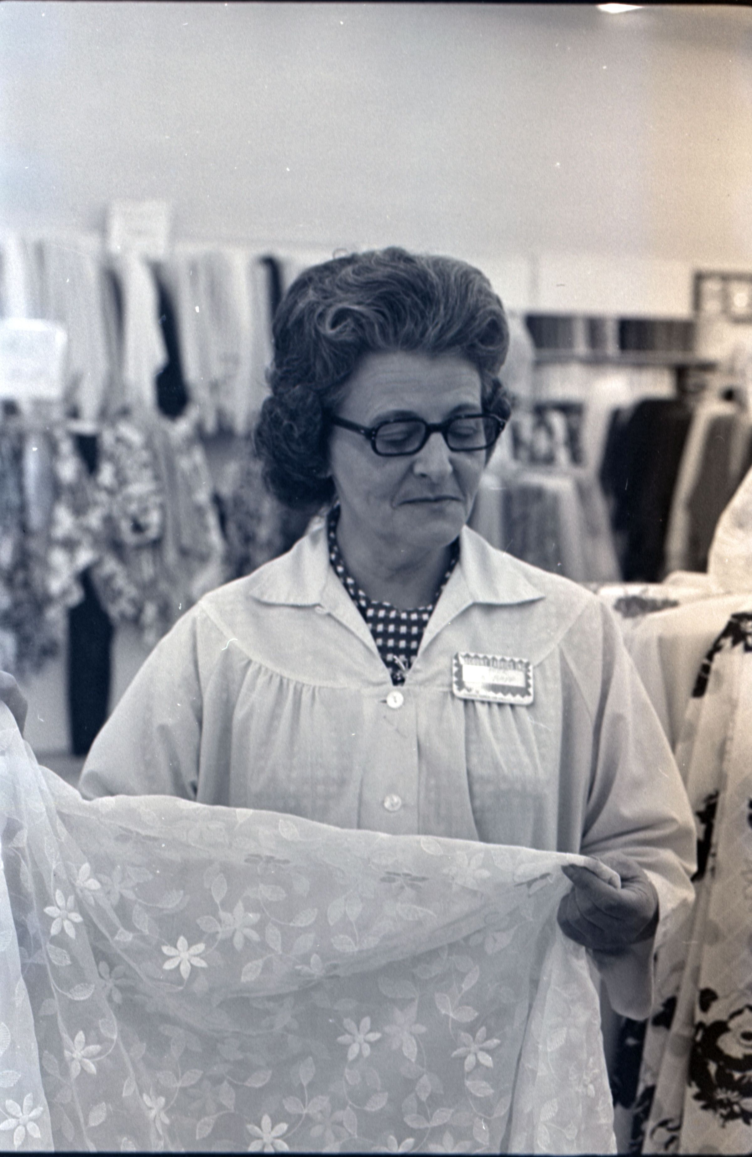 Discount Fabrics, 1974. These two black and white film negative strips were created for the Lacey Leader newspaper. These images show a woman (Ione Rapp) holding up a piece of fabric. This woman has swept-back hair and is wearing glasses and a jacket with 3/4 sleeves. She is wearing a nametag which identifies her as Ione Rapp, manager of the Discount Fabrics store.