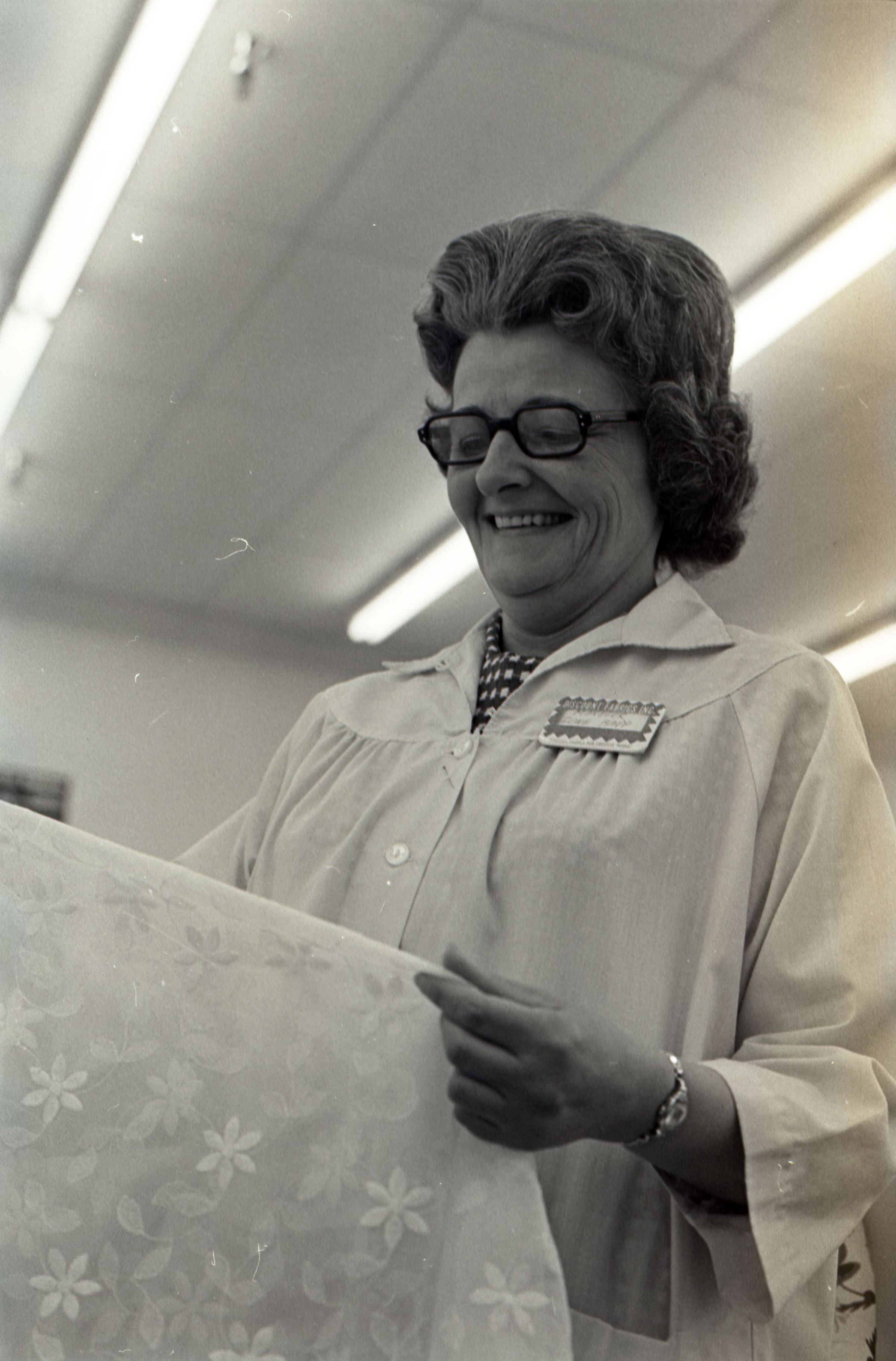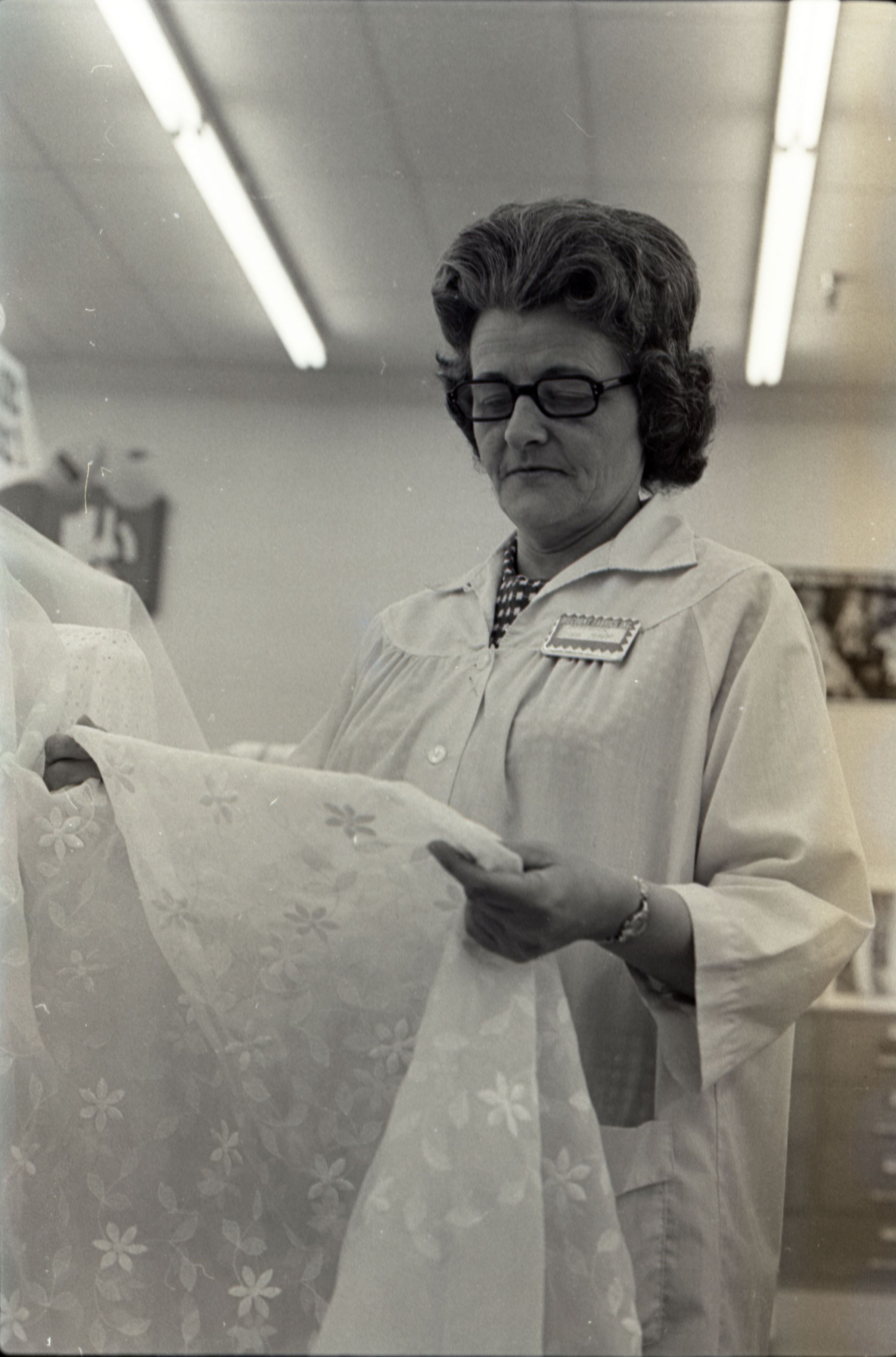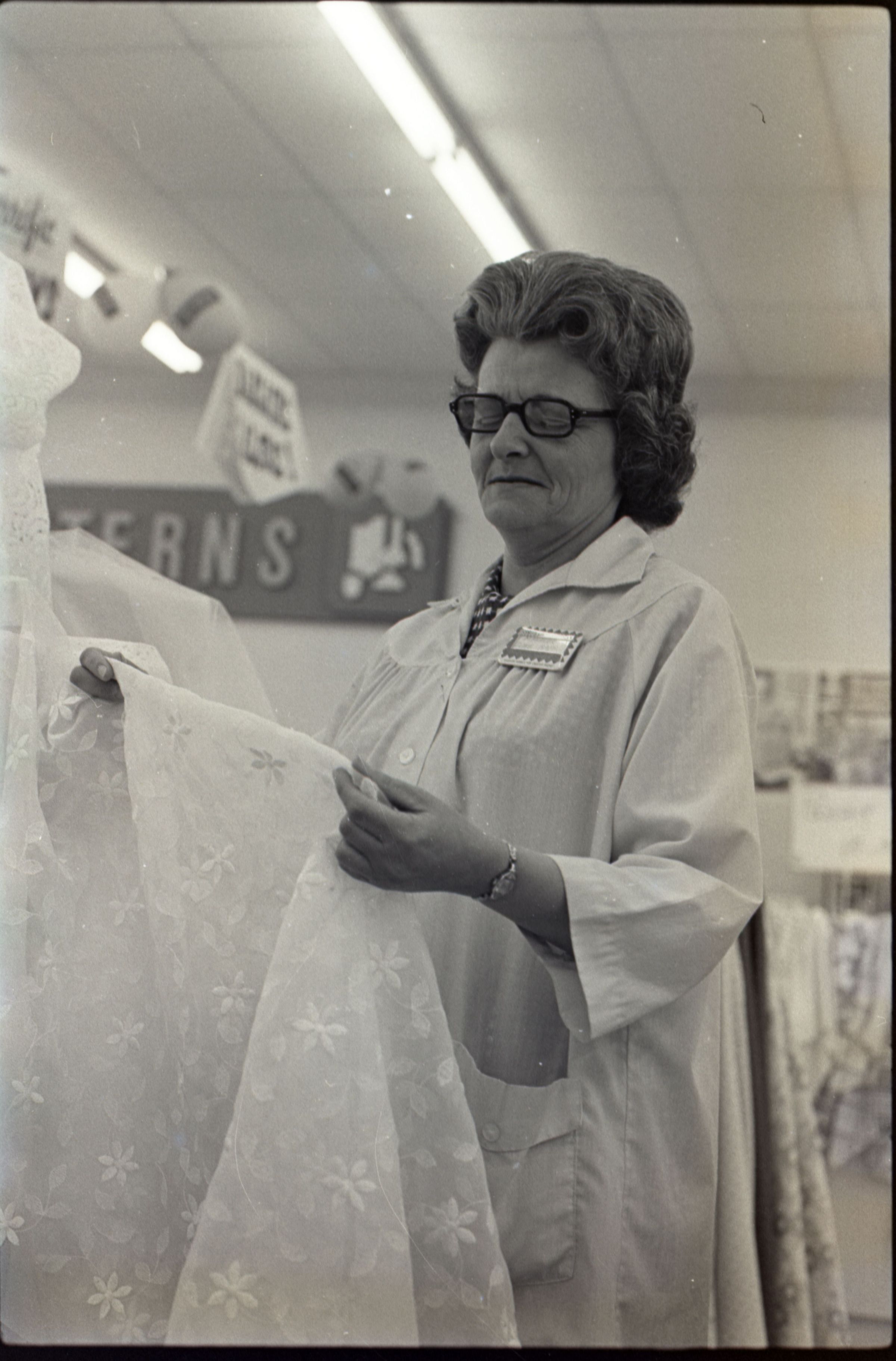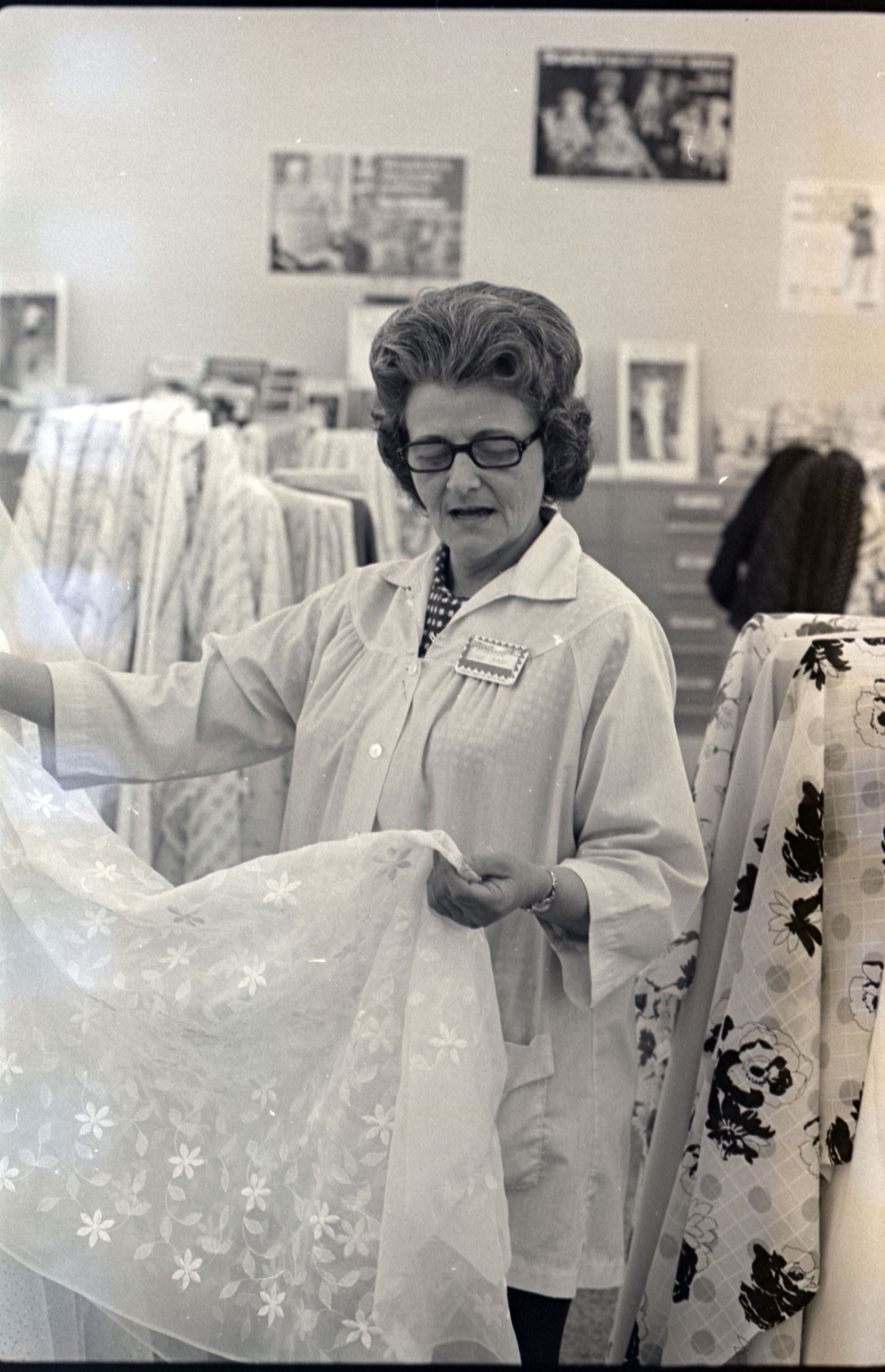 Discount Fabrics, 1974. These two black and white film negative strips were created for the Lacey Leader newspaper. These images show a woman (Ione Rapp) holding up a piece of fabric. This woman has swept-back hair and is wearing glasses and a jacket with 3/4 sleeves. She is wearing a nametag which identifies her as Ione Rapp, manager of the Discount Fabrics store.