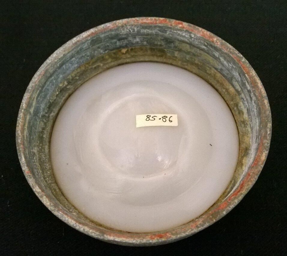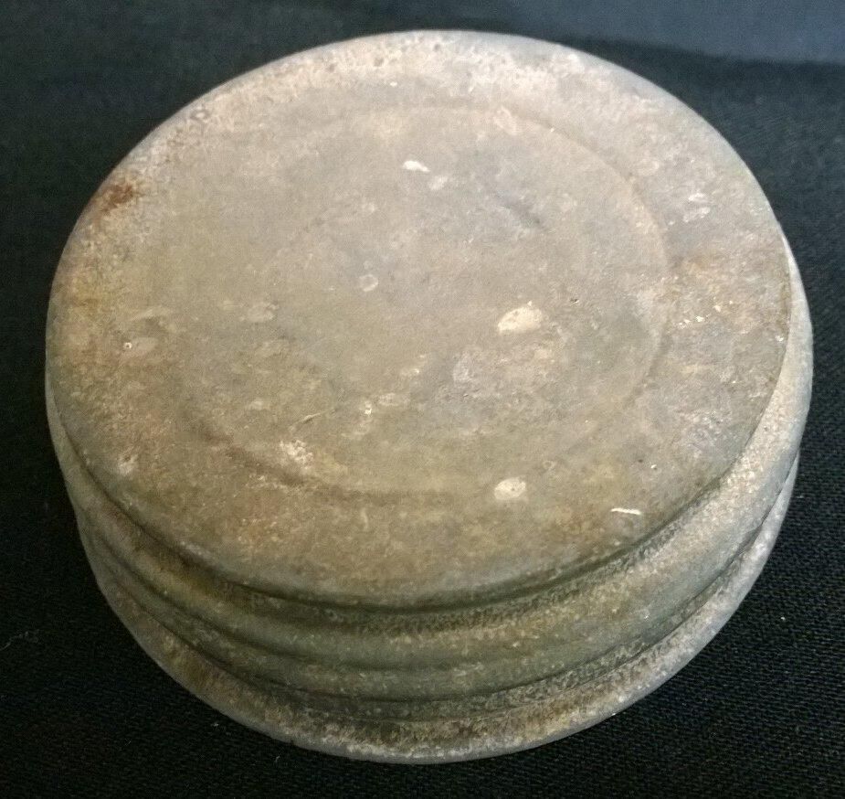 Zinc and glass lid for a canning jar. The gray lid has female threads to fit onto the male threads of a mason jar. The inside of the lid has a white milk glass liner. No embossings were detected on the lid or liner. The lid has concentric circles of 1" and 1.75" on the top, and the liner has concentric circles of a similar size. The zinc is heavily corroded, particularly on the inside with accretions/powdery white spots and also rust. There is some red coloring at the sealing edge possibly from contact with a rubber sealing gasket.Made/Created