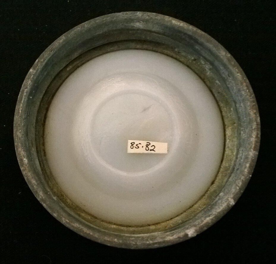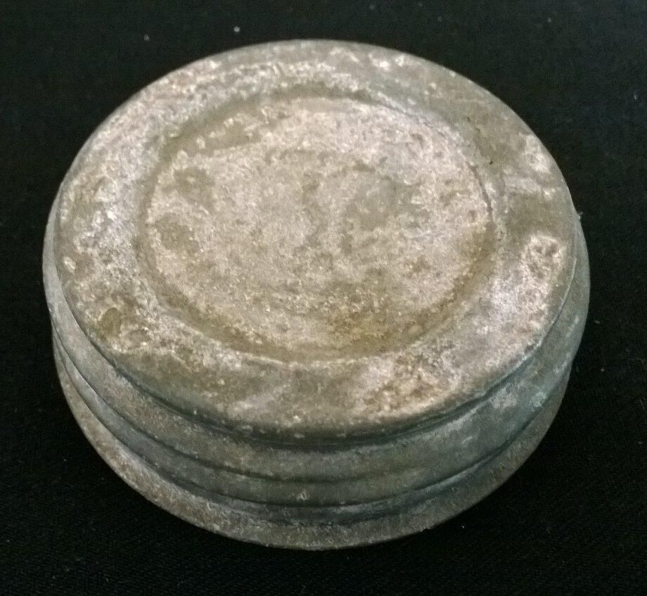 Zinc and glass lid for a canning jar. The gray lid has female threads to fit onto the male threads of a mason jar. There are 1" and 2" concentric circles impressed on the top. The inside of the lid has a white milk glass liner. The liner has a 1.25" circle in the center and a 1.75" protrusion in the glass. the zinc is corroded with accretions/powdery white spots. The sealing edge has a slight red coloring possibly from contact with a rubber sealing gasket.Lexicon
