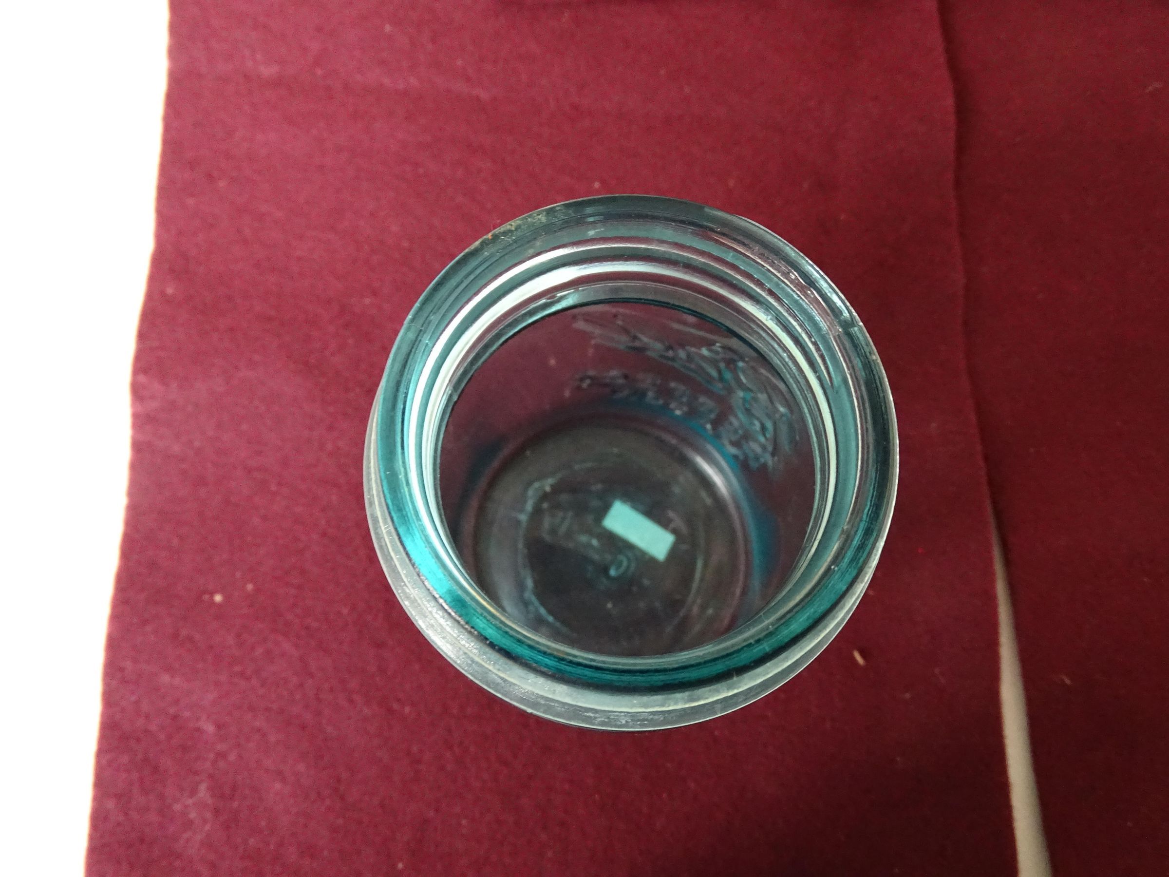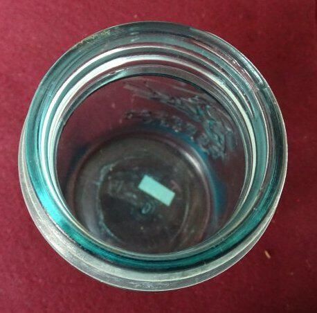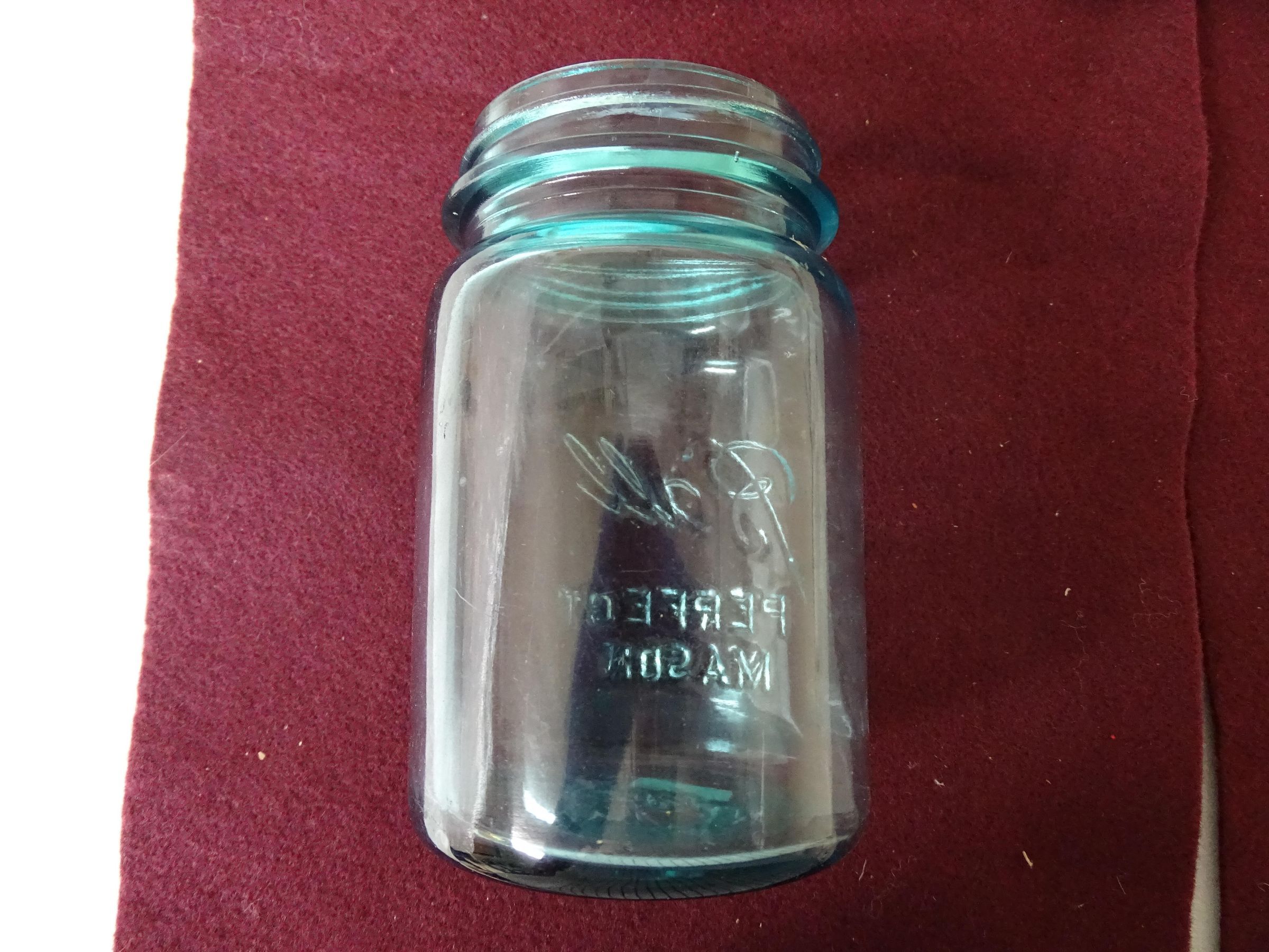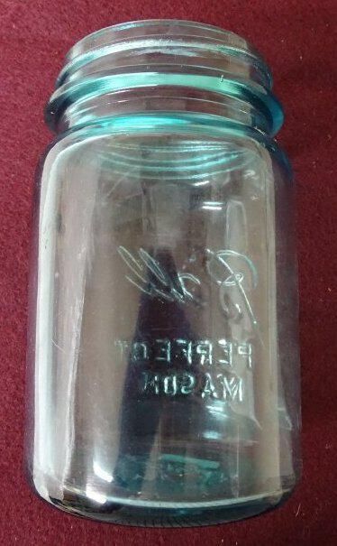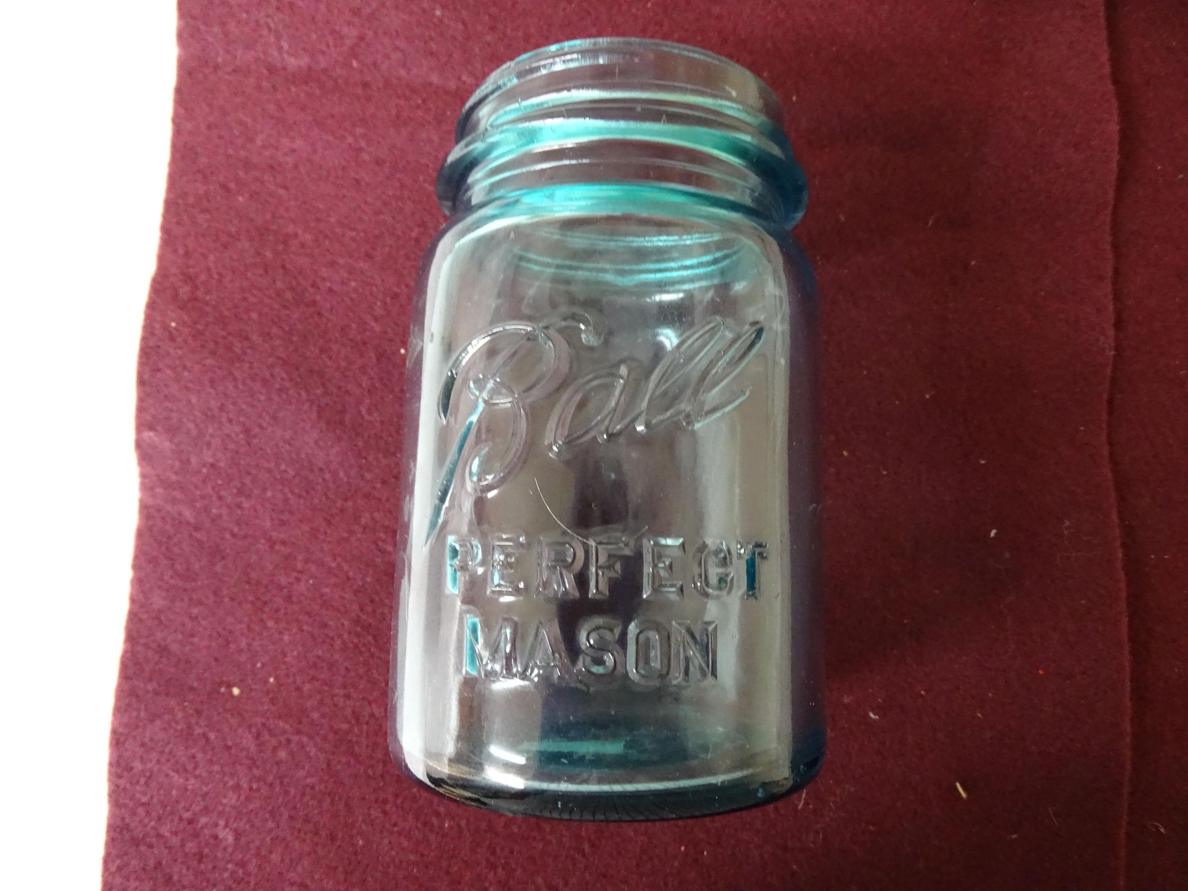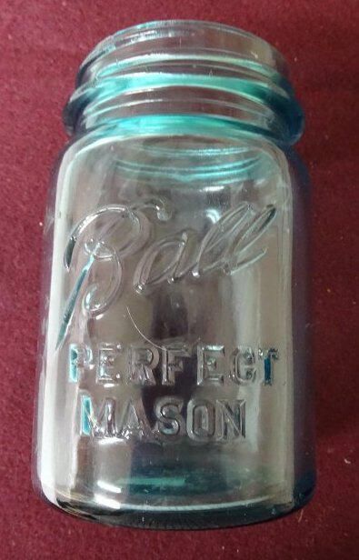 Light blue Ball 1 pint canning jar. The jar is cylindrical with screw threads at the top for a screw-on lid. There is a flat surface for a rubber seal. The mold seams on the side extend from the round seam on the bottom up to and over the lip. The seam on the bottom is circular with a second seam inside. There is a horizontal seam line where the mouth and base were attached. The following is embossed: On the side "Ball" and "Perfect Mason" On the bottom "9" with a short horizontal line below.Made/Created