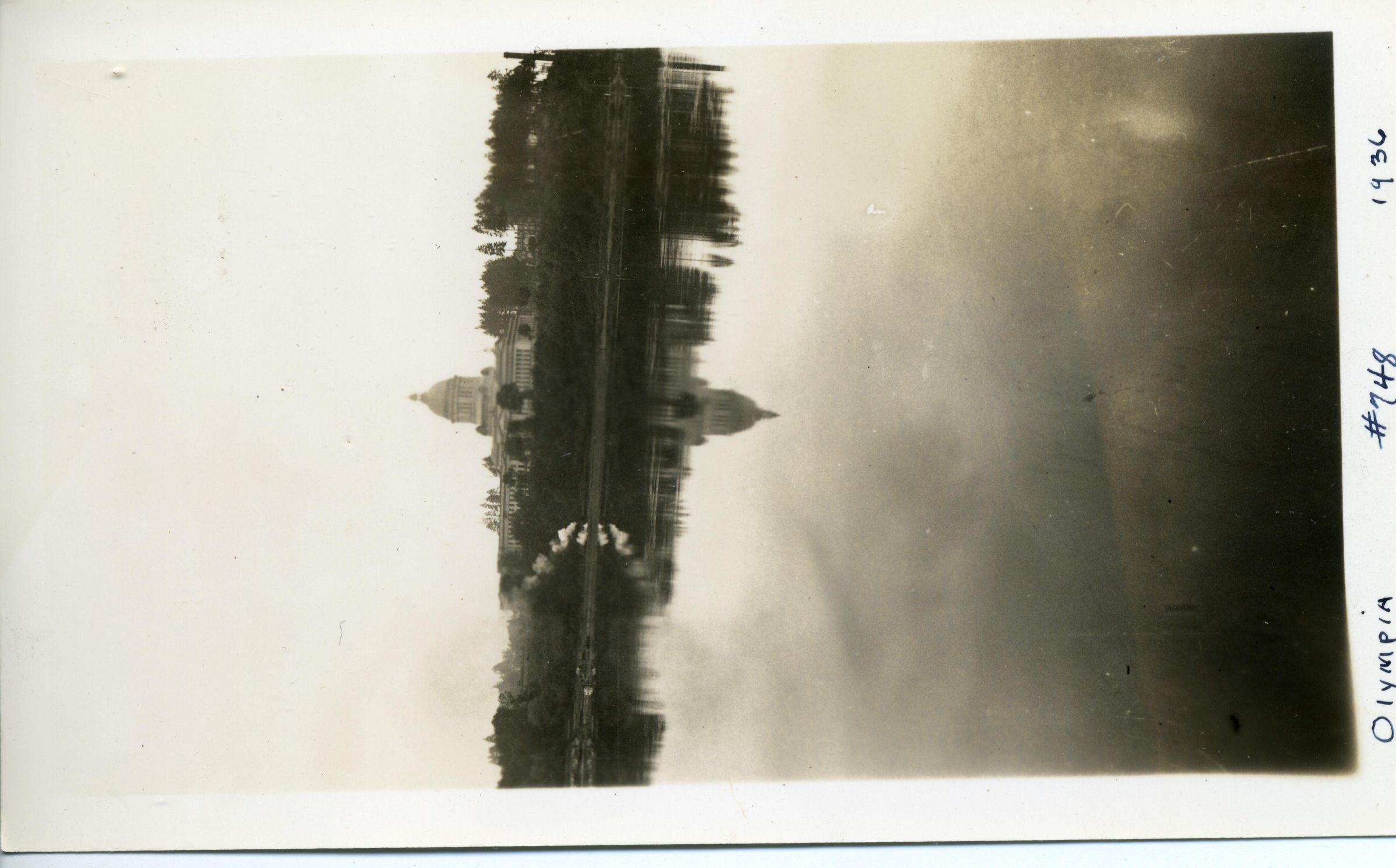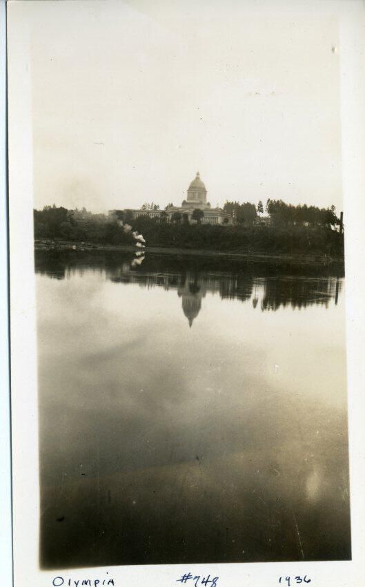Black and white photo of steam from a locomotive with the Capitol dome in the background. A large stretch of water is in the foreground, and the locomotive is not visible, but the steam suggests it is on a track at the bottom of a bluff below the Capitol group. There is a white border on all sides, and in the bottom border is "Olympia #748 1936" On the back is stamped a number that may include "57".