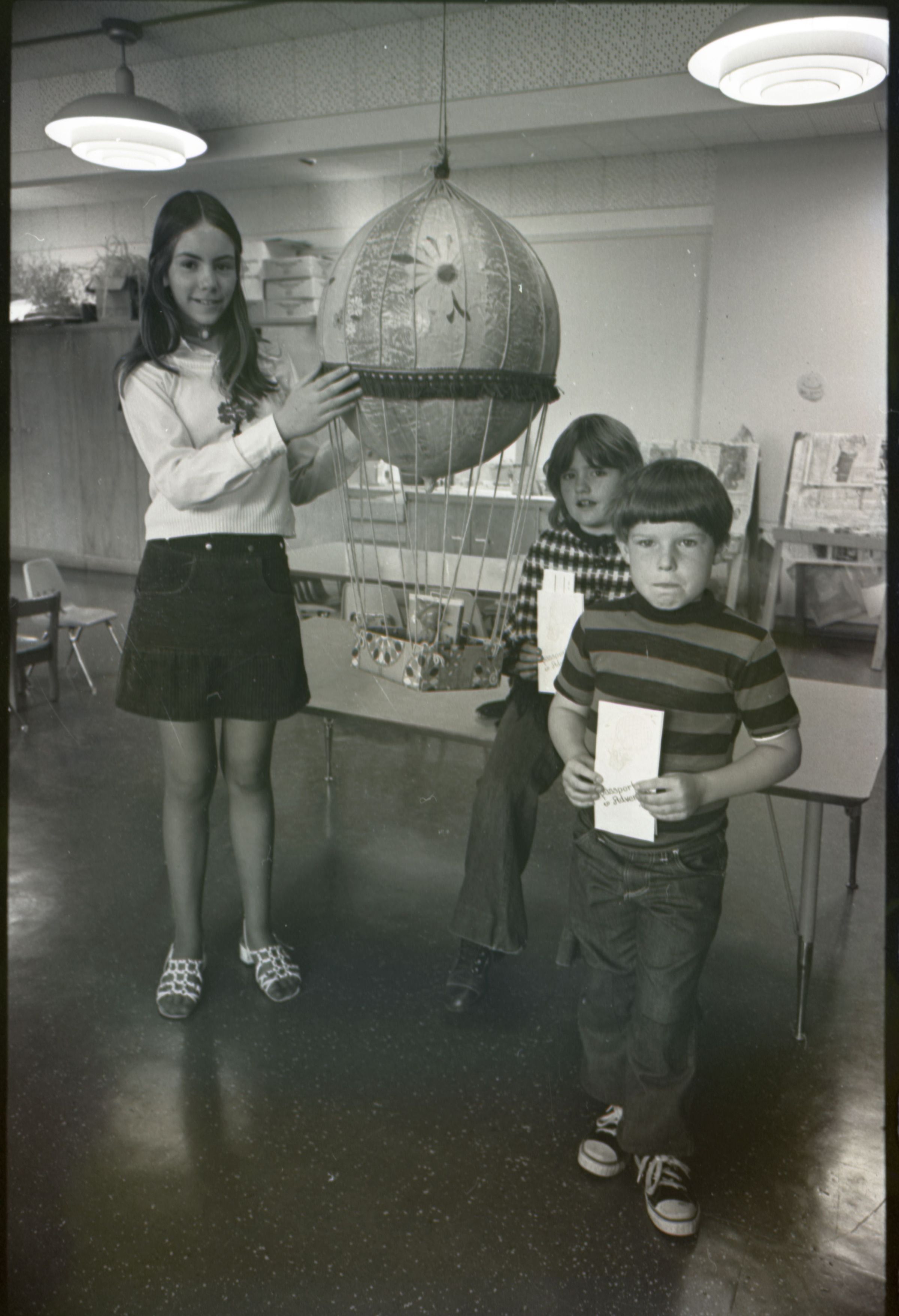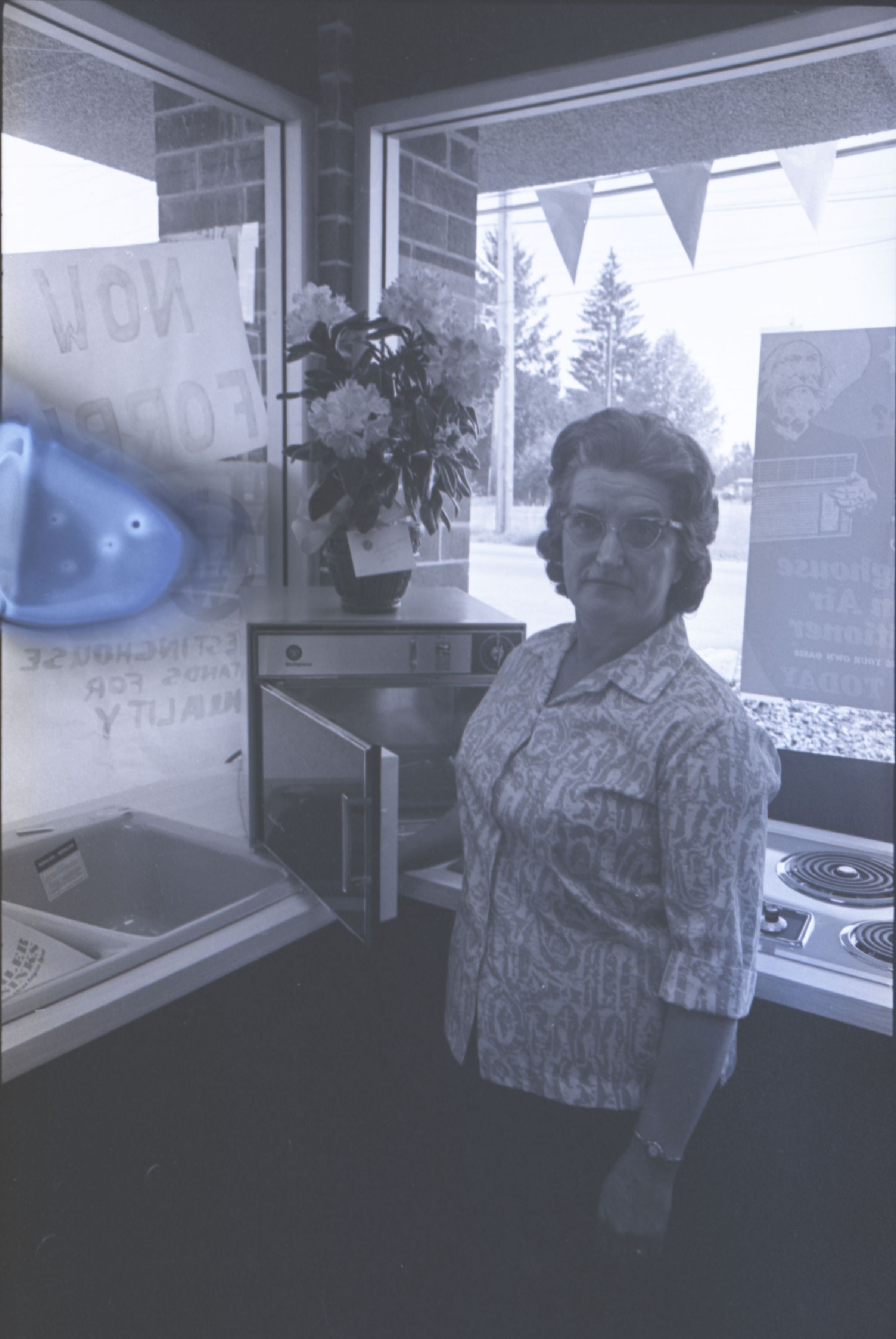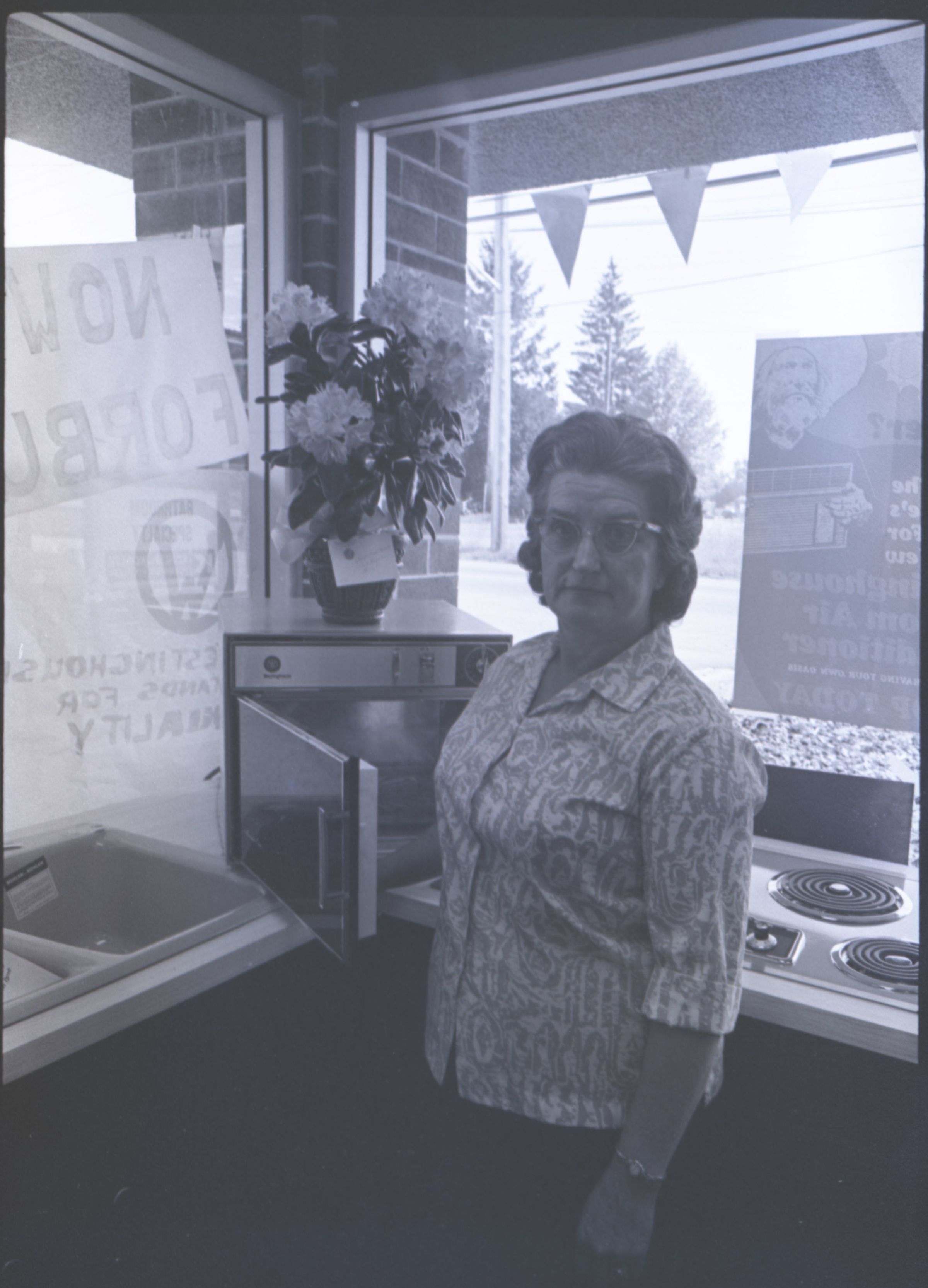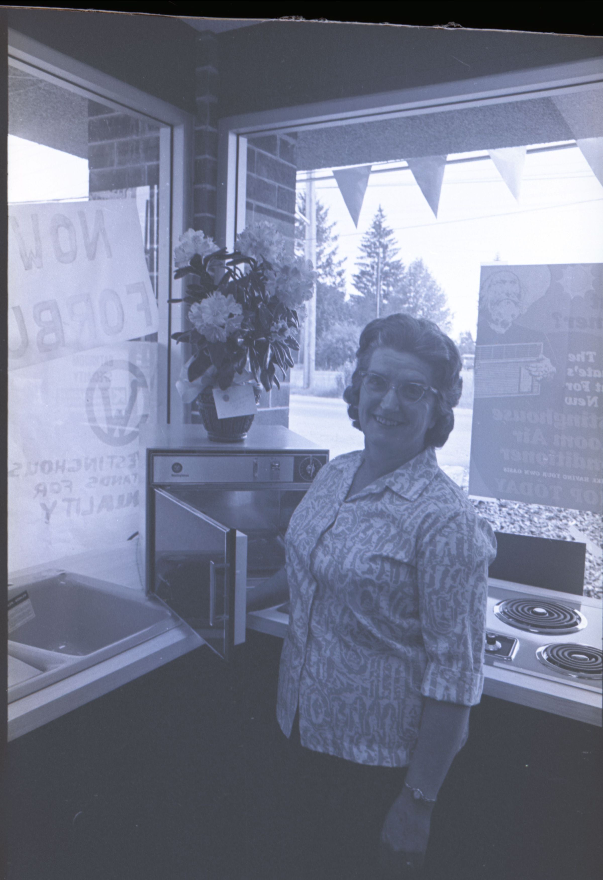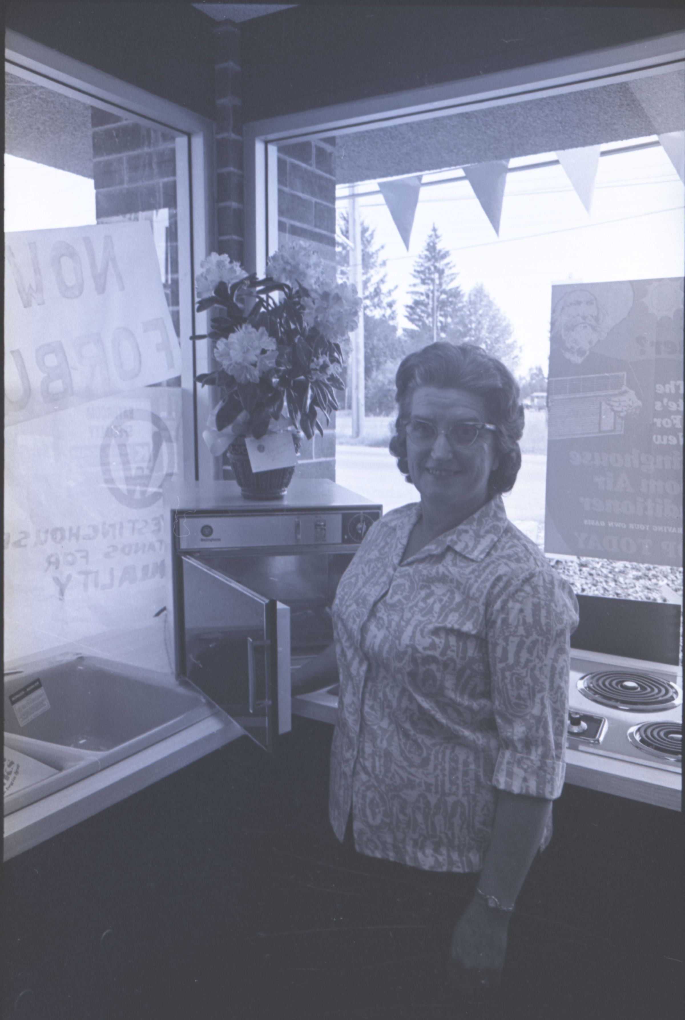 Chinook Middle School Award Winners, 1973. These four black and white film negative strips were created for the Lacey Leader newspaper. These images show children posing together for photos and a woman standing in front of an open microwave oven.Made/Created