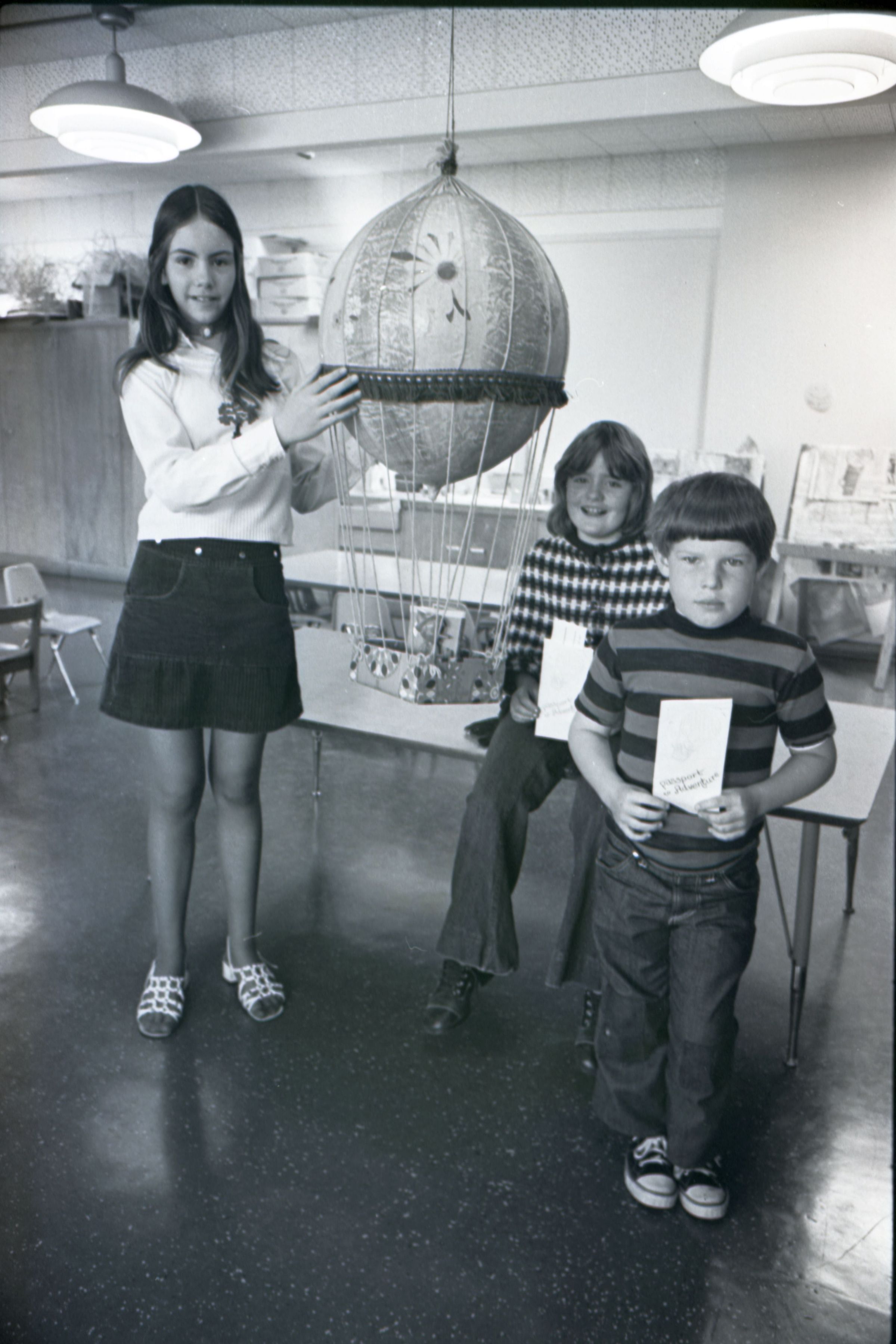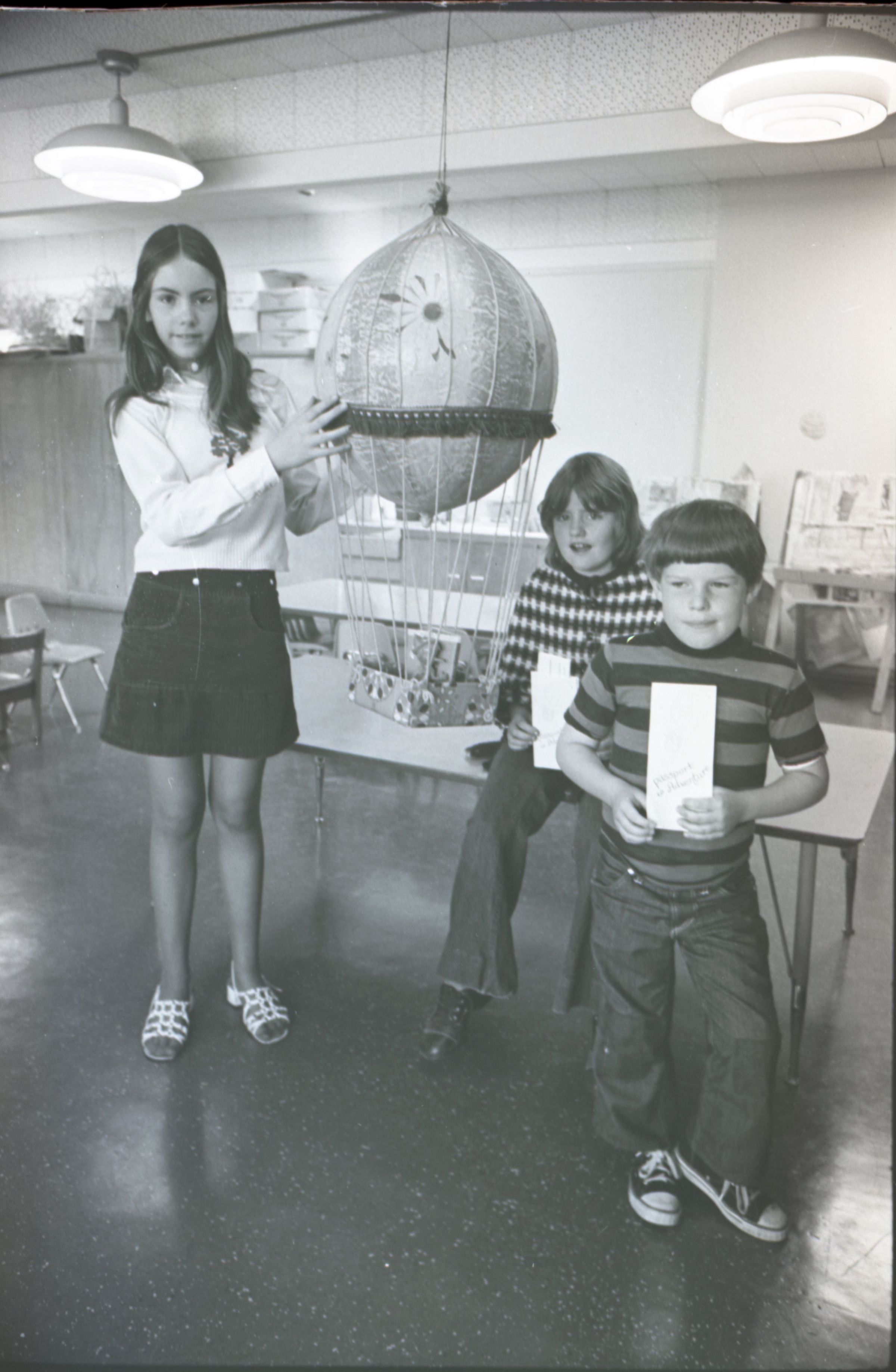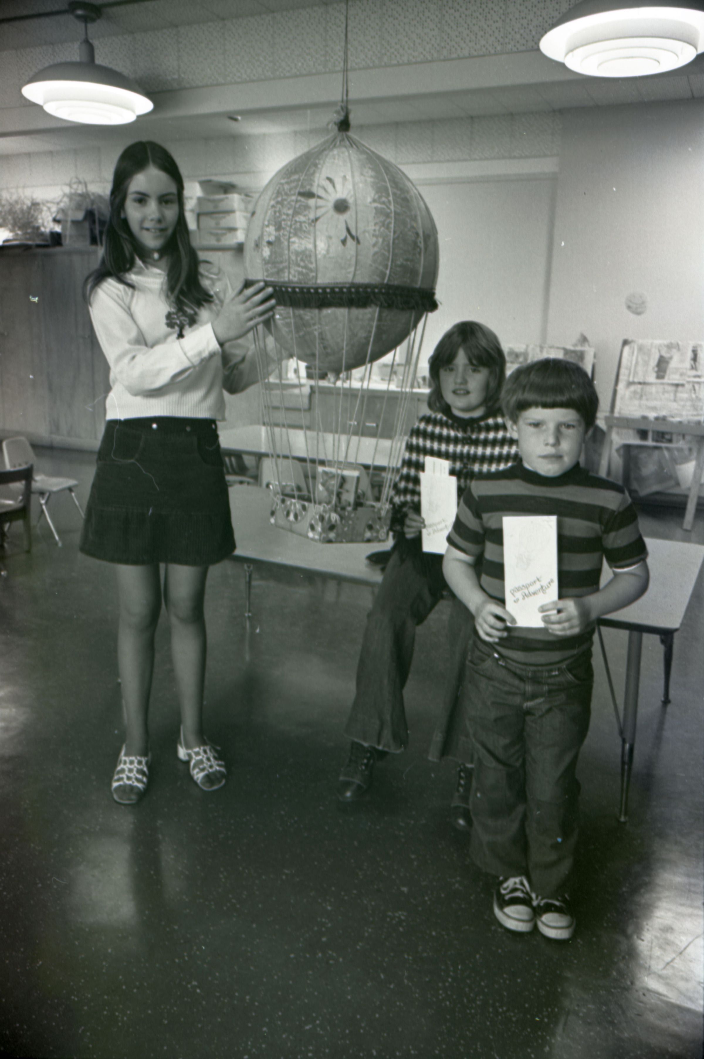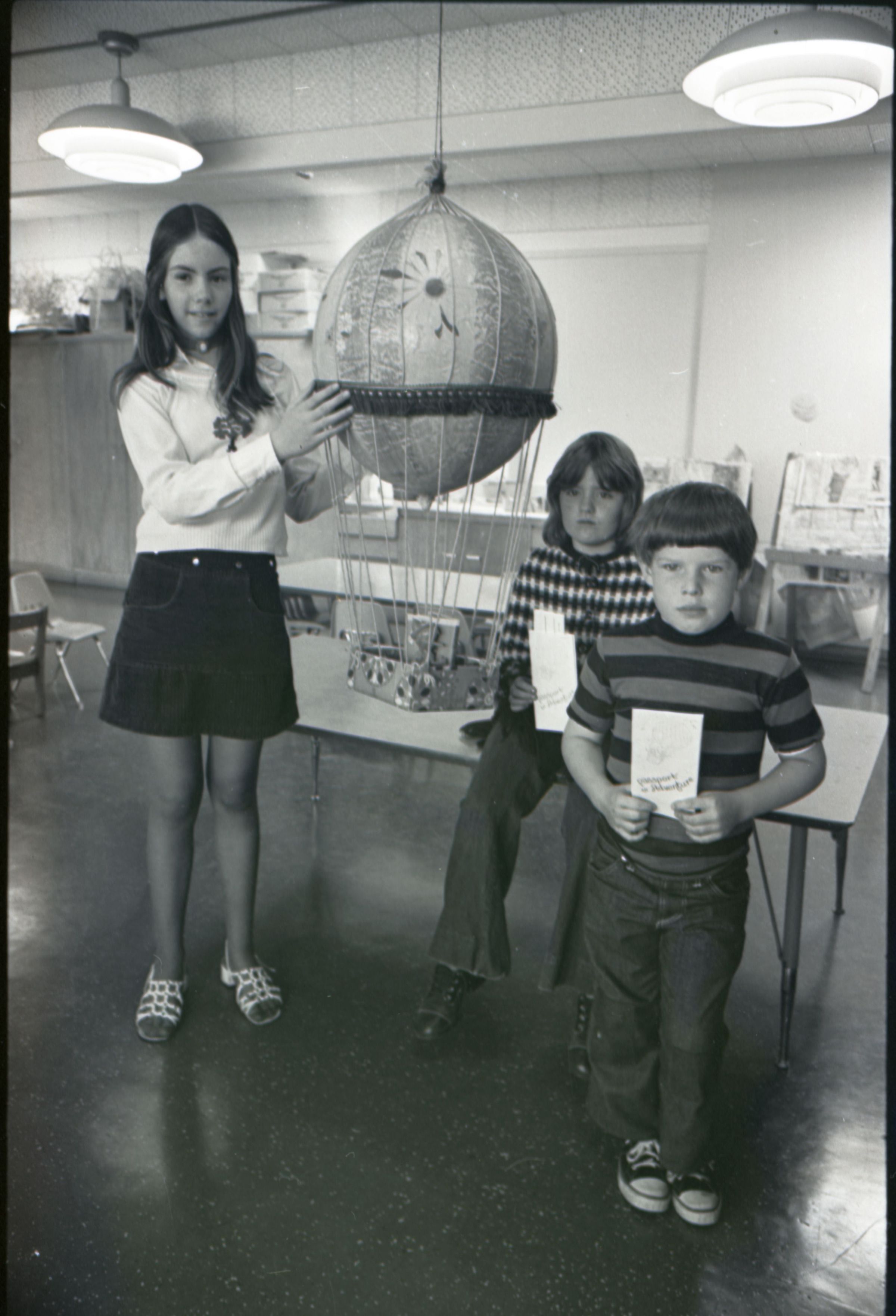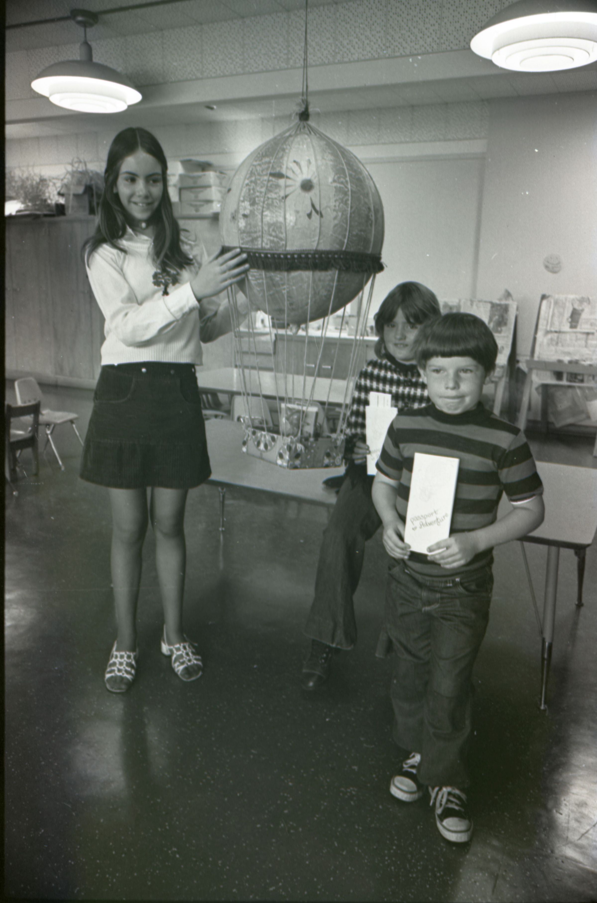 Chinook Middle School Award Winners, 1973. These four black and white film negative strips were created for the Lacey Leader newspaper. These images show children posing together for photos and a woman standing in front of an open microwave oven.Made/Created