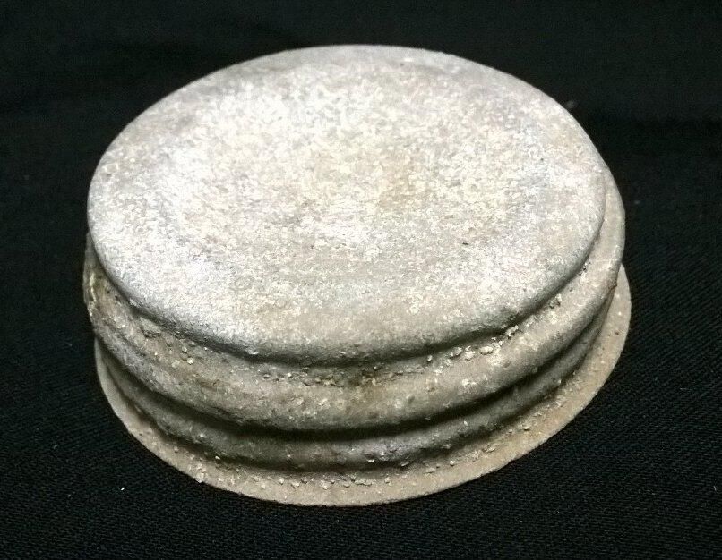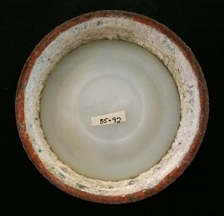 Zinc and glass lid for a canning jar. The gray lid has female threads to fit on the male threads of a mason jar. The inside of the lid has a white milk glass liner. No embossings were detected on the lid or liner. The lid has concentric circles of 1" and 1.75" on the top, and the liner has a 1" circle. The zinc is heavily corroded, particularly on the inside with accretions/powdery white spots and also rust. There is distinct red coloring at the sealing edge, possibly from contact with a rubber sealing gasket.Made/Created