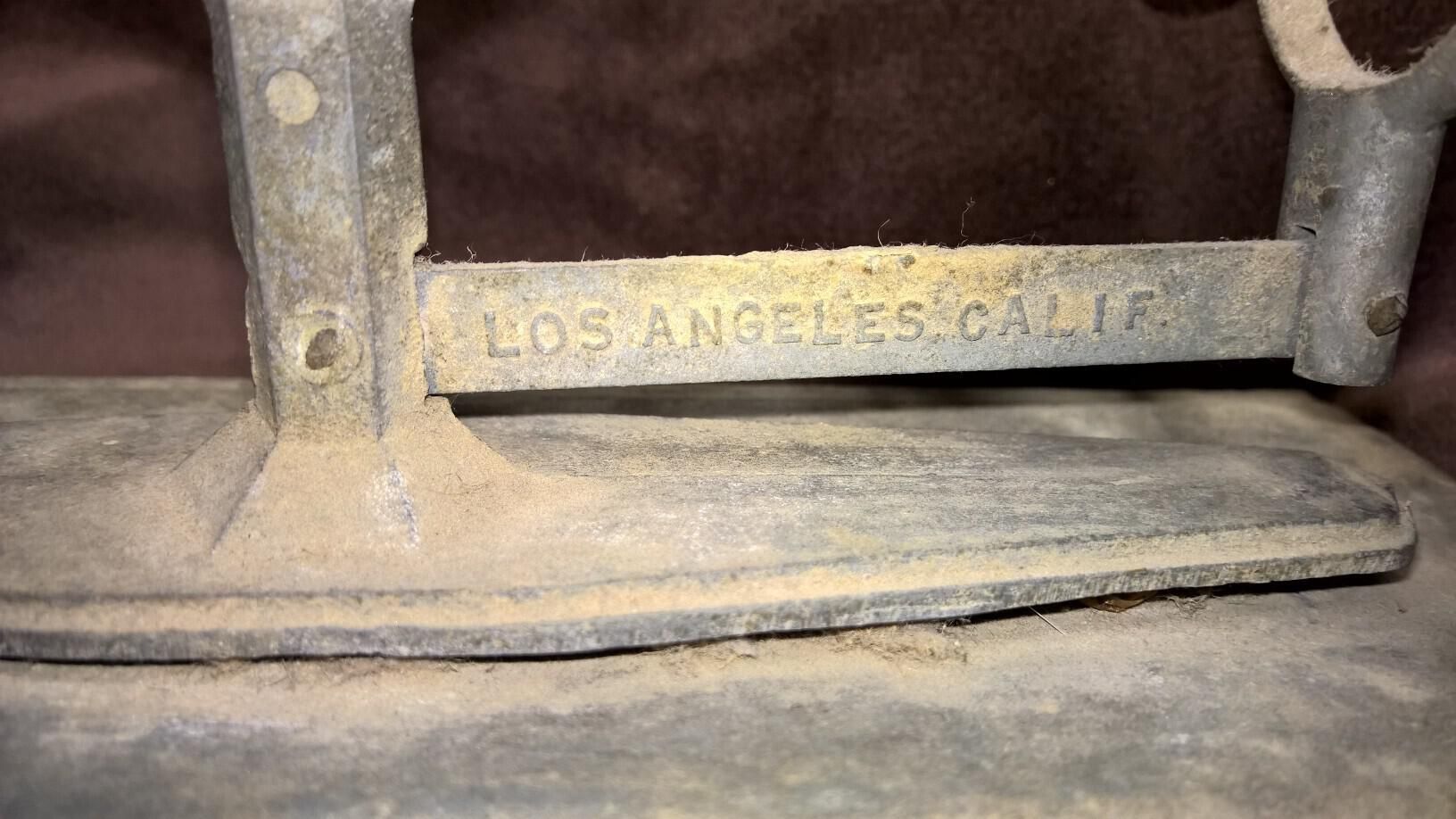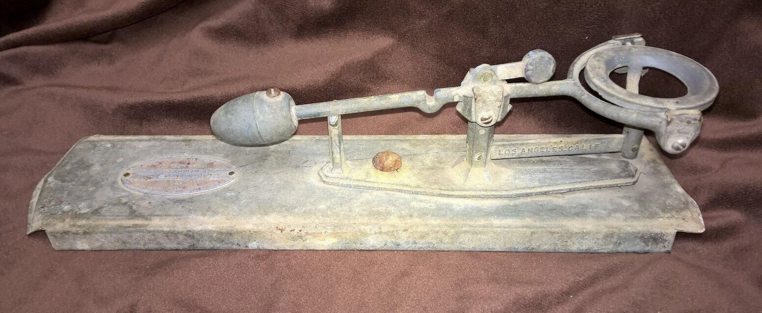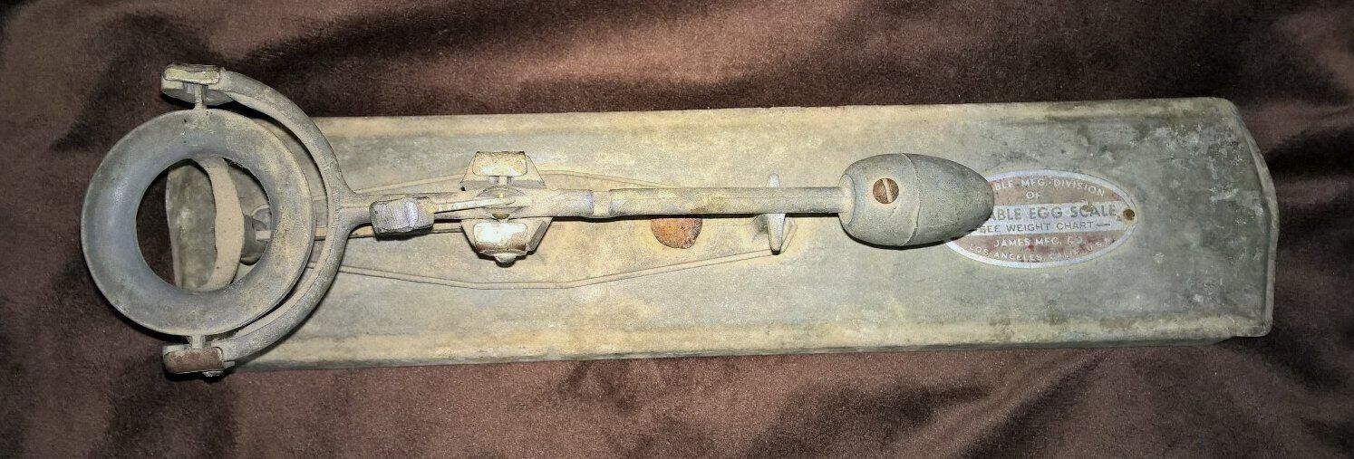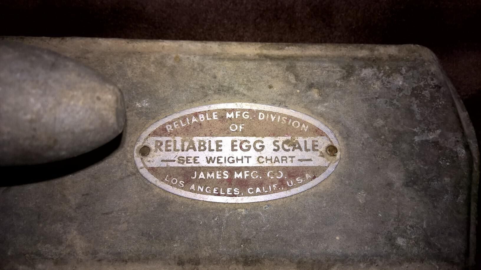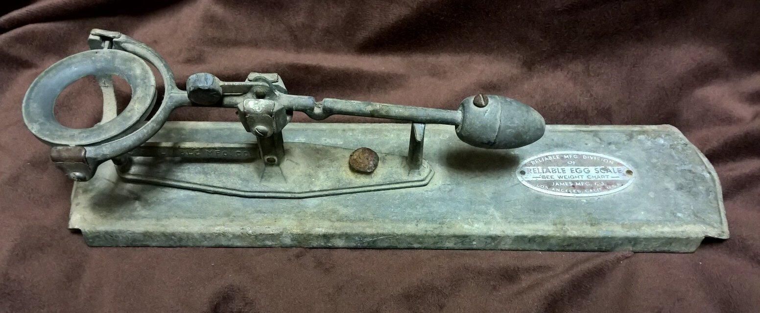Metal balance scale for weighing and classifying eggs. The scale consists of a flat metal platform with the edges bent to form legs, on which is bolted a balancing assembly. The assembly has a pivot rod with a ring on one end in which an egg can be placed, and a weight at the other end. There is a smaller weight above the pivot point that can be shifted from one side to the other. The pivot rod is supported by a metal framework. An oval shaped metal piece is riveted to the platform with the following printed thereon: "Reliable Mfg. Division of James Mfg. Co. Los Angeles Calif. USA Reliable Egg Scale See weight Chart". On a shaft that is part of the balancing assembly, is cast on one side "Reliable Mfg Co" and on the other side "Los Angeles Calif". The balancing assembly is slightly pulling away from the platform at one end. One end of the platform is bent unevenly.