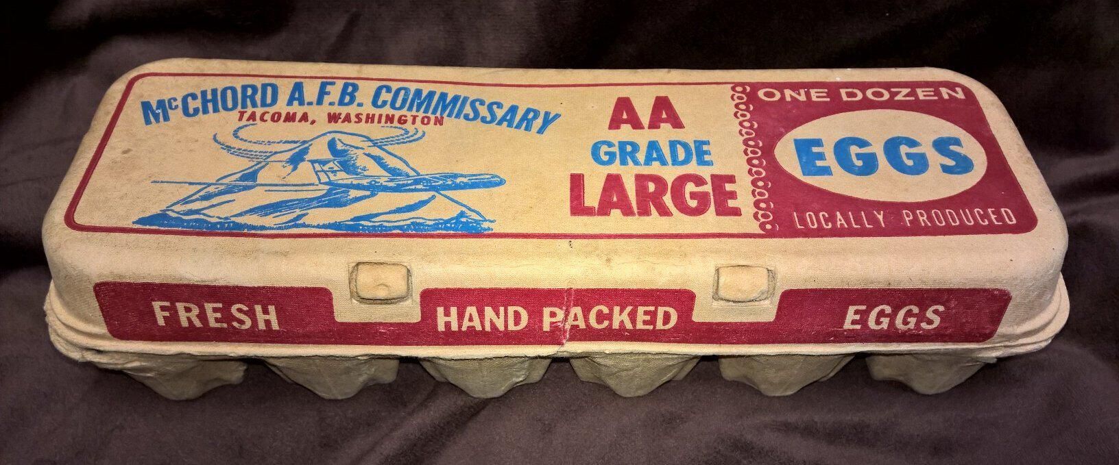 Pressed paper-pulp one-dozen egg carton with a folding top. The carton has 12 separate spaces for whole eggs. The spaces are separated by cone-shaped center divisions and small walls. There is a crease in the center that would facilitate breaking the carton into two 6-egg cartons. The top of the carton is printed in blue and red ink. On the top is "McChord A.F.B. Commissary, Tacoma Washington" above an image of a mountain with an aircraft in front of it, "AA Grade Large" and "One dozen eggs locally produced". On one side of the top is "Fresh Hand Packed Eggs" On the other side of the top is "Packed by Yates Eggs Olympia, Washington 98501". Pressed into the closing flap are numbers appearing to be "99" and "895". Other information is pressed into the flap but is unreadable.
