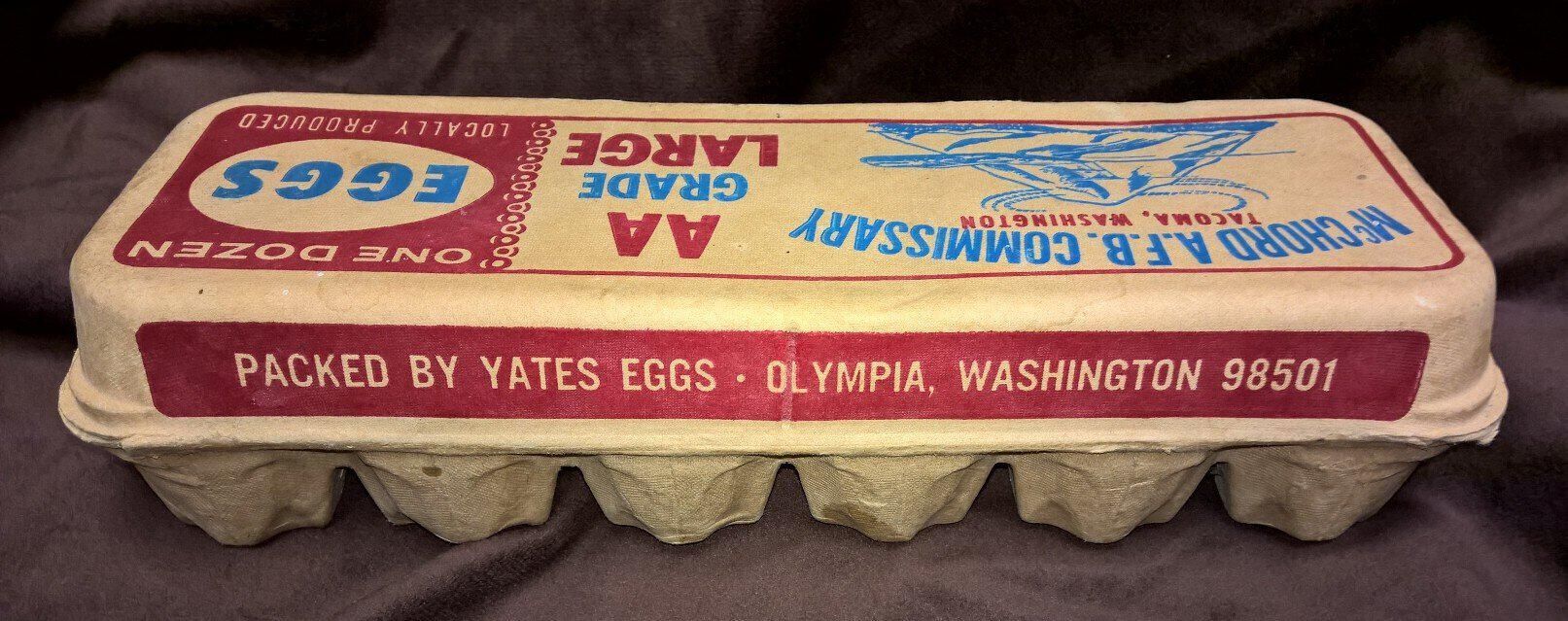 Harold Yates created the design of this egg carton for McChord Air Force base. Yates Egg Farm was located on Carpenter Road in Lacey.Made/Created