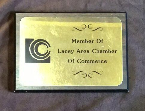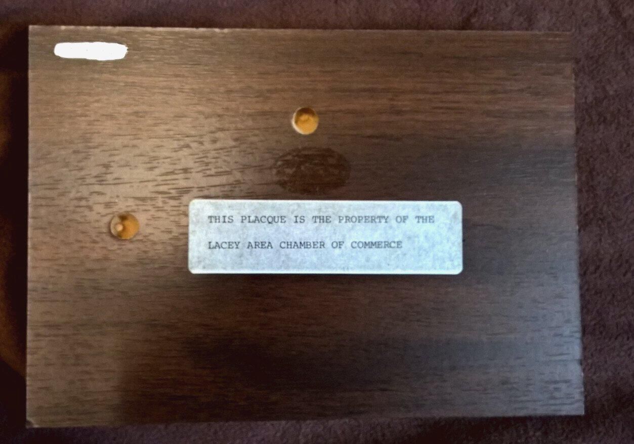 Wooden plaque with a brass plate on which plate is printed a stylized logo with two "C"s and "Member of Lacey Area Chamber of Commerce" between curly lines. On the back is a piece of paper with "This plaque is the property of the Lacey area Chamber of Commerce". This is probably for A. G. Homann Construction.Made/Created
