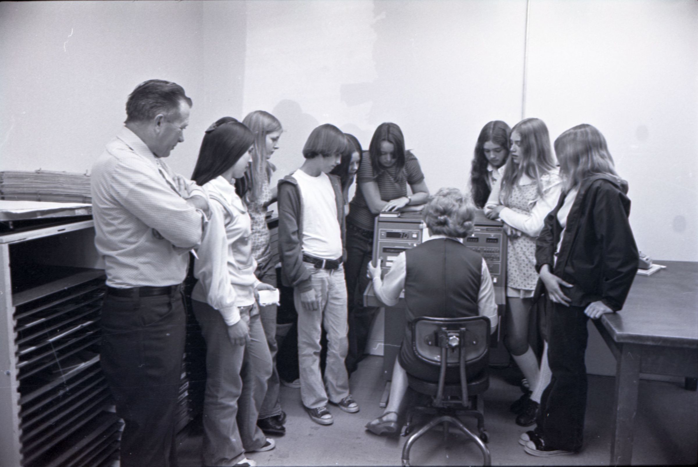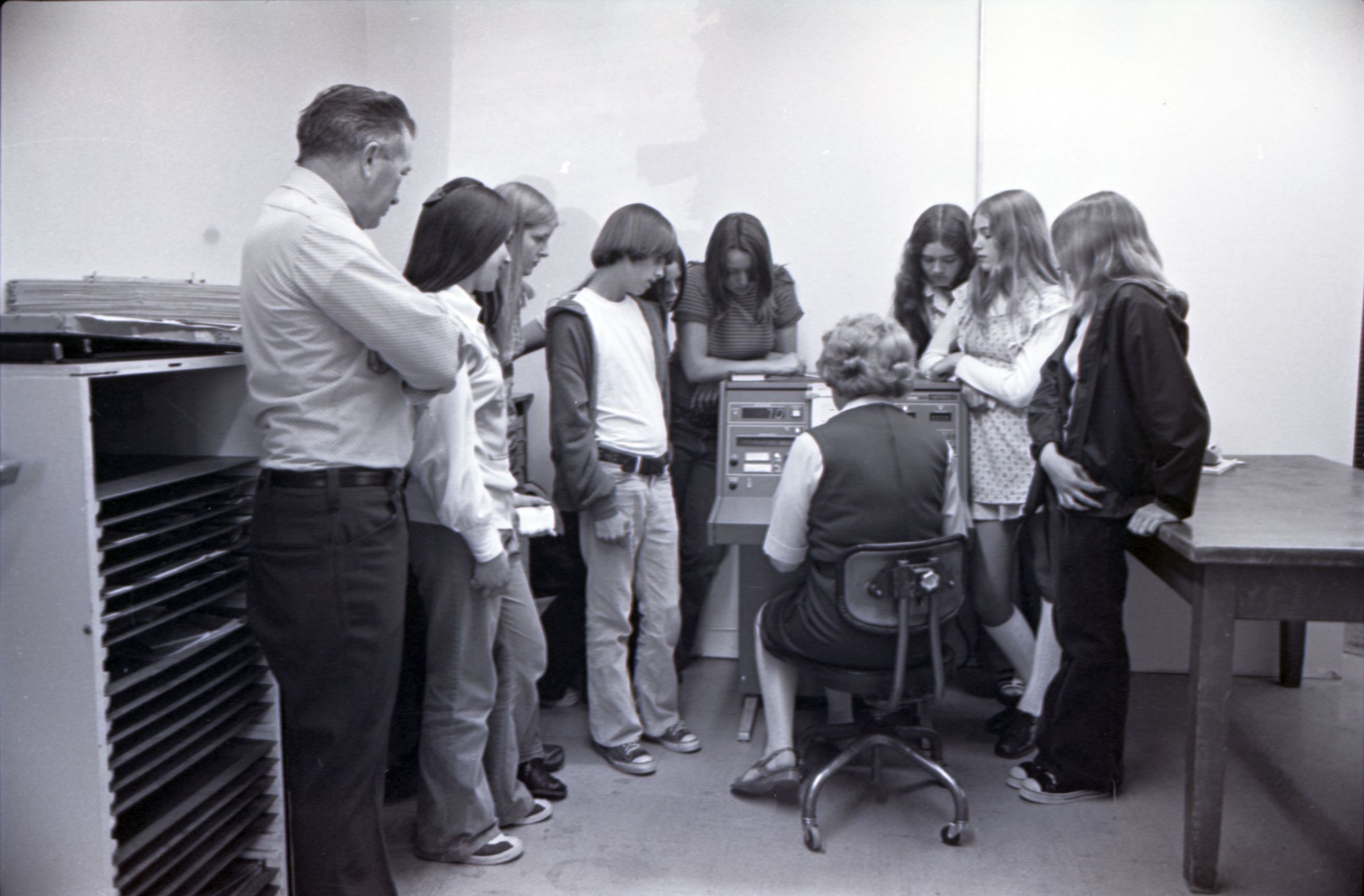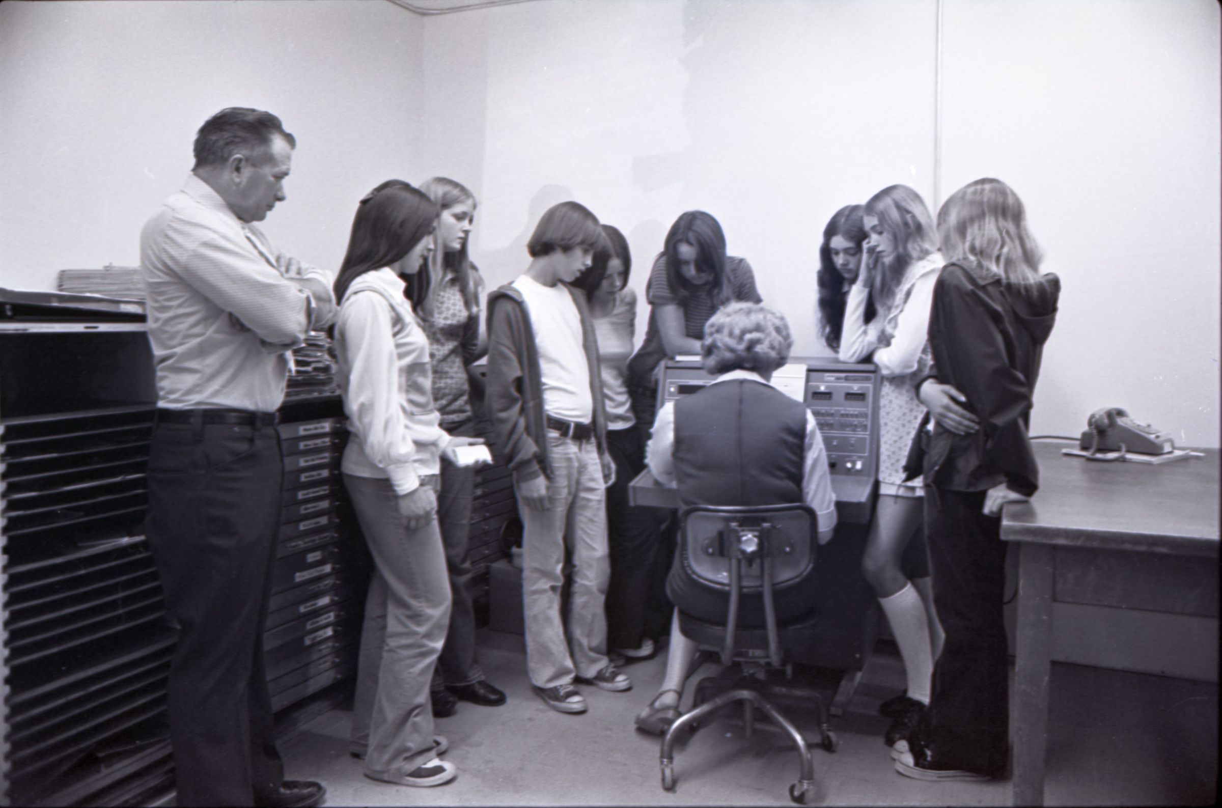 Tumwater Junior High Lacey Leader Tour, 1973. This single black and white film negative strip was created for the Lacey Leader newspaper. These images show eight young people and one man watching a woman operate a piece of electronic equipment which may be an early computer.Made/Created