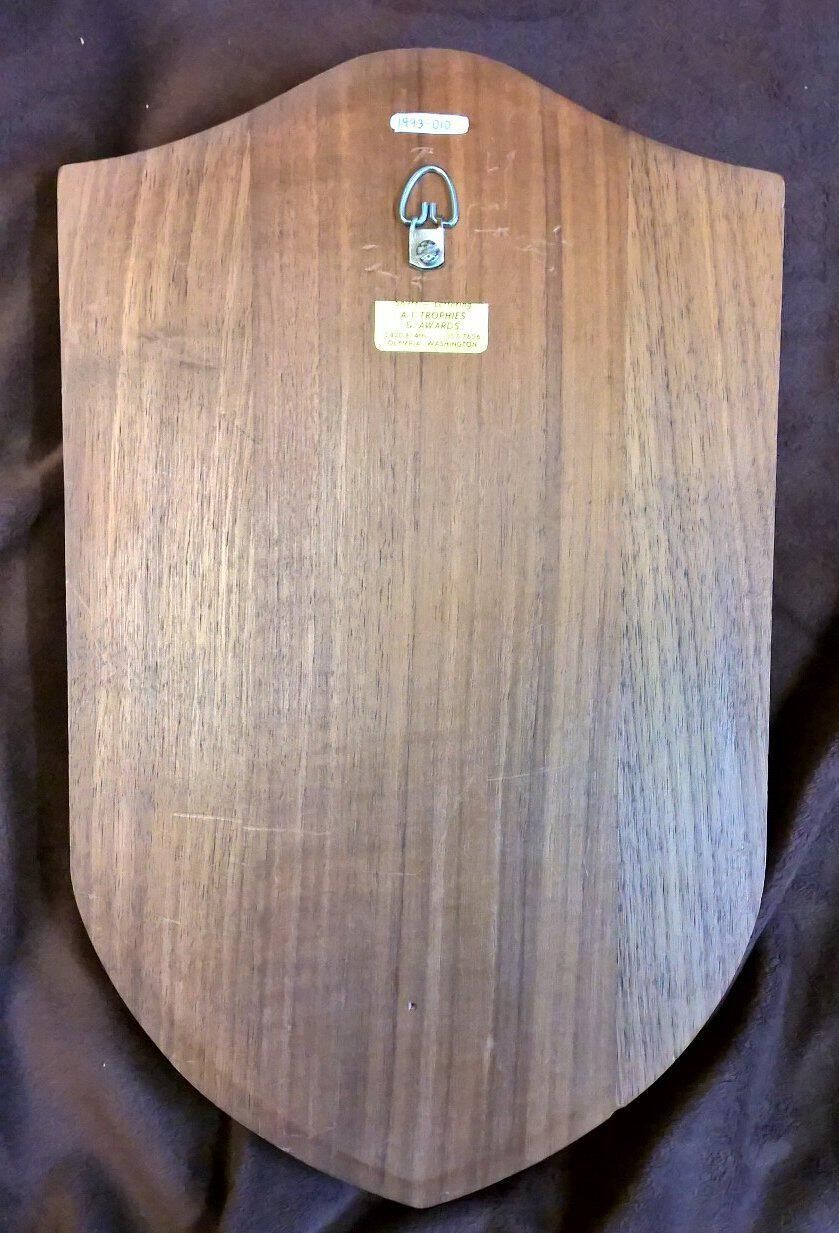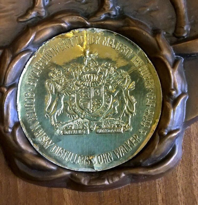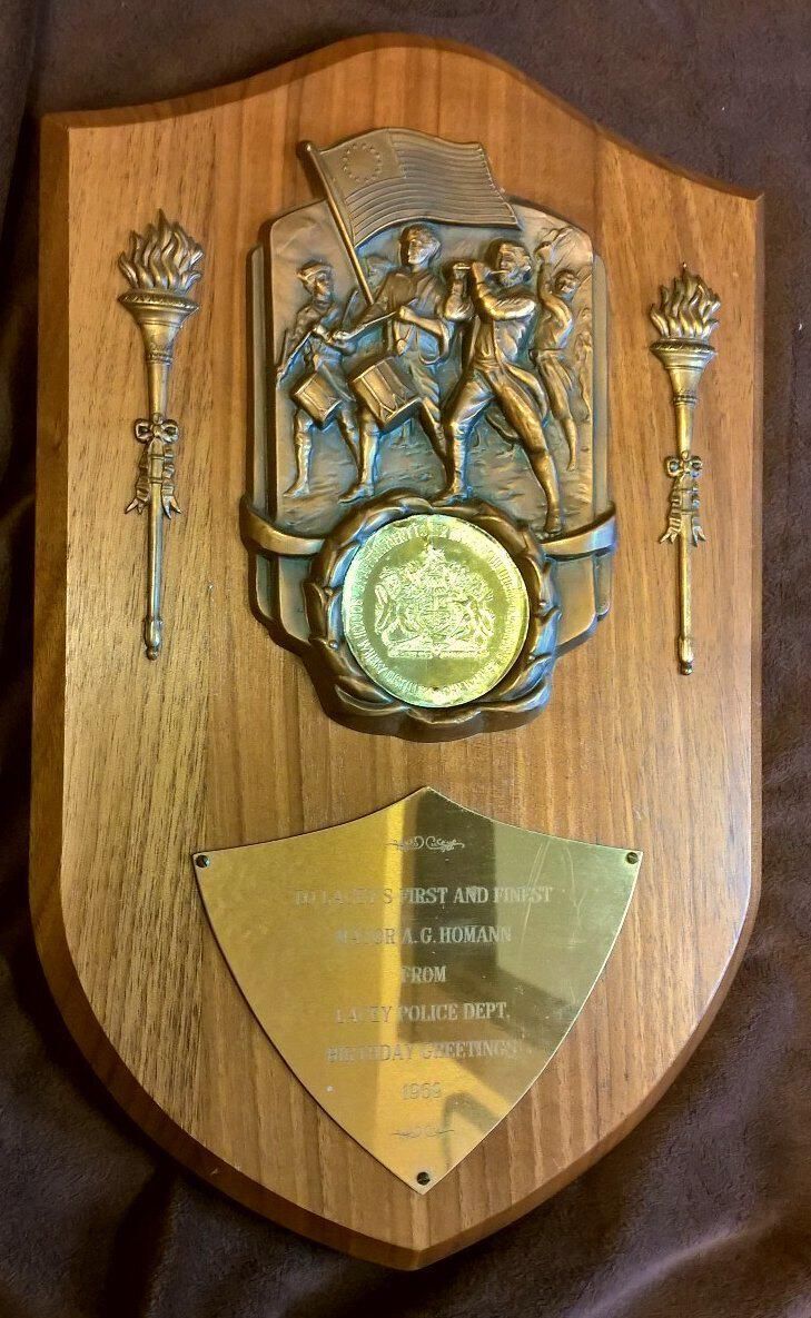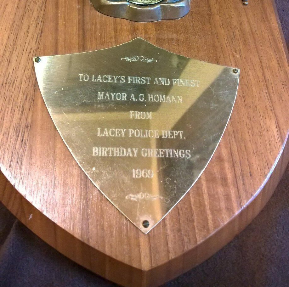 Wooden plaque with a brass plate, two brass torches, and a brass relief of the Revolutionary fife and drum solders plus a circular seal with the British emblem, and around the outside of the circle "By appointment to Her Majesty the Queen, Scotch Whisky Distillers John Walker & Sons Ltd". Brass plate is on lower half of plaque and is shield shape. Etched into it is: 'To Lacey's First and Finest Mayor, A. G. Homann, From Lacey Police Dept., Birthday Greetings, 1969". On the back is a sticker with "A-1 Trophies & Awards, 2420 E. 4th 357-7656, Olympia, Washington" and a loop for hanging.Made/Created