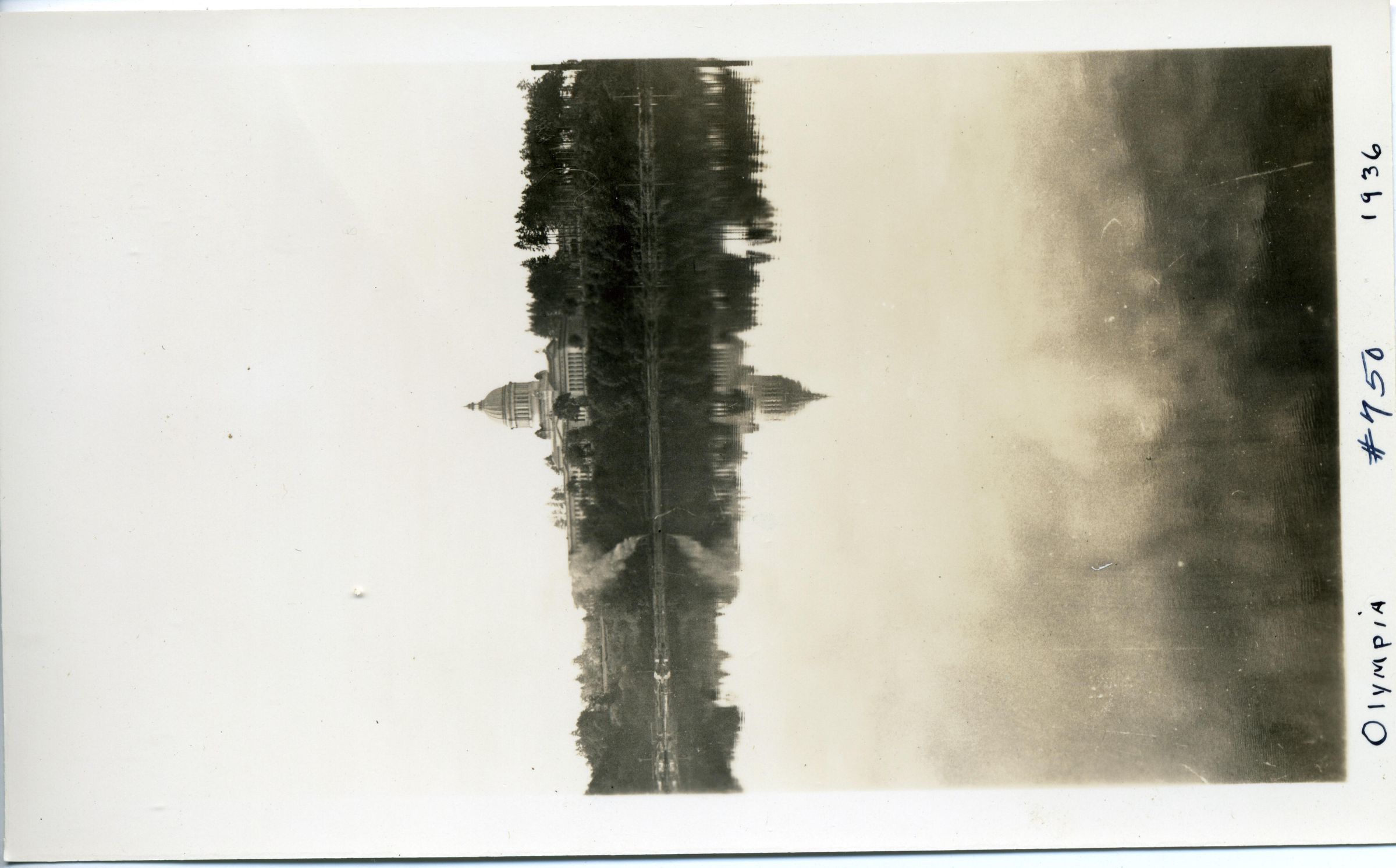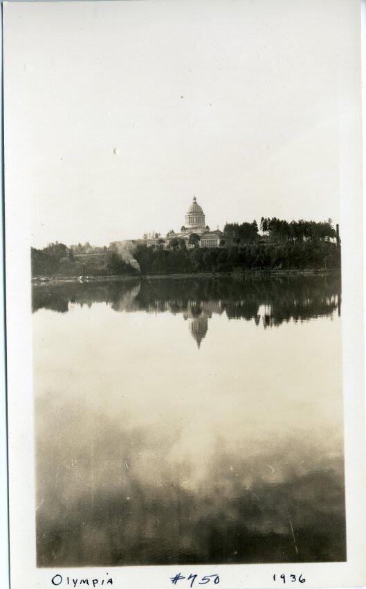 Black and white photo of the Capitol group and some reflections. In the foreground is a body of water and in the center is the Capitol group and reflections of steam from a locomotive. The locomotive is not visible, but the steam suggests it is on a track at the bottom of a bluff below the Capitol group. There is a white border on all sides, and in the bottom border is "Olympia #750 1936". On the back is "443".