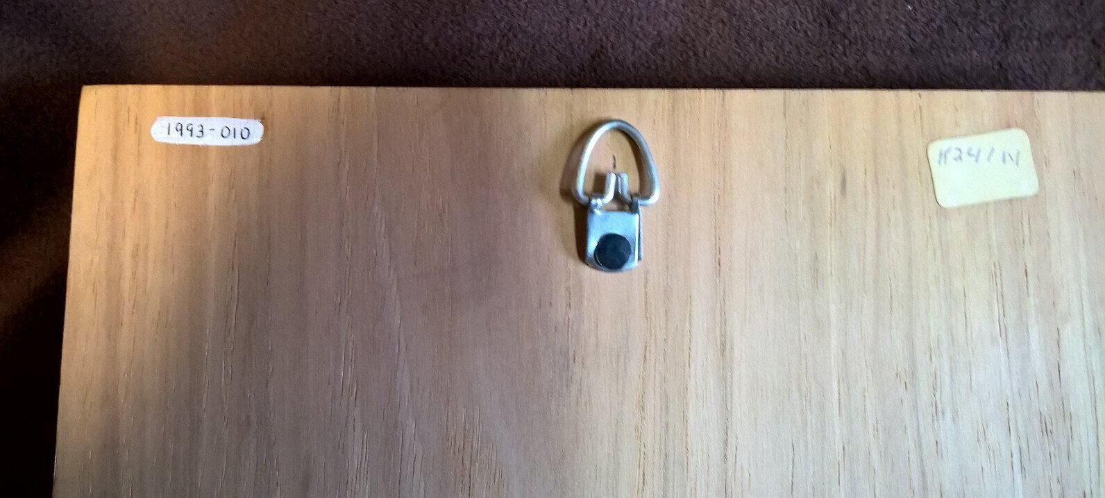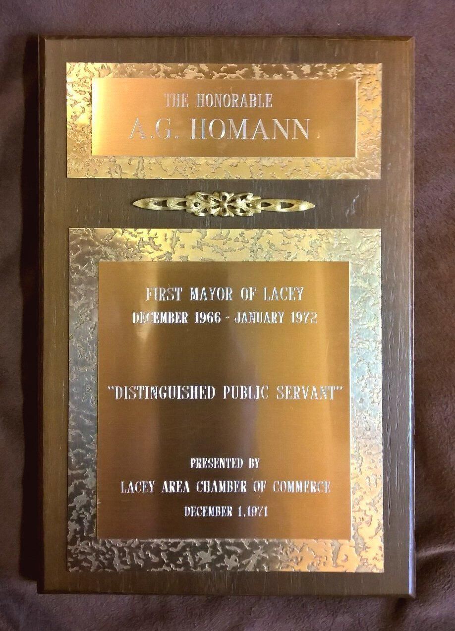 Wood and brass plaque. Two double brass plates are attached to the wood with a brass decorative design affixed with brass pins between the plates. The double plates consist of a brass plate with a stippled design over which is affixed a clear brass plate on which words are etched. On the top double plate is "The Honorable A. G. Homann". On the lower plate is "First Mayor of Lacey December 1966 - January 1972" and "Distinguished Public Servant" and "Presented by Lacey Area Chamber of Commerce December 1, 1971". On the back of the plaque a D-ring is attached for hanging and a sticker adhered with "K24iiy" written on it.Made/Created