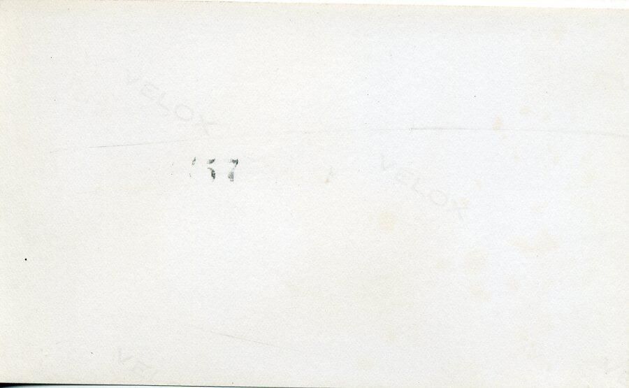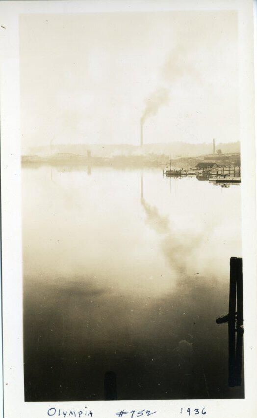 Black and white photo of Budd Bay and the smokestack of a veneer plant. The smoke from the stack is reflected in the water. On the right side are pilings and a structure with a dock. There is a white border on all sides, and in the bottom border is "Olympia #752 1936". On the back is what appears to be "557".