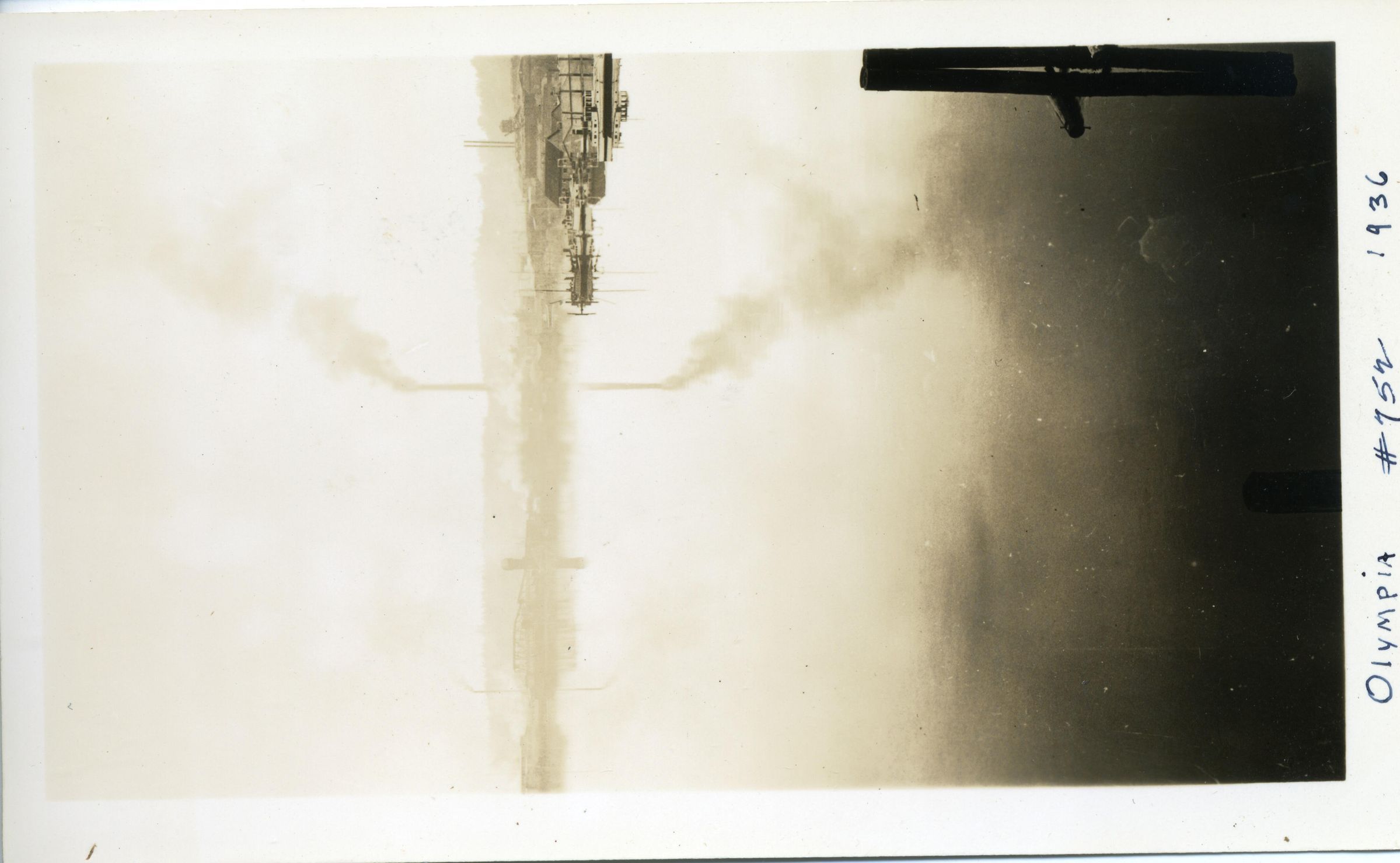 The photo is inserted along with a negative of the image into a cream colored envelope that has typed "Olympia 1936 ? Reflection of stack of Washington Veneer Company". Stamped is "752" and "indexed".Made/Created