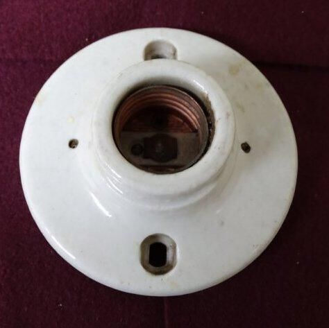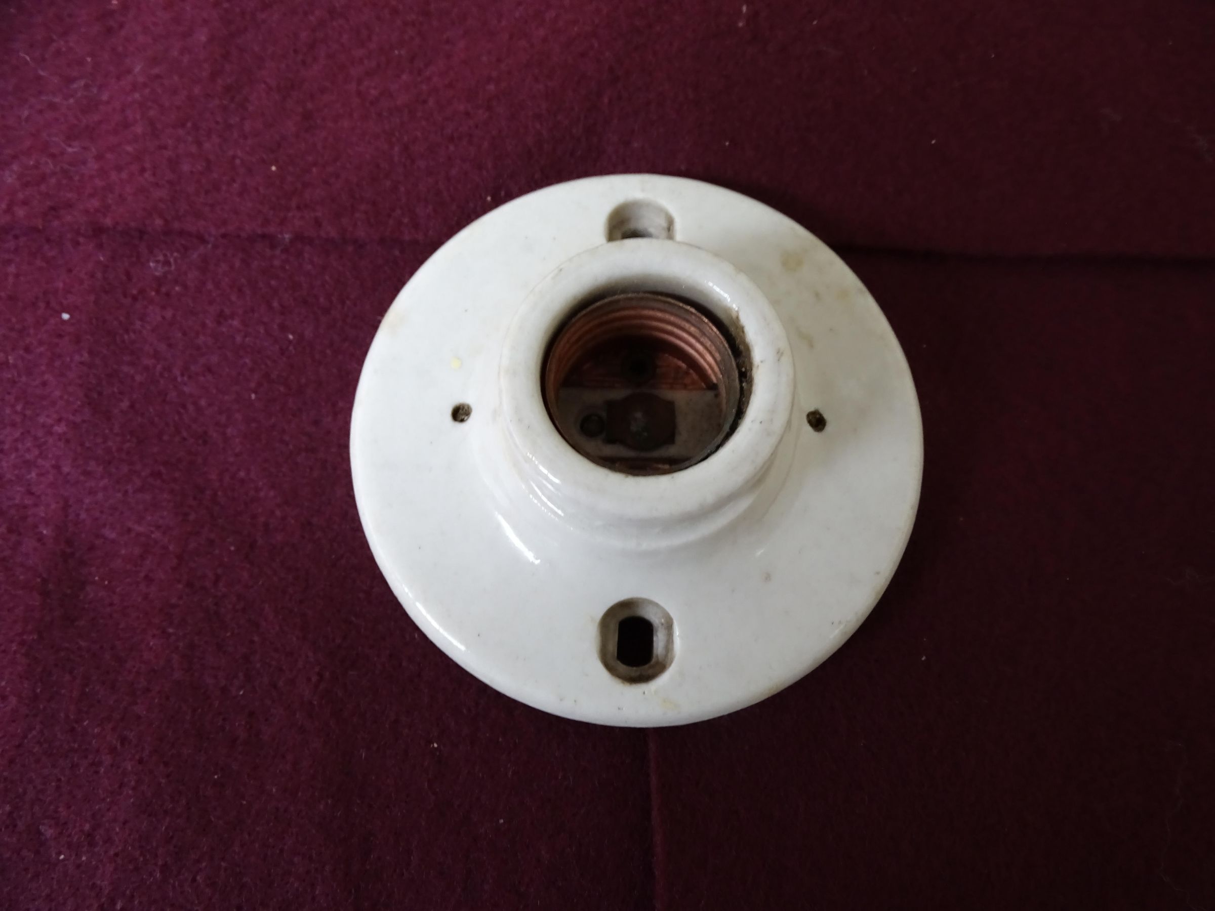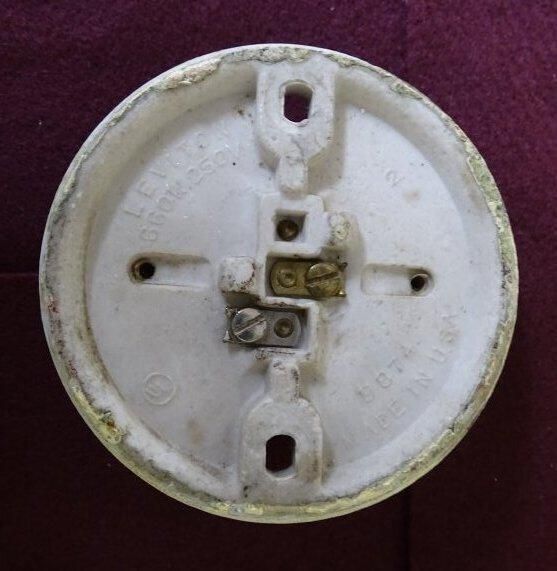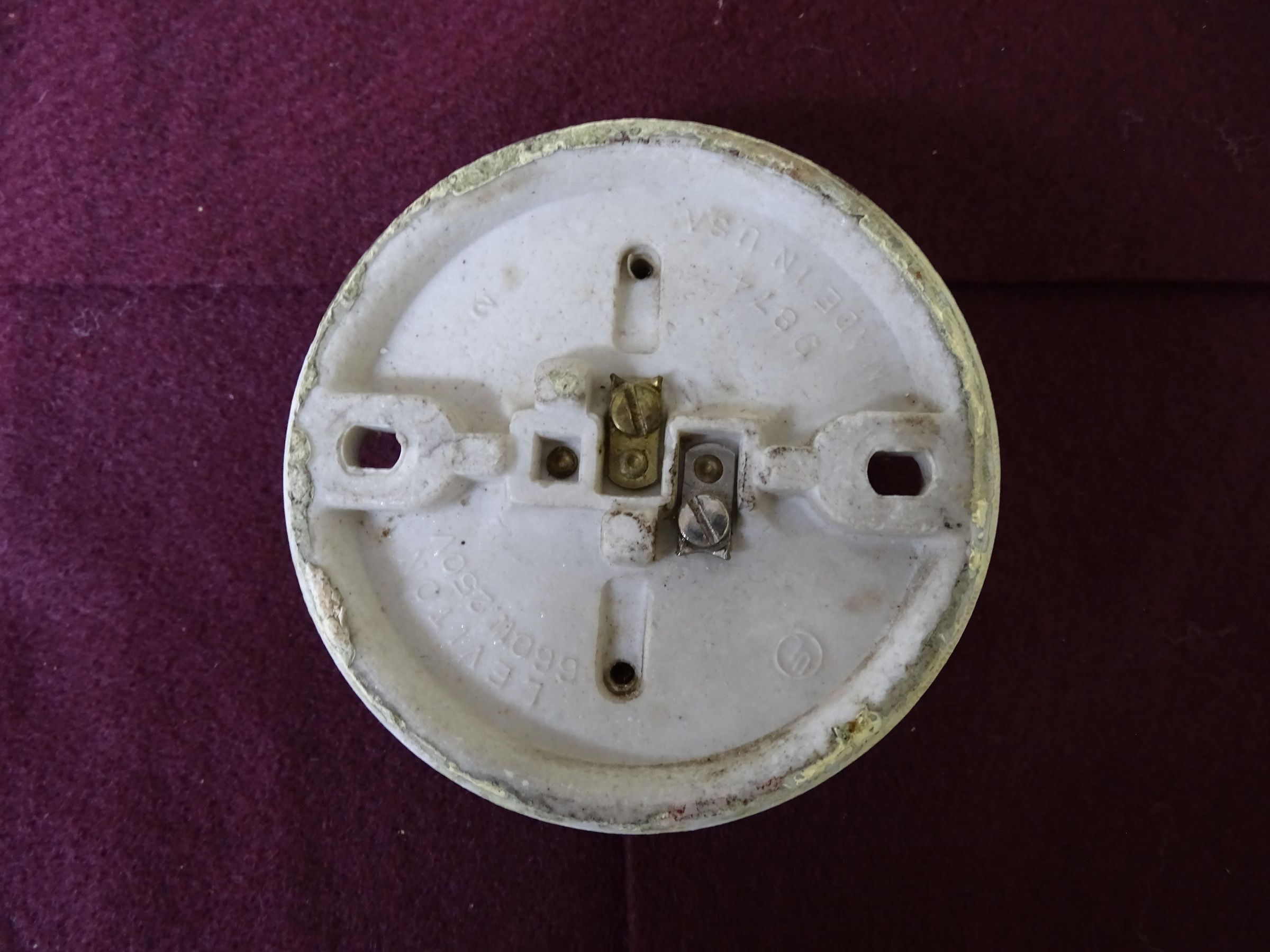 Leviton 9874 Medium Base One-Piece Glazed Porcelain fixture to hold an incandescent light bulb. The fixture is molded in a circular shape with an opening in the center with brass screw threads to accept the base of a light bulb. There are two holes for screws to fasten the fixture to an electrical box. On the back is molded "Leviton 660w.250v", "UL" in a circle, "2", "9874", and "Made in U.S.A.Lexicon