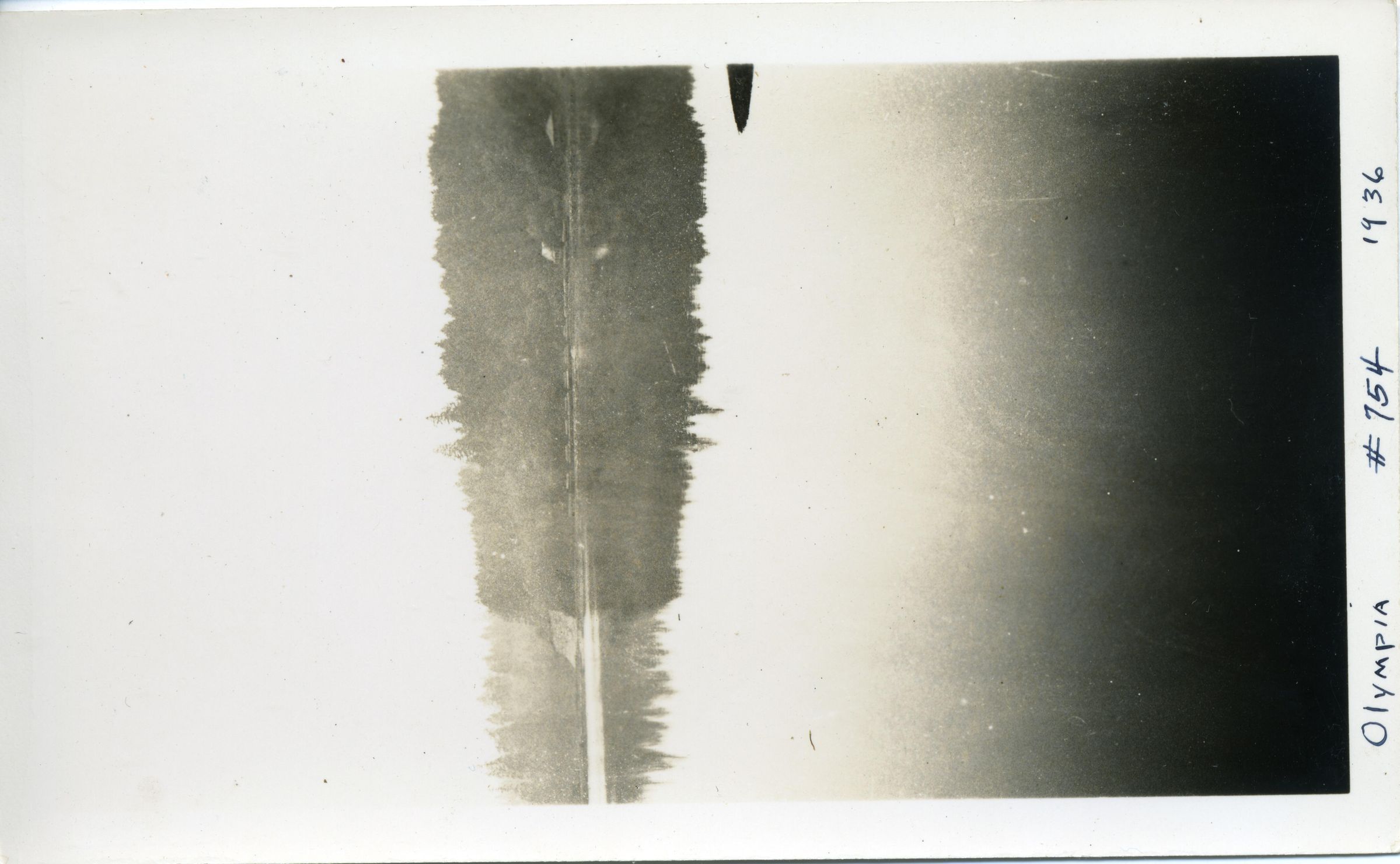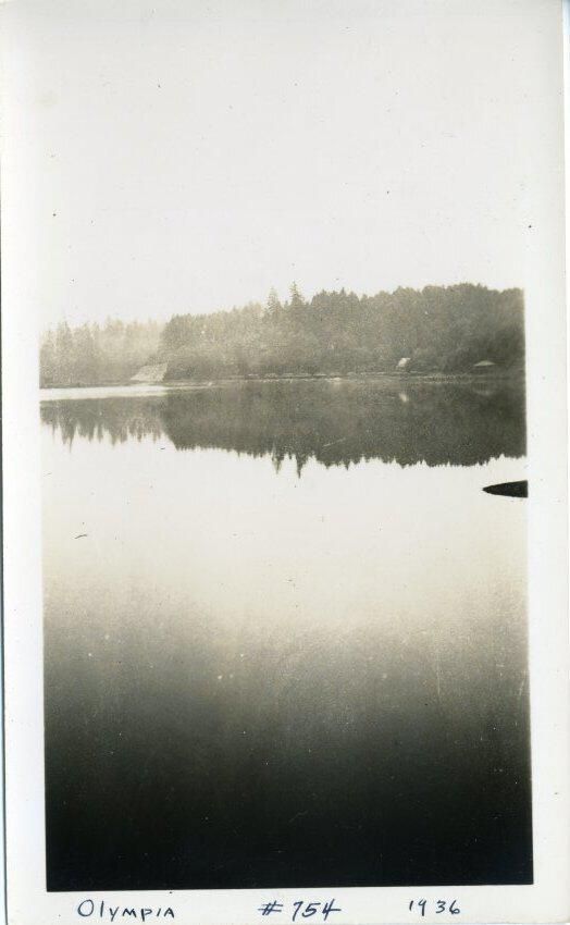 Black and white photo of Budd Bay. There is water in the foreground and in the center is a bluff with trees that are reflected in the water. There is a white border on all sides, and in the bottom border is "Olympia #754 1936". On the back is "443".