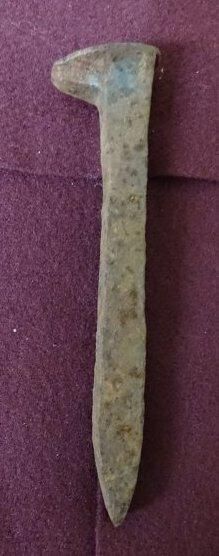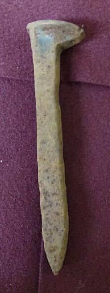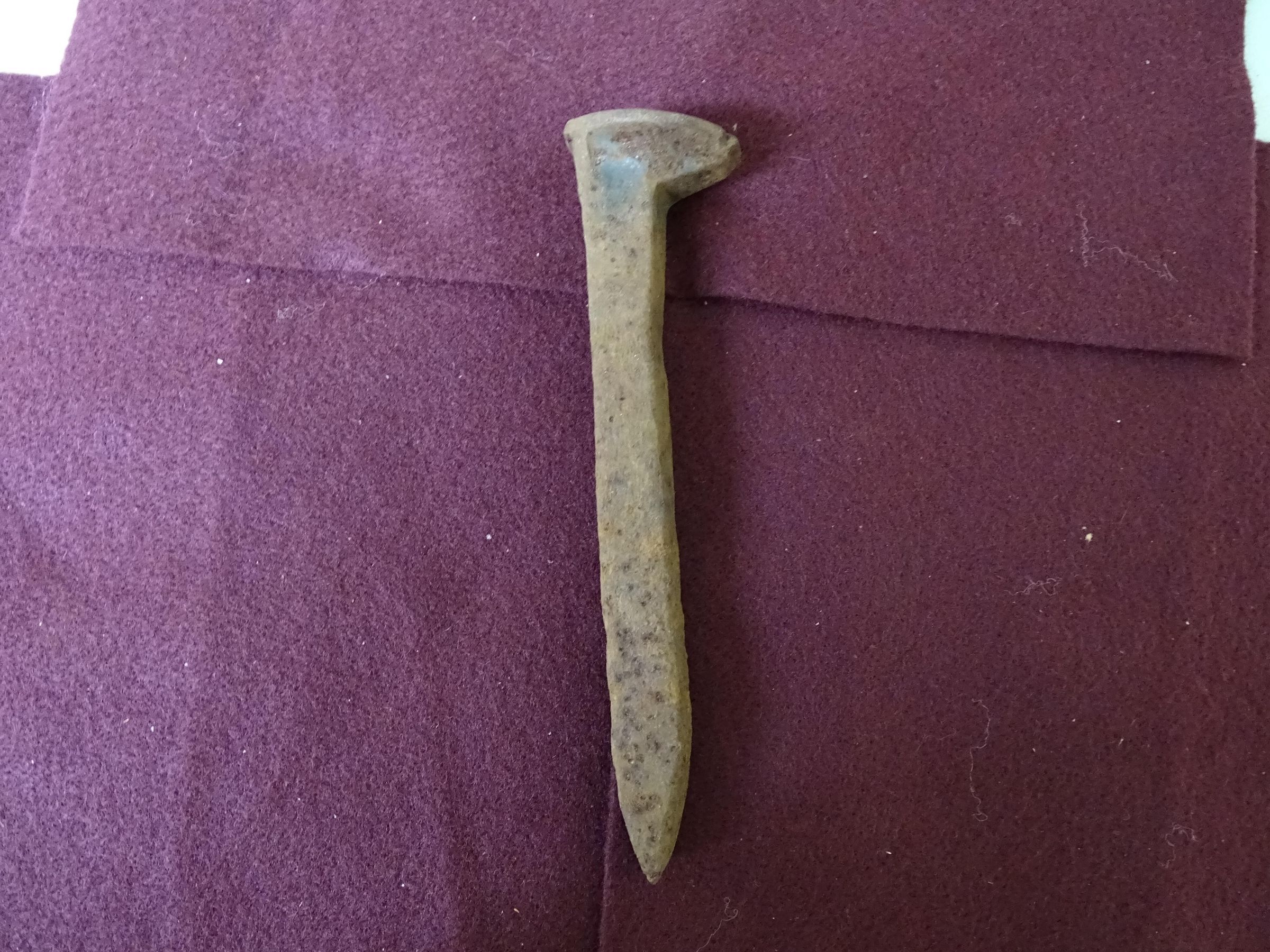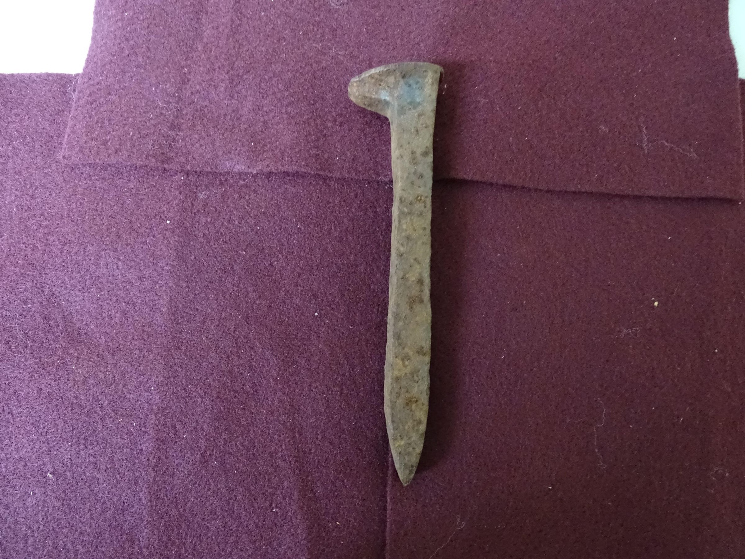 Metal rail spike (also known as a cut spike or crampon), shaped like a large nail with an offset head, that was used to secure rails and base plates to railroad ties.Made/Created