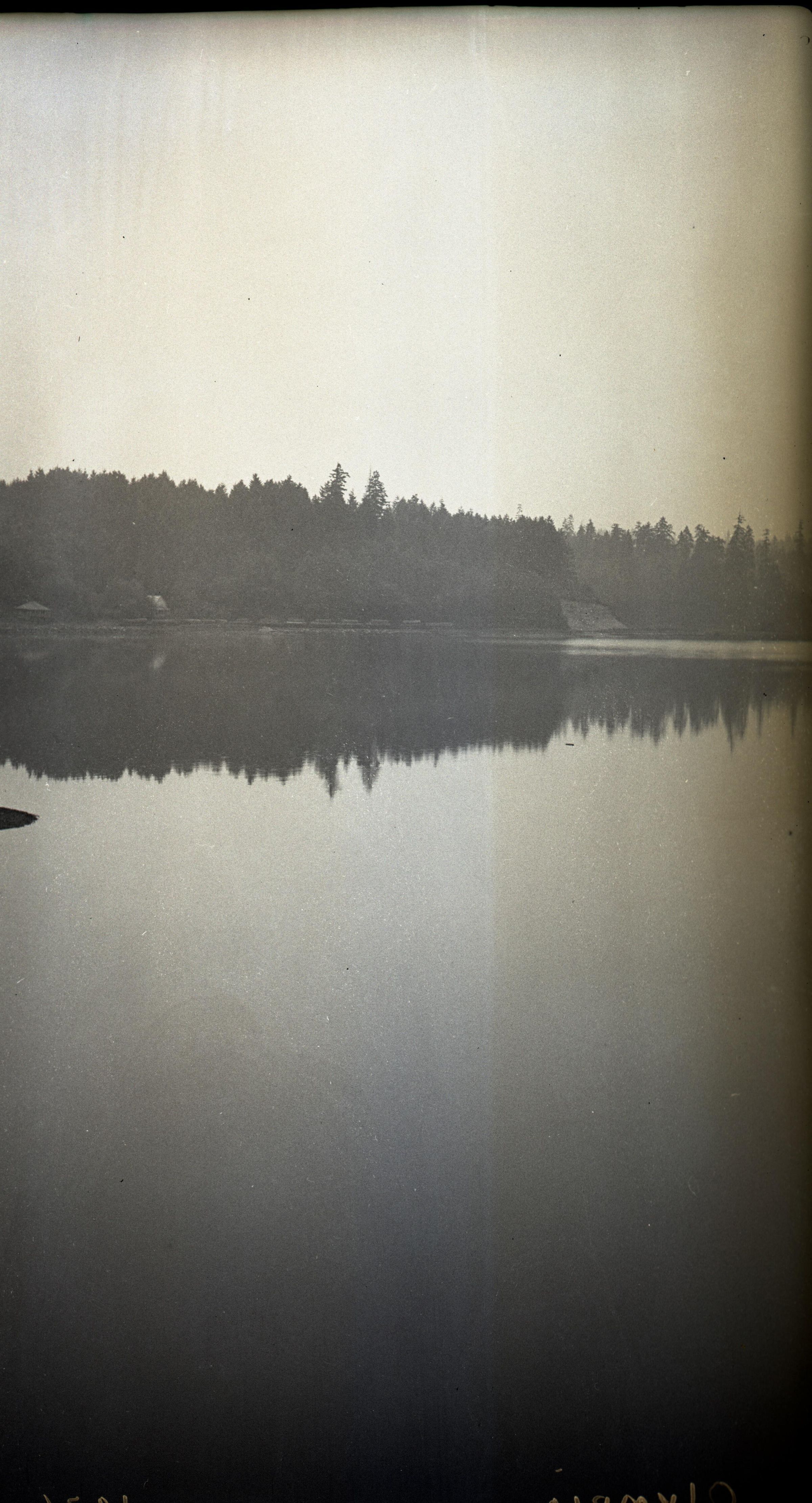 Black and white negative of Budd Bay. There is water in the foreground and in the center is a bluff with trees that are reflected in the water. There is a white border on all sides, and in the bottom border is "Olympia #754 1936". On the back is "443".