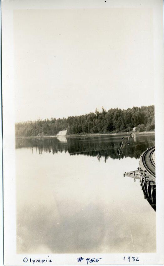 Black and white photo of the western side of Budd Bay. There is water in the foreground and in the center is a bluff with trees and objects at the shoreline. The trees and objects are reflected in the water. At the right side is part of a railroad track on pilings. There is a white border on all sides, and in the bottom border is "Olympia #755 1936". On the back is "443".