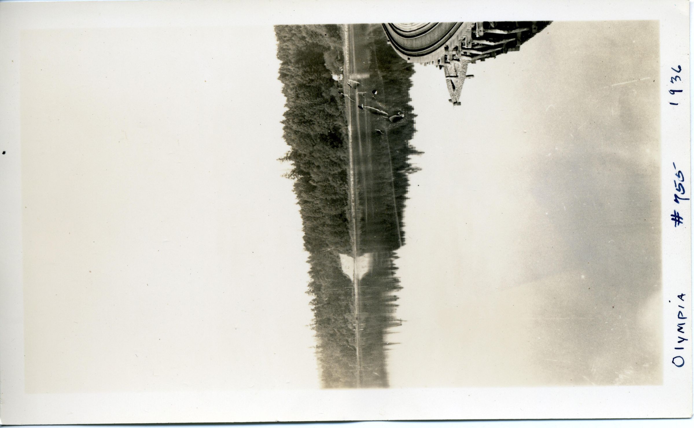 The photo is inserted along with a negative of the image into a cream colored envelope that has typed "Olympia 1936 Reflection of western bank from bridge". Stamped is "755" and "indexed".Made/Created