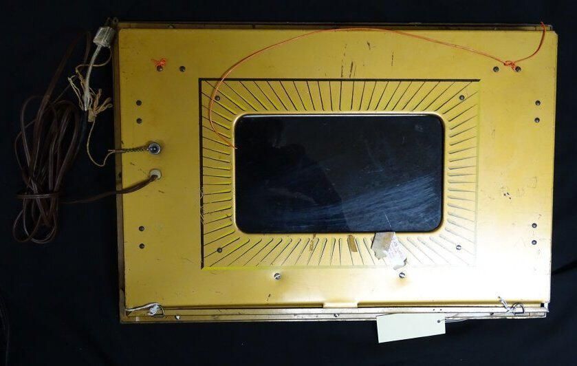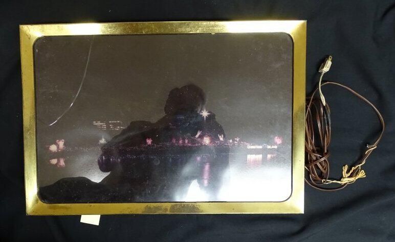 Vintage electrical sign that probably originally advertised Hamms Beer, but a photo of Christmas Island outdoor display has been substituted for the beer image. The sign's front consists of a brass-colored metal frame within which is a glass lens through which the Christmas image is visible. The glass in the upper left quadrant is cracked. Projecting at the rear and inset .75" is a housing that contains the light source, and is mounted with machine screws. On the back of the housing is an opening with a glass lens surrounded by a painted yellow design. Also on the back is an on-off switch with a string attached, an electrical cord with a standard plug, and a paper sticker (partially removed) stating "Olympia Glass Company, Phone 352-0555, 717 E. Legion Way, Olympia, Wa 98501". On the top of the inset portion of the housing are three decals that read as follows (1) "Underwriters Laboratories Inc.. Inspected, Electric sign, Form 1, B 411014", (2) "Price Brothers Inc, Chicago, New York" and a "PB" monogram in the center, (3) "Property of Theo Hamm Brewing Co, St. Paul, Minnesota [unreadable] Use on 110-120 volt 60 cycle A C only, 75 line volt amperes, To relamp open back plate by removing 4 blue screws". An orange-colored wire has been attached to the back apparently for hanging.Made/Created