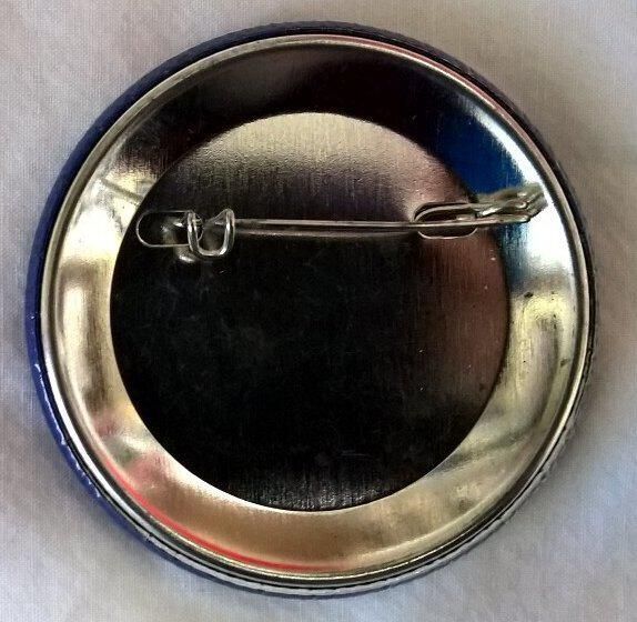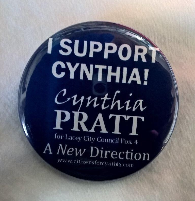 "I Support Cynthia!" political button. Silver-colored round 2 1/4" metal button has a blue plastic-covered front. The message reads: "I Support Cynthia! Cynthia Pratt for Lacey City Council Pos. 4 A New Direction www.citizensforcynthia.com." There are several fonts and font sizes used. The dark blue background has a lighter colored vertical stripe near the left. There is a metal pin closure on the back.