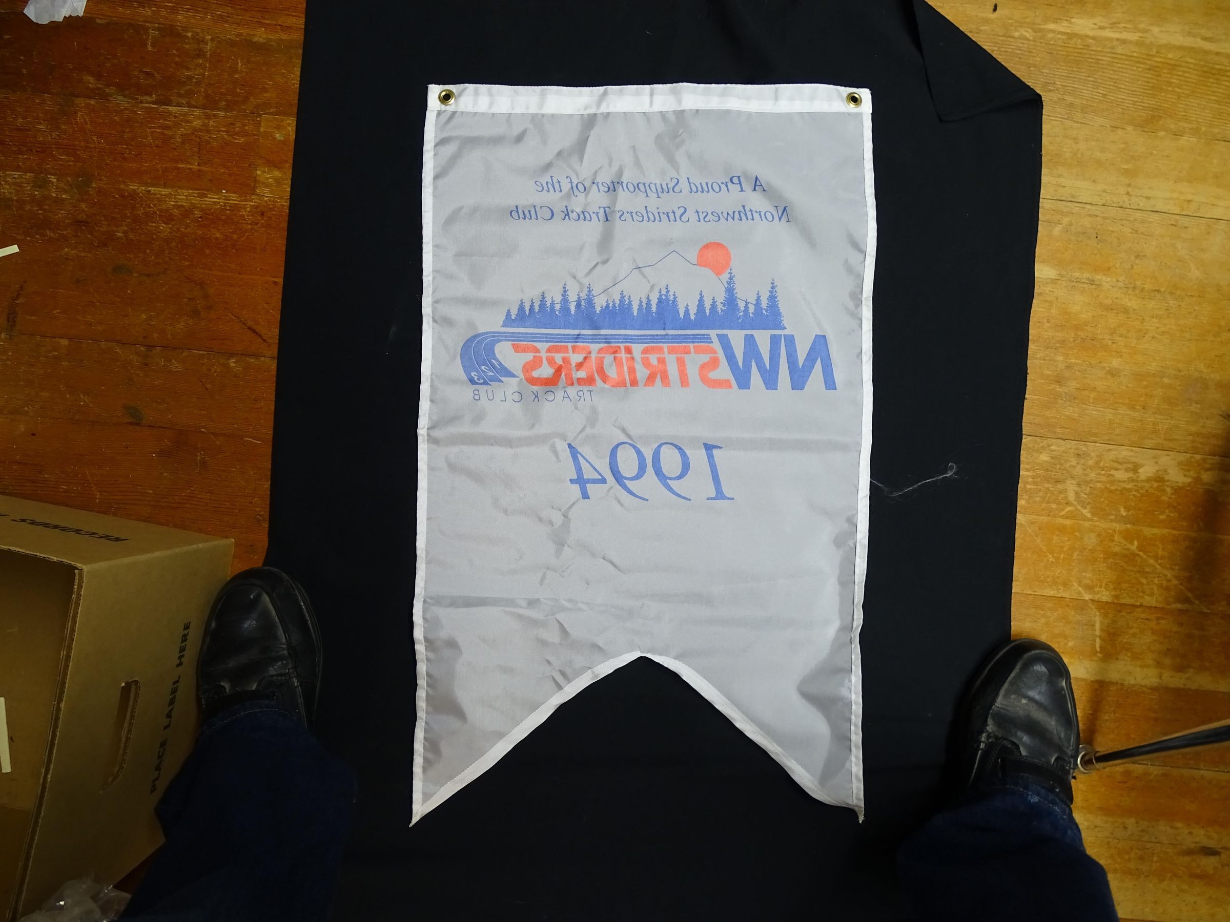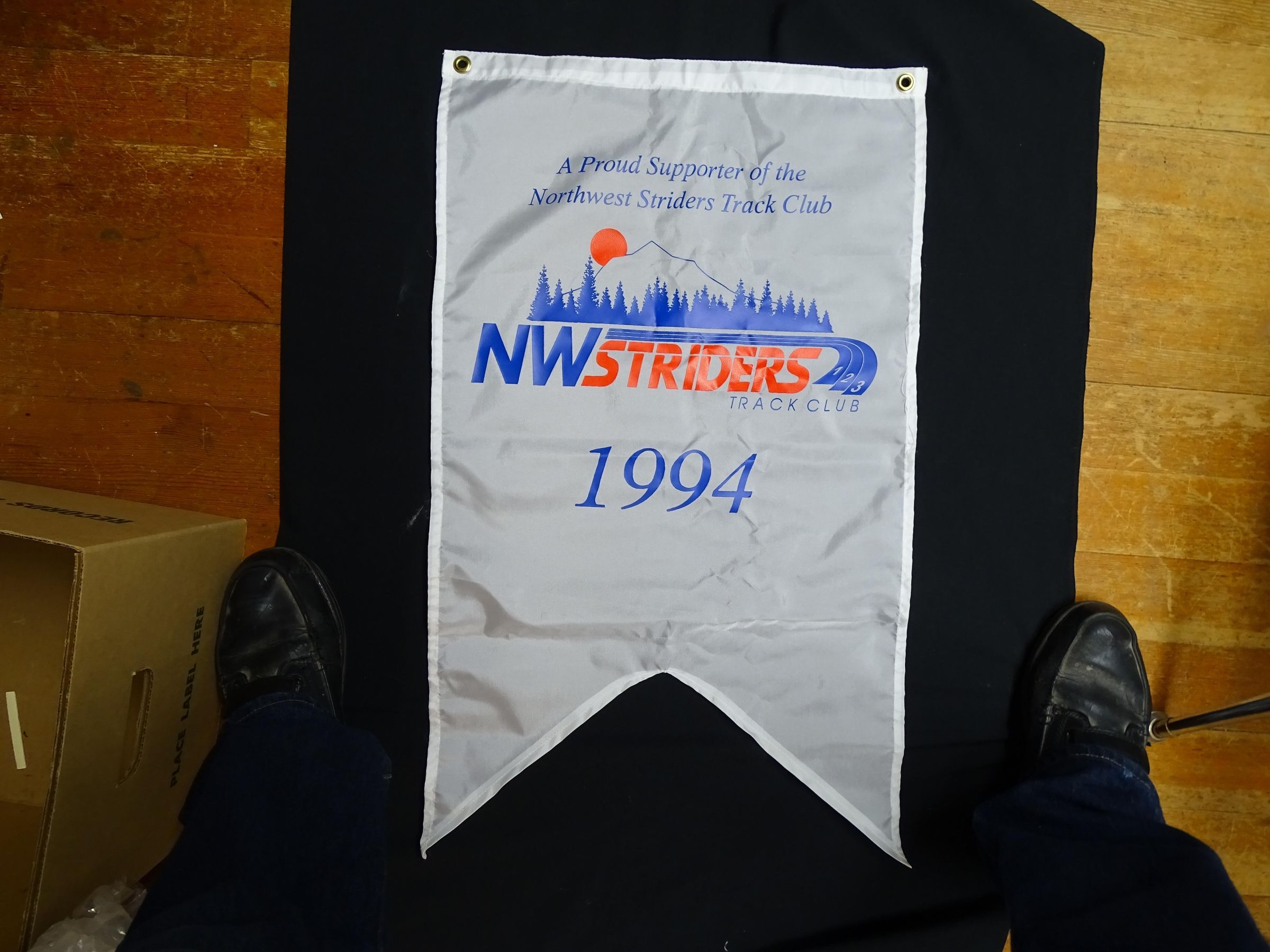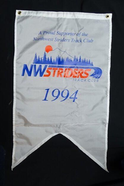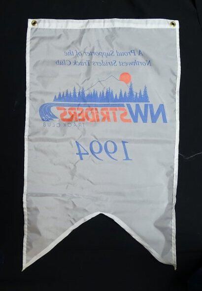 Cloth sponsorship banner for NW Striders Track Club. The banner is rectangular except the bottom is pointed on each side. The edges are hemmed. Printed on the banner in blue and orange ink is a stylized image of a mountain with the sun behind and trees in front and running tracks numbered 1, 2, and 3. Also printed is "A proud Supporter of the Northwest Striders Track Club", "NW Striders Track Club", and "1994". There are brass grommets at the top corners for hanging.Dimensions