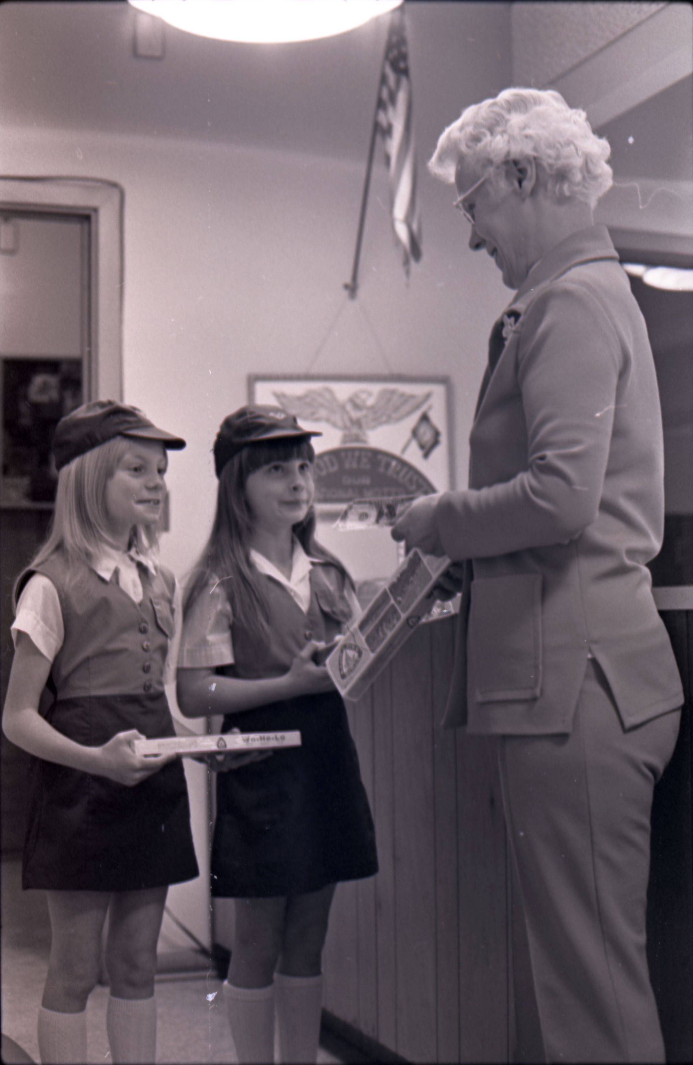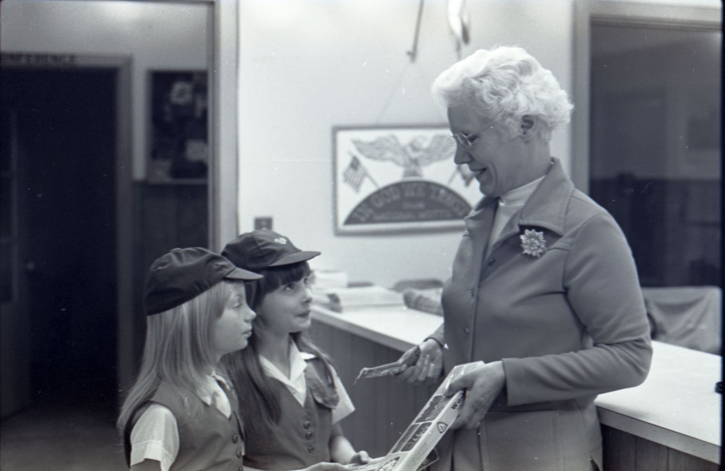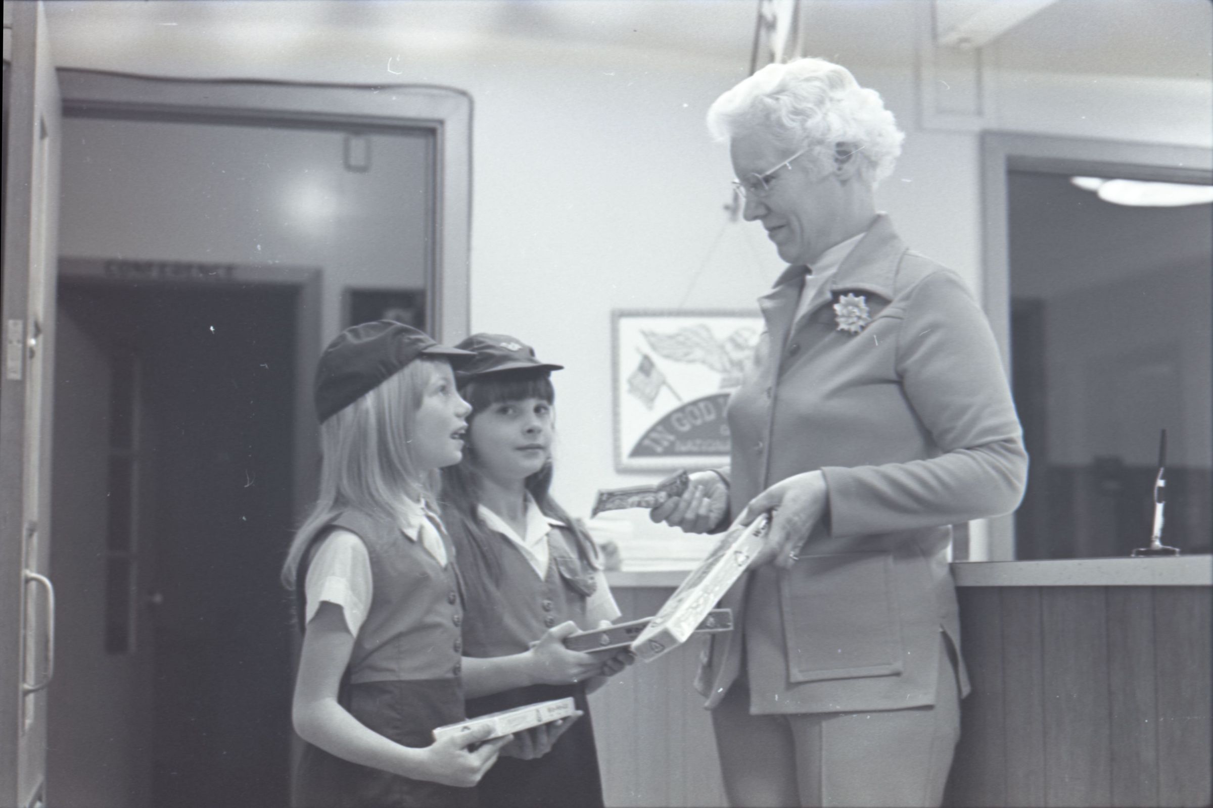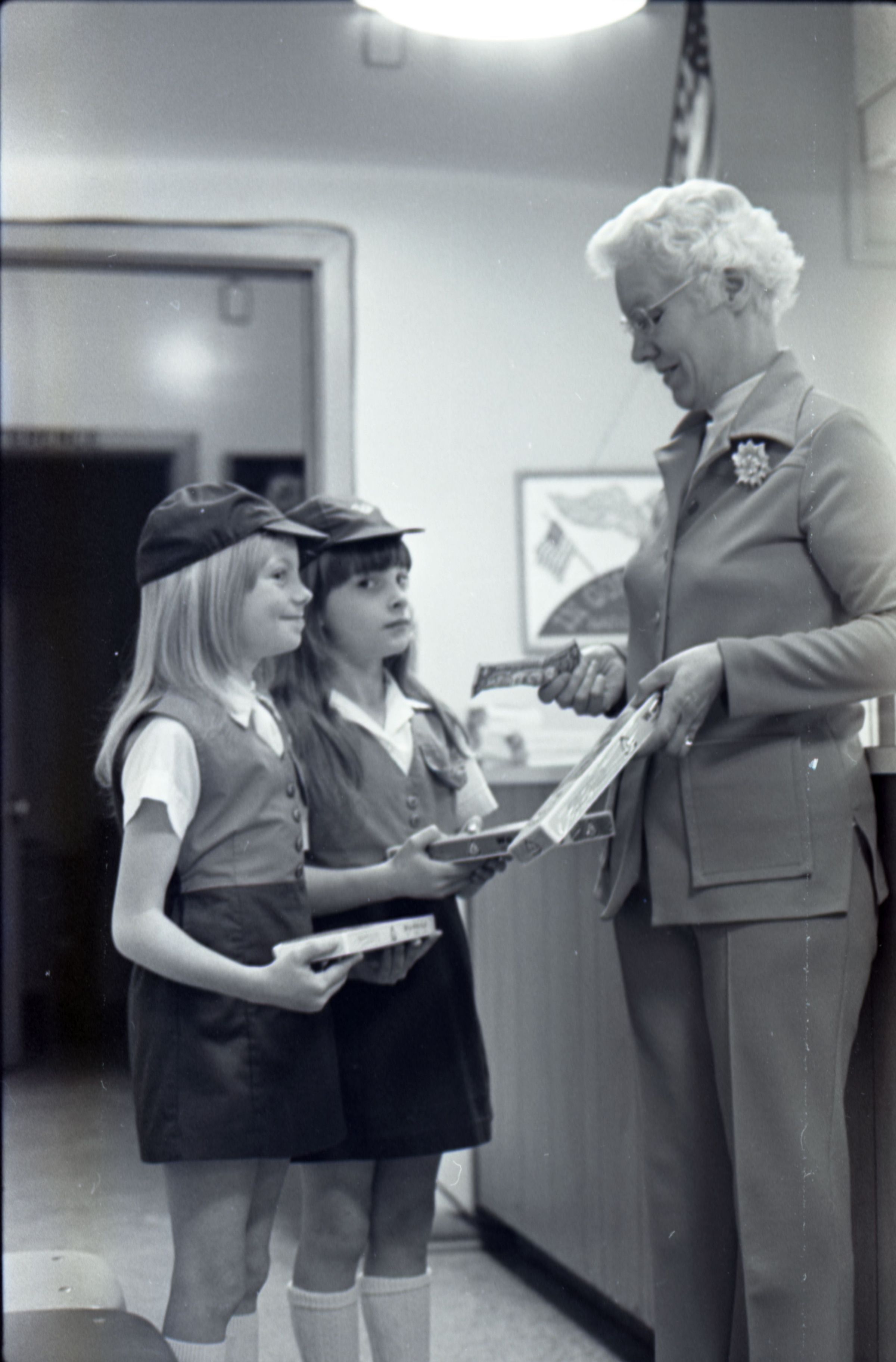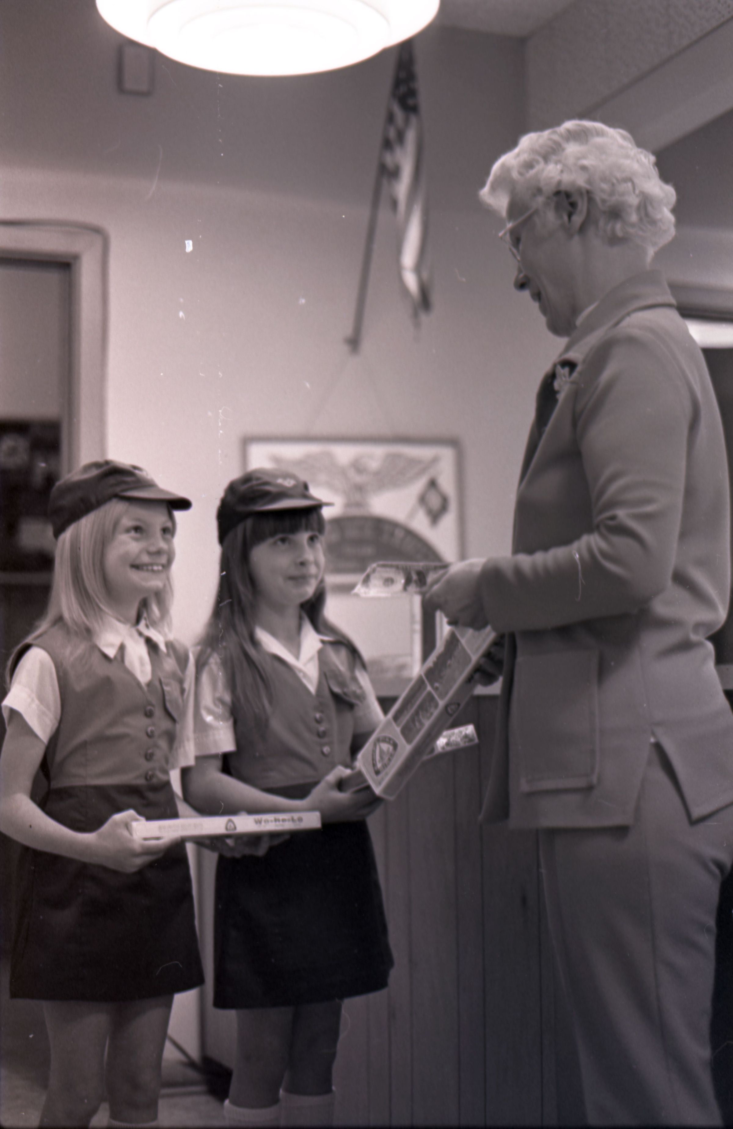 The images of Dorothy Gregory buying candy from Girl Scouts were created for inclusion with an article concerning a Girl Scout candy sale. ("CANDY PURCHASE," Lacey Leader, 1/28/1976)