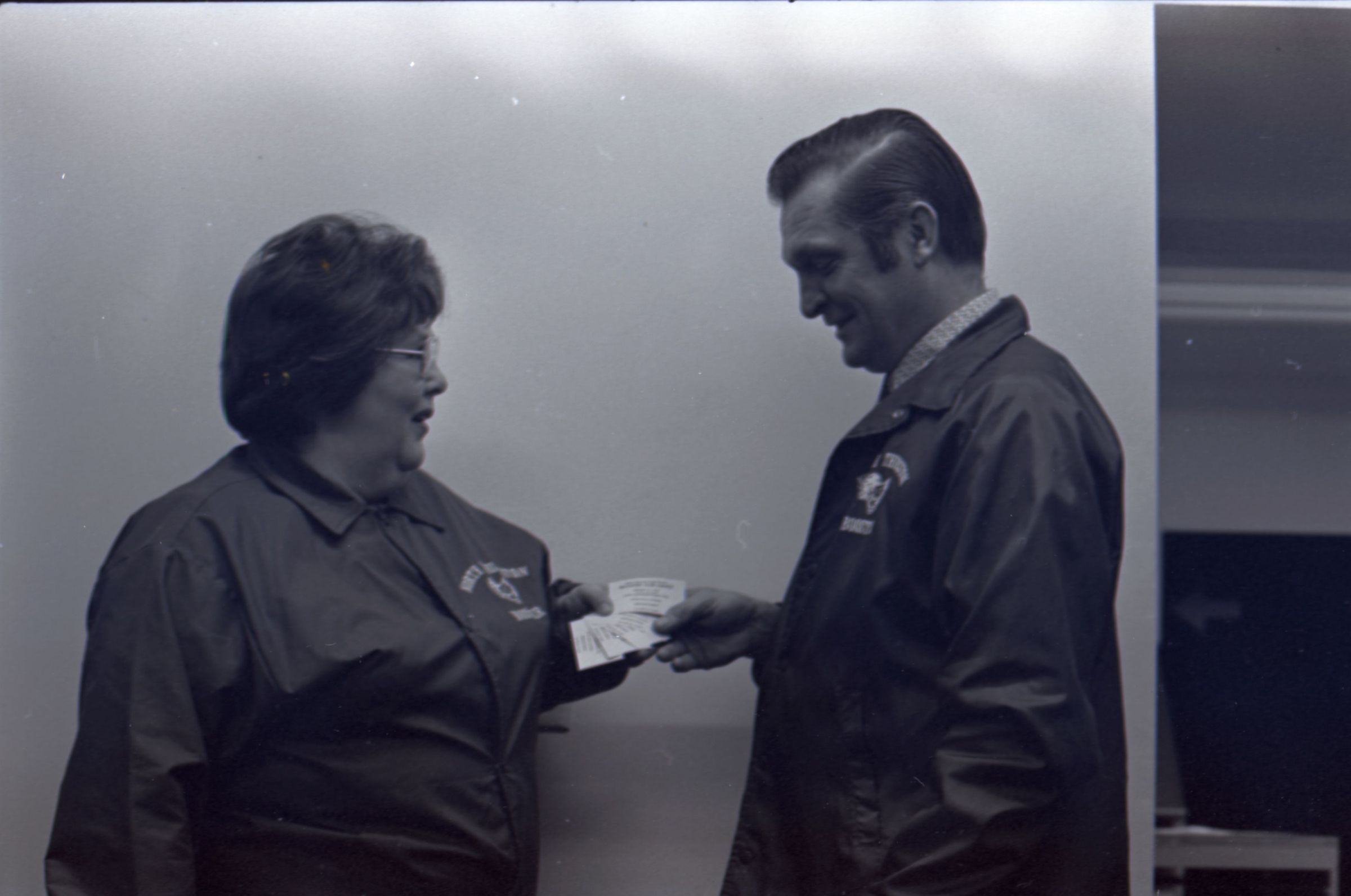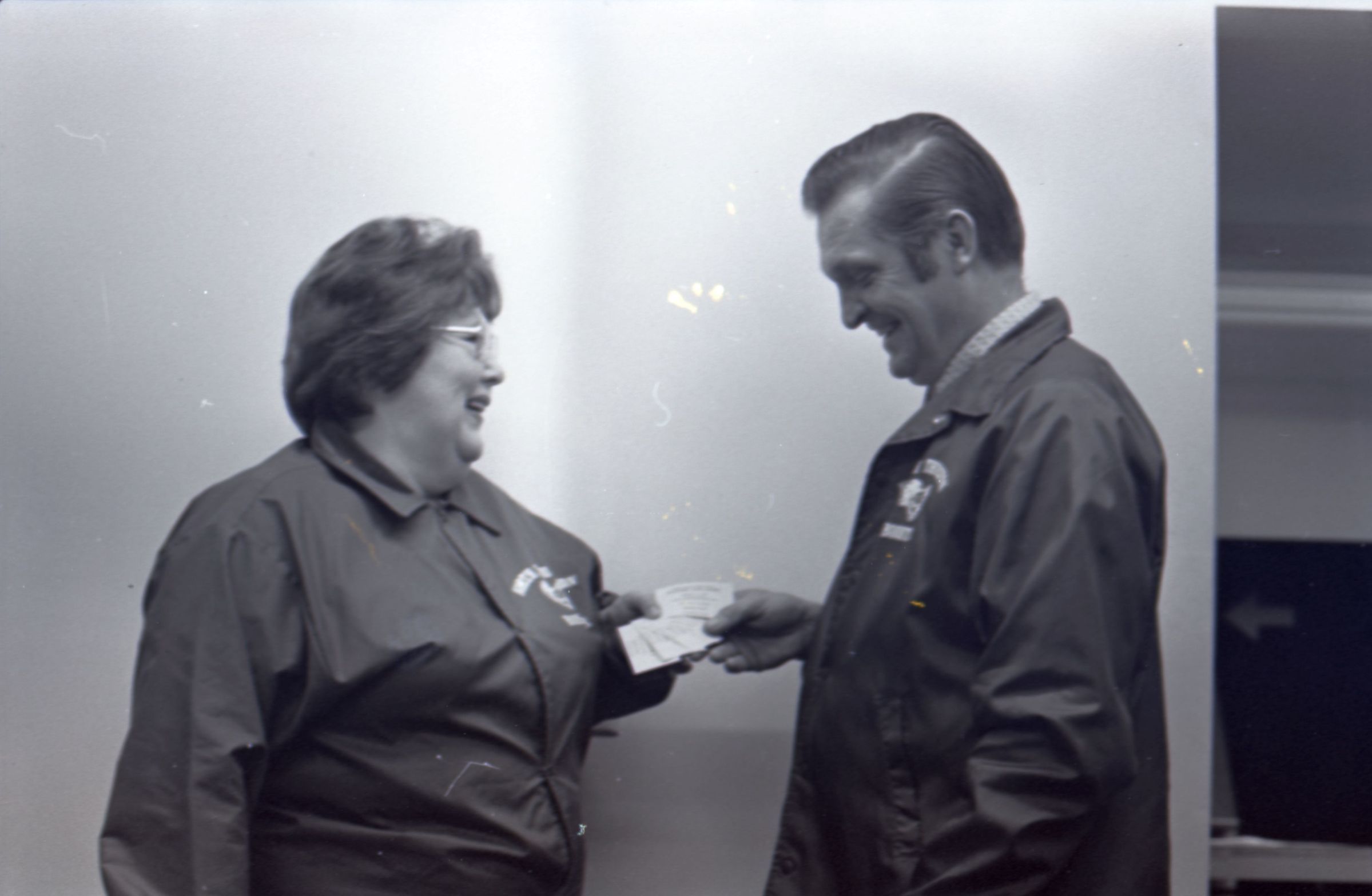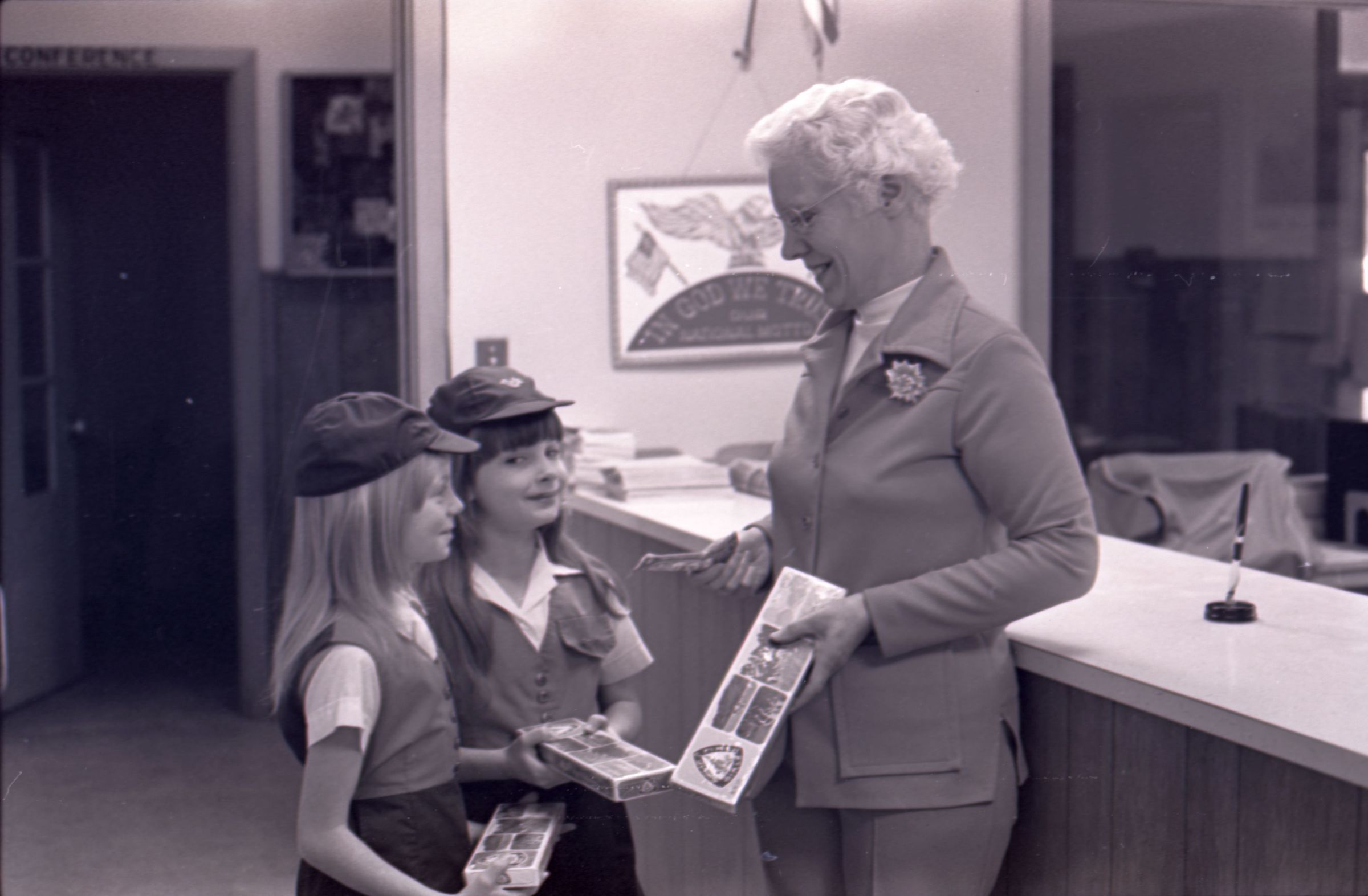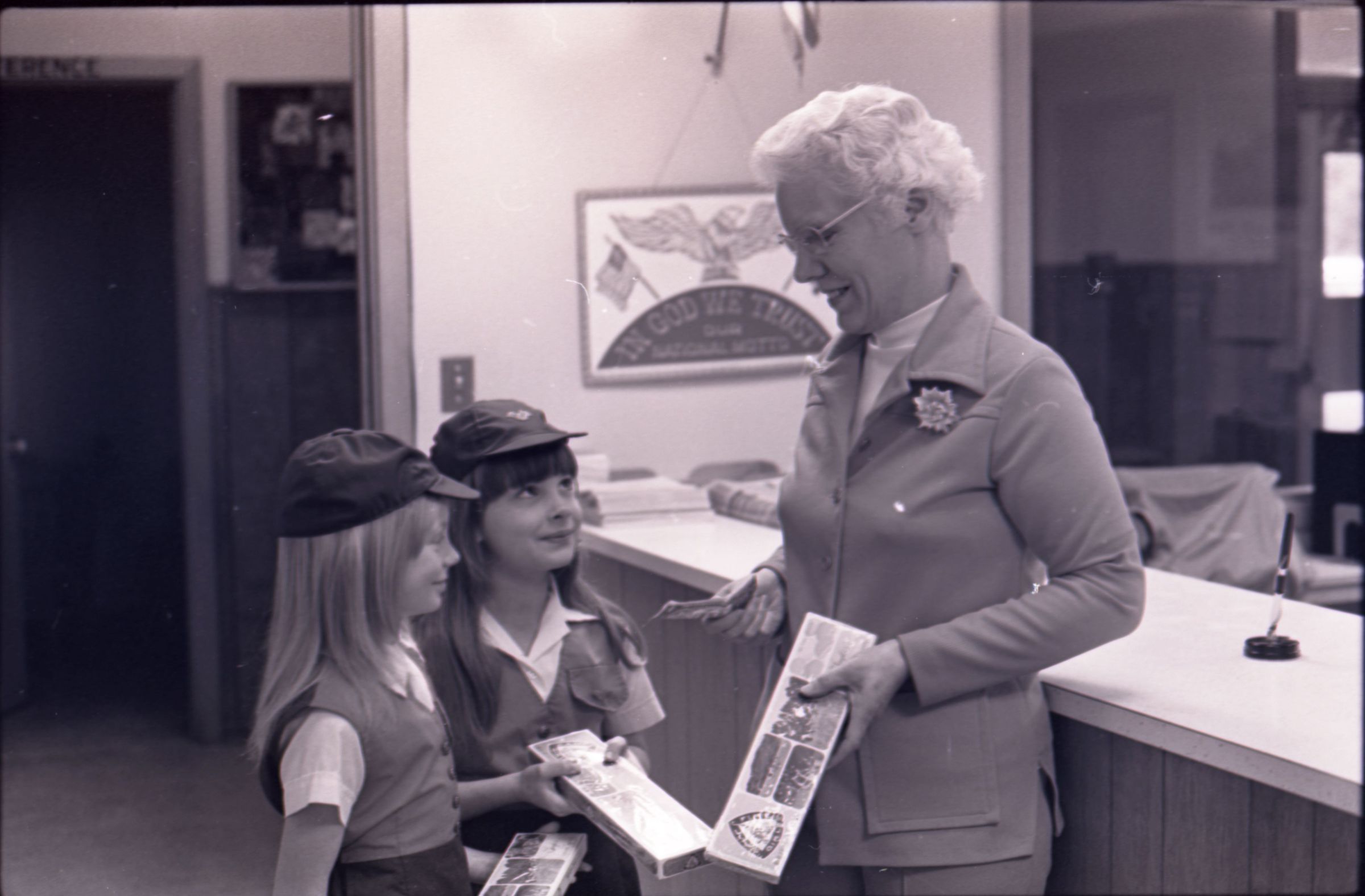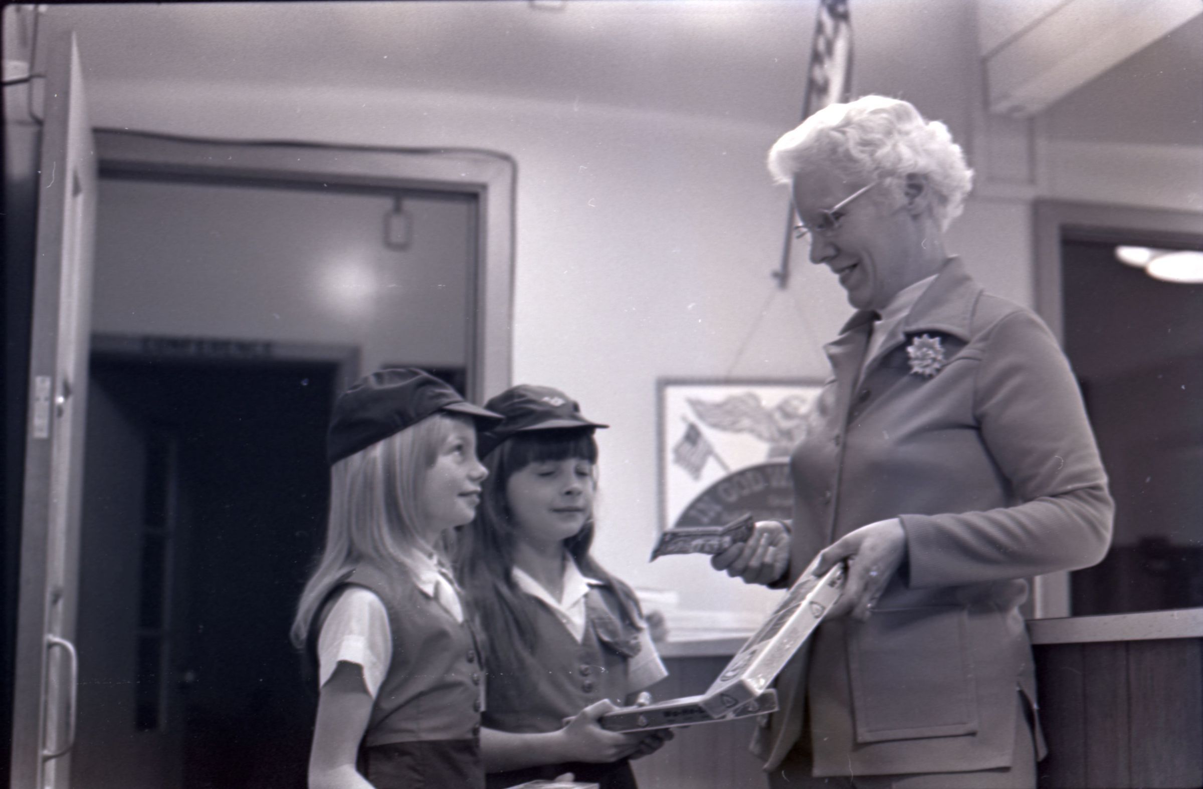 The images of Dorothy Gregory buying candy from Girl Scouts were created for inclusion with an article concerning a Girl Scout candy sale. ("CANDY PURCHASE," Lacey Leader, 1/28/1976)