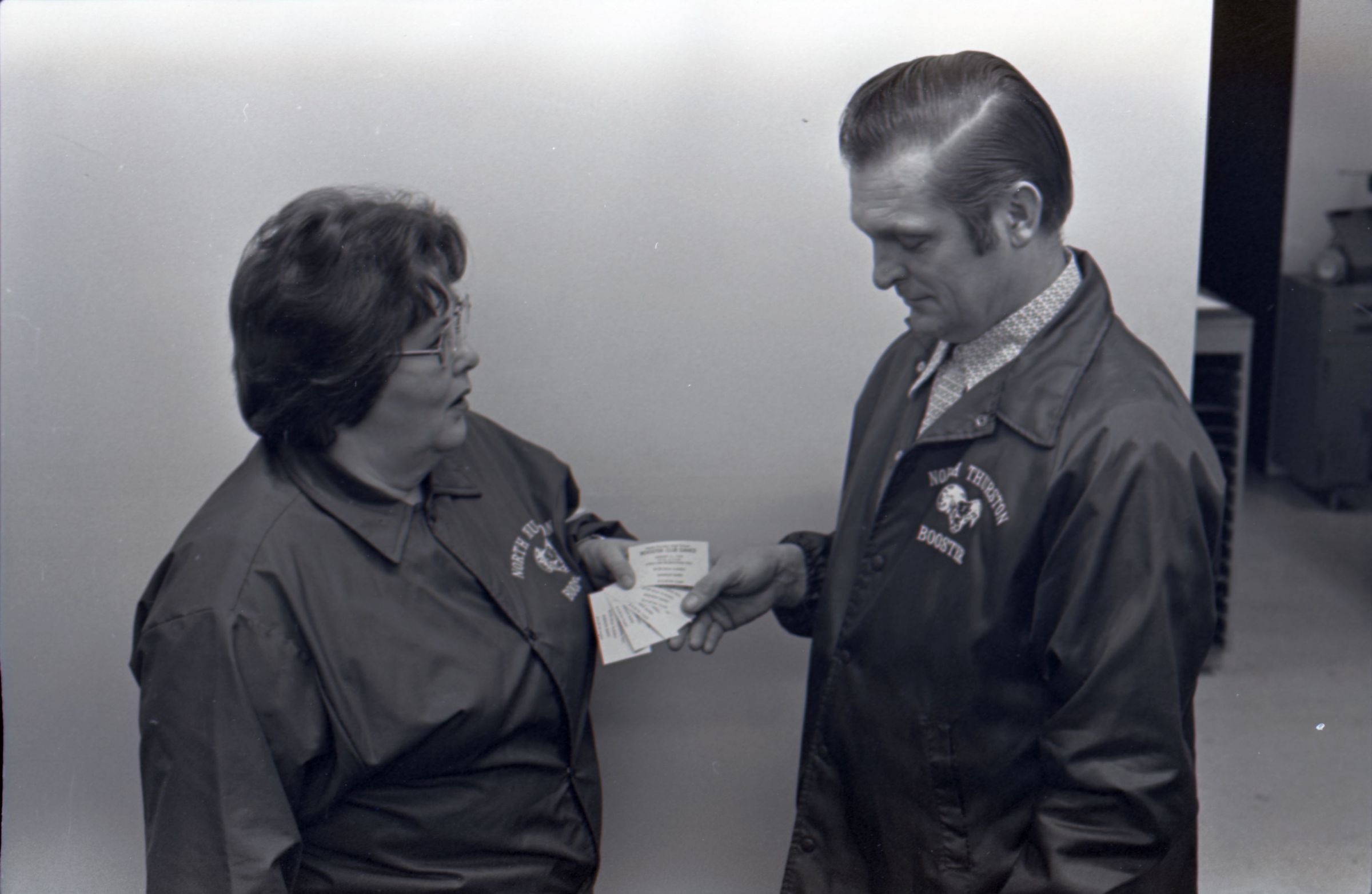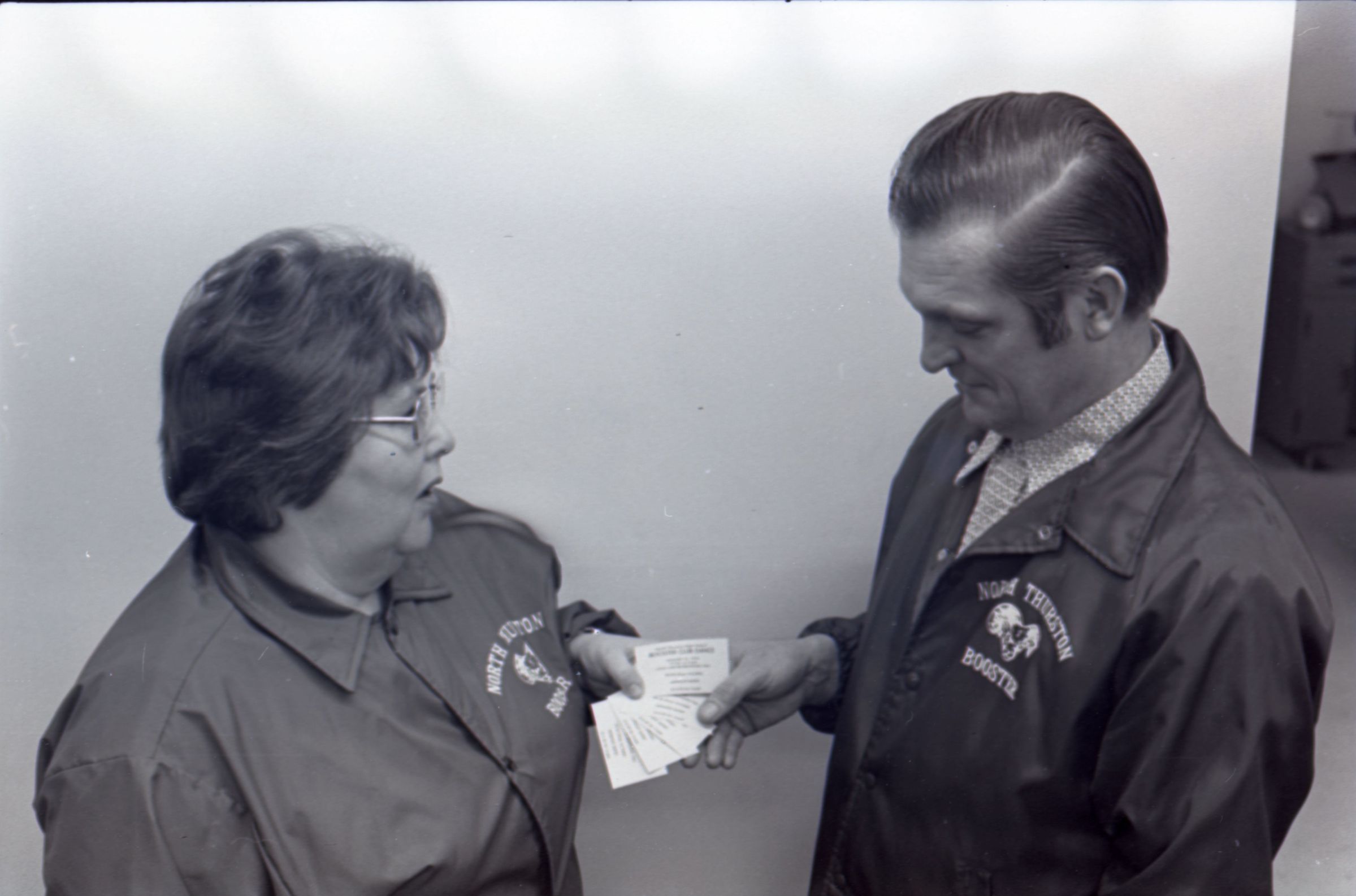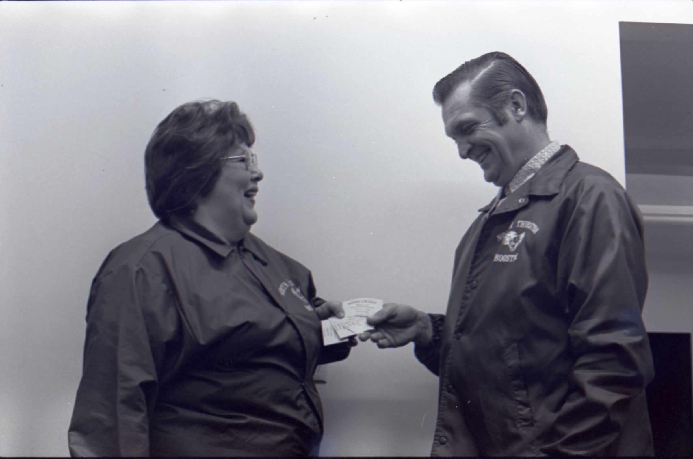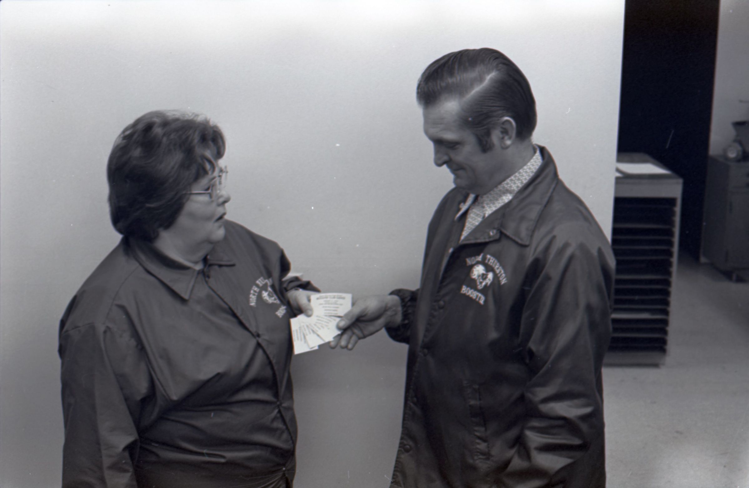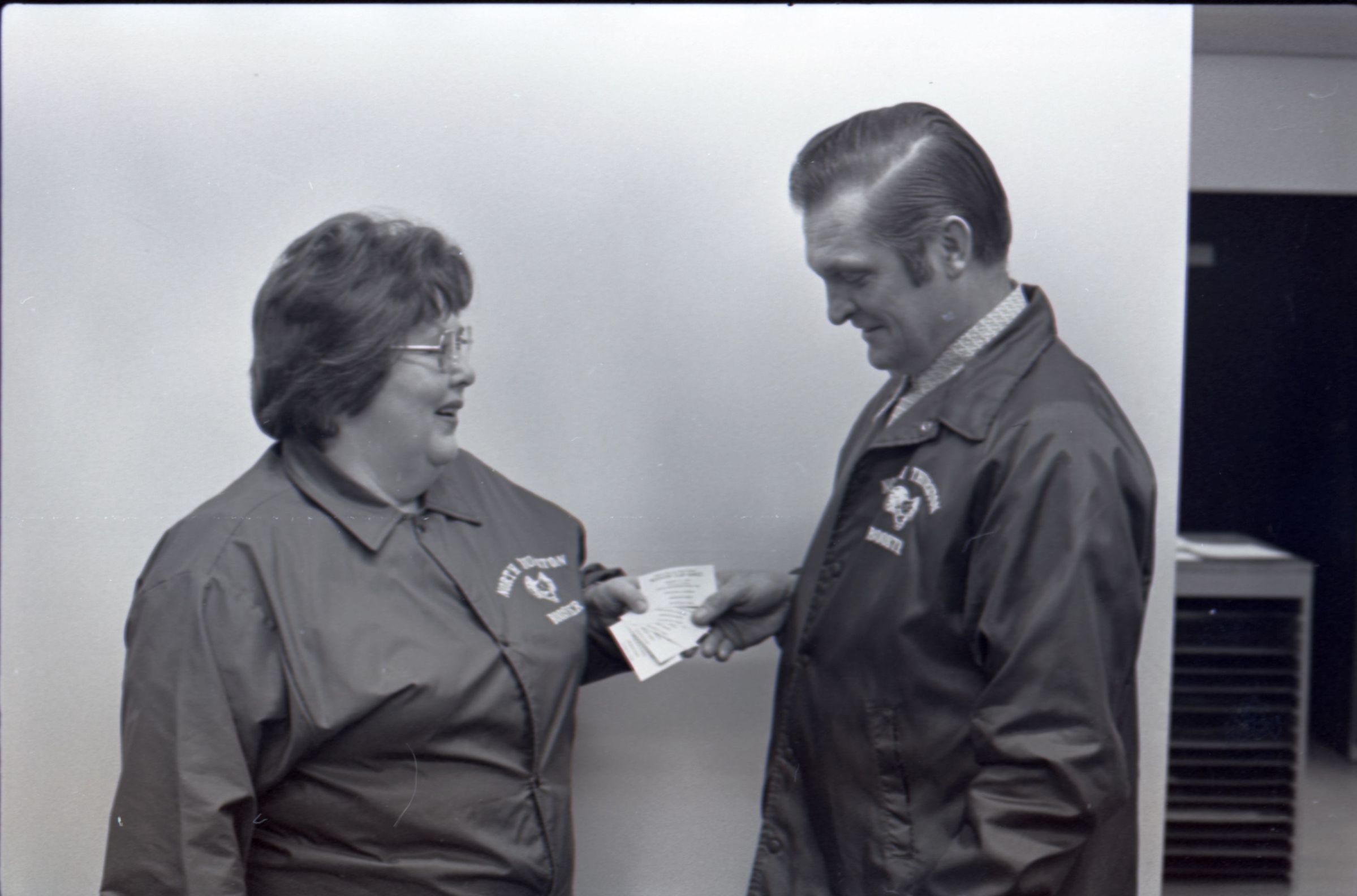 The images of Dorothy Gregory buying candy from Girl Scouts were created for inclusion with an article concerning a Girl Scout candy sale. ("CANDY PURCHASE," Lacey Leader, 1/28/1976)